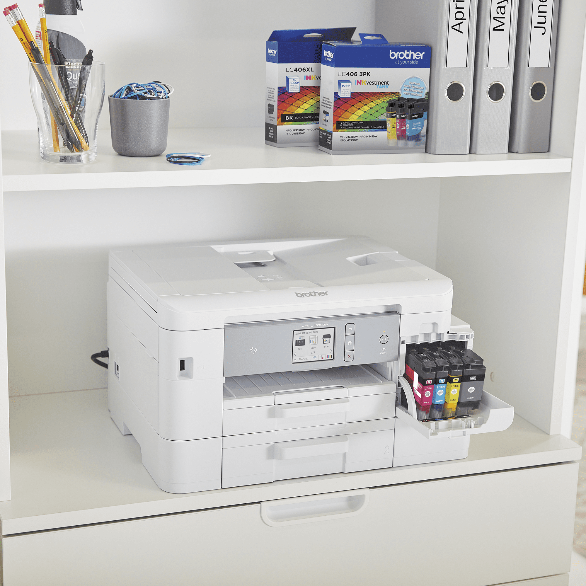 INKvest in a printer you won’t want to replace. INKvest in a printer you won’t want to replace with up to 1 year of ink in-box¹along with a host of features to simplify document management. Experience uninterrupted printing, exceptional savings, and super convenience with up to 1 year of ink, using only the 4 cartridges provided in-box.¹ Revolutionary INKvestment Tank Technology. The INKvestment Tank’s internal tank works with reengineered INKvestment Tank ink cartridges to eliminate manual refilling. This helps to deliver more pages of convenient, worry-free printing without sacrificing the compact, desktop size. Brother INKvestment Tank front-loading ink cartridges. The easy-to-use, front-loading plug-in INKvestment Tank ink cartridges hold more ink than traditional cartridges to continually supply ink to the internal tank, so you get more pages without needing to refill. When refilling is needed, simply take out the empty cartridge, plug in a replacement, and get back to printing with no waiting and no mess. Put the power of printing at your fingertips. The simple-to-use free Brother Mobile Connect²App delivers easy onscreen menu navigation for printing, copying, scanning, and device management from your mobile device Generous 2.7” touchscreen. Easy-to-read, touchscreen enables you to navigate to powerful features plus print-from and scan-to popular cloud services including Google Drive™, Dropbox, Box, OneDrive, and more⁶ directly from the printer Large page yields mean less ink replacement. When you do need to replace your ink supply, choose Brother Genuine Standard Yield for up to 3,000 BK/1,500 CL pages or High-Yield for up to 6,000 BK/5,000 CL pages⁵ per replacement INKvestment Tank cartridge for even more convenience and uninterrupted printing. Simple to connect your way. Versatile connection options include built-in wireless,³Wi-Fi Direct®, Ethernet or connect locally to a single computer via a USB interface. The NFC (Near Field Communication)⁷ feature simplifies direct printing from a cell phone or other mobile device. Works with Alexa; add voice control by combining with an Alexa device. Print with confidence using Page Gauge.⁴ Help take the guesswork out of when to replace ink by using Page Gauge, a visual, numerical way to know the amount of ink you’ve used and the amount of ink you have remaining.⁴ Check ink levels directly from the printer LCD touchscreen or use the free Brother Mobile Connect³ App to check from virtually anywhere using your mobile device. Versatile paper handling with up to 400-sheet capacity. Featuring two adjustable paper trays that can handle letter or legal-size paper with a total capacity of 400 sheets. Also features an up to 20-sheet automatic document feeder and a bypass tray for alternative media and automatic duplex (2-sided) printing to help save paper. 1. Based on average monthly print volumes of approximately 150 pages at 60% black pages/40% color pages in accordance with ISO/IEC 24711 using 4 cartridges provided in-box. For additional page yield information see . 2. Requires connection to a wireless network. Brother Mobile Connect free app download is not available in all countries. 3. Requires connection to a wireless network. 4. Page Gauge is an estimate for informational purposes only. For actual cartridge yield information refer to . 5. All page yields are approximate and are calculated in accordance with ISO/IEC 24711. LC406BK page yield is 3,000 pages; LC406 C/M/Y page yield is 1,500 pages per cartridge. LC406XLBK page yield is 6,000 pages; LC406XL C/M/Y is 5,000 pages per cartridge. For additional page yield information, see . 6. Requires internet connection and account with desired service. 7. The mobile device must have NFC capability and run Android OS 4.4 or later.