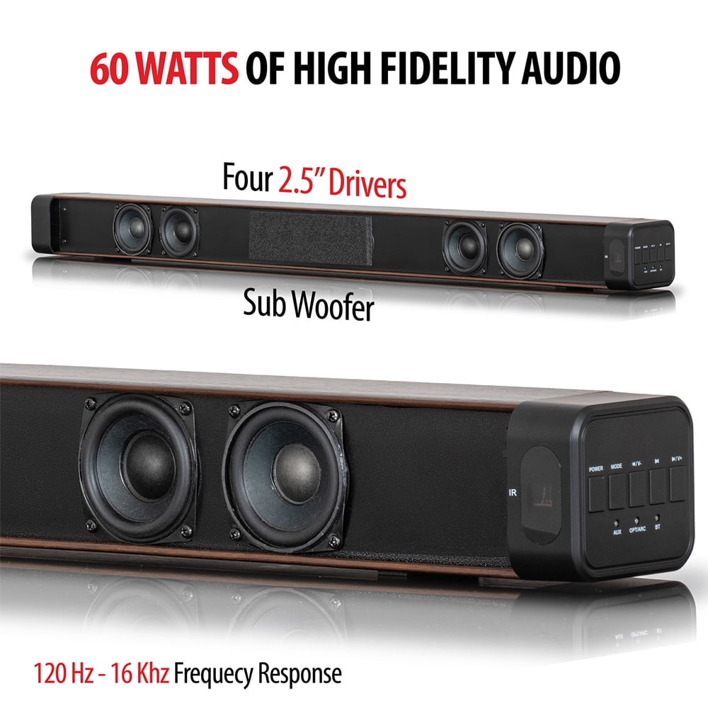 CRTDGSB200WOD Enjoy a high-fidelity sound experience that takes any television to the next level! The Deco Home 60W Multi-Input Soundbar with Built-in Dual Subwoofers and Four 2.5 Drivers is a premium device to pair with your television. Use a number of methods to connect to your TV or stream audio from your phone or other portable devices wirelessly – this soundbar packs a punch and is an audio upgrade for your living room at the right price.With two separate 30-watt woofers built-in, enjoy quality booming base that brings your favorite TV shows, movies, and music to life. Additionally, this soundbar is outfitted with four 2.5 drivers that bring a complete spectrum of audio enhancement.Connect your television using Optical or HDMI ARC inputs. Have a device with a headphone jack? This soundbar can bring your favorite legacy players back to life and put a new spin on their sound with its AUX cable input. Control your soundbar from the comfort of your couch with an included remote (batteries not included).A sleek wooden finish lends to a tasteful and contemporary style that fits with nearly any decor choice. Set up your soundbar on your entertainment center, in front of your TV on the shelf, or use the included wall-mounting accessories to get it elevated with your television.To make installation as painless as possible we include a bunch of accessories and adapters to help you improve your sound faster – included are a RCA to 1/4 Audio Aux cable, a 1/4 to 1/4 Audio Aux cable, Optical Cable, a HDMI to ARC adapter, and instruction manual.Are soundbars worth it?A soundbar, also known as a speakerbar, is a long and thin speaker system with multiple drivers that connect to your TV and improve sound. This is important because most modern TVs are thinner, which means less room for larger speakers and, oftentimes, the speakers don’t face the viewer. Without room to outfit new televisions with bigger speakers, many suffer from low-quality sound, poor bass, and a tin-can sounding effect.Many people merely put up with these lower quality sounds. Others don’t notice at all until it’s time to watch a movie with booming bass and those small speakers start crackling, taking you out of the moment. With a proper soundbar, viewers can enjoy an enhanced viewing and listening experience and hear the audio as it was meant to be heard. All without the need for expensive surround sound systems. SpecificationsOutput Power: 30W x 2 (THD = 10%)Frequency Response: 150 Hz ~ 18KHzDriver: 2.5” x 4S/N: ≥65dbPower Supply: DC 18V/3.5 AButton: POWER, V-, V+, P/PFunctionality: Aux Input, Optical Input, HDMI ARC Input, Wireless Connection, Remote ControlWireless IC & Version: BP1048B2MIC Handsfree Function: NoWireless Working Distance: 32.8 FT (10 M)Wireless Support: AVRCP 1.0, GAVDP 1.0, AVDTP 1.0, Profile 1.5, Headset Profile v1.1Product Dimensions (L x D x H): 37 in x 3.35 in x 2.91 inProduct Weight: 5.73 lb (2.6 kg)Remote uses 2 AAA Batteries (not included)