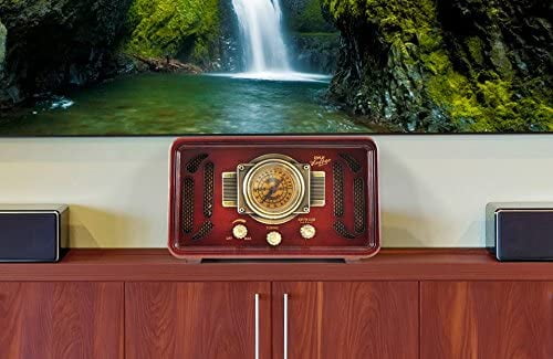 Classic-style radio USB & SD Card readers Compatible with MP3 & WMA audio files AM/FM radio with retro-style dial Aux input Connects to external speaker systems Elegant vintage-replica system Full-range sound reproduction Dual built-in stereo speakers Dim: 7.1″H x 11.8″W x 7.1″D Simple rotary knobs & button control center Built-in Bluetooth for music streaming RCA outputs