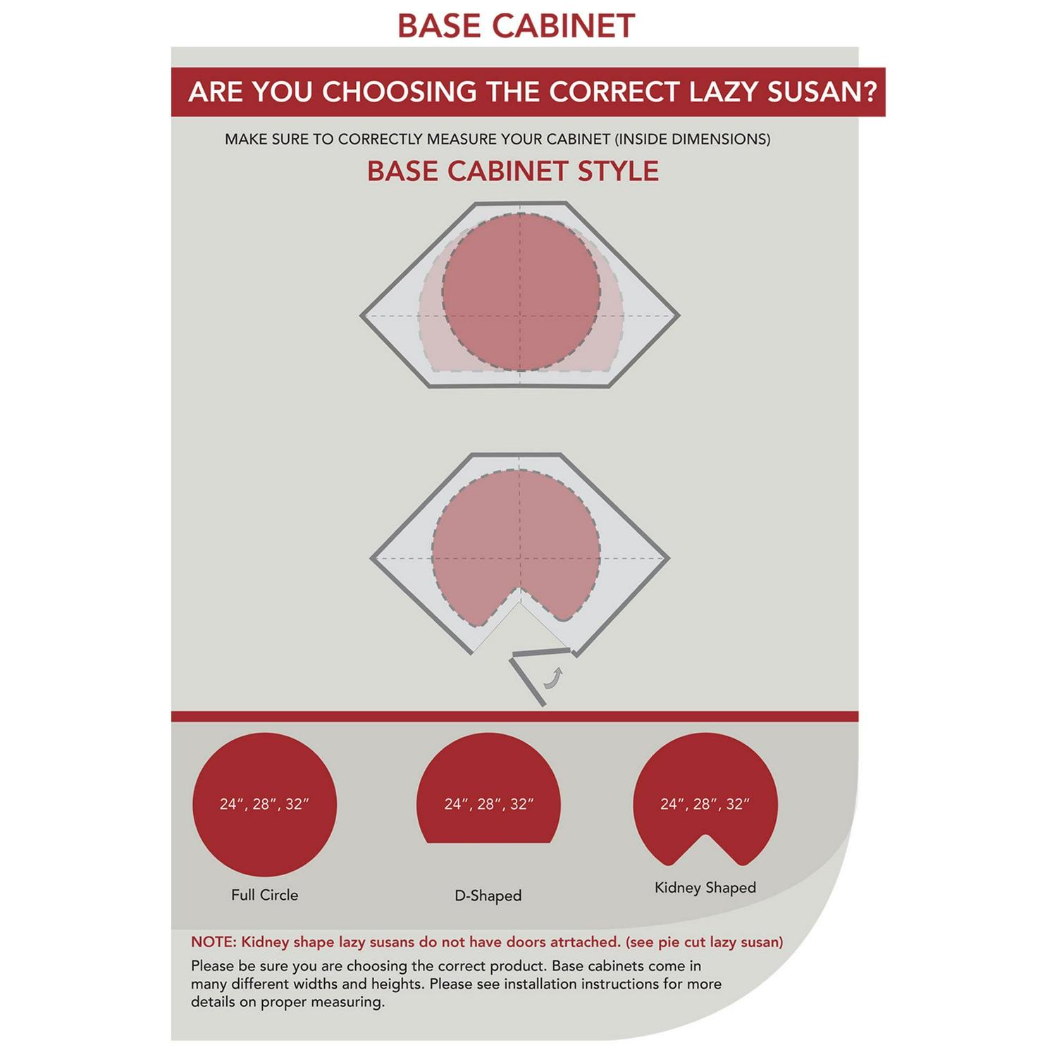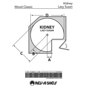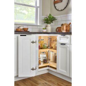Easily access pots, pans, dishes, kitchen gadgets, and food with the Rev-A-Shelf 24-Inch Wooden Kidney Shaped 2-Shelf Lazy Susan. This 2-tiered lazy susan is a great fit for lower or corner base cabinets thanks to its kidney shape that spins inside your cabinet to display your items. Each lazy susan shelf can hold up to 50 pounds per square foot. This wooden lazy susan comes with 2 wooden shelves, a telescoping shaft, and mounting hardware. This lazy susan turntable measures 24 inches deep, 24 inches wide, and 32 inches tall fully extended. You can adjust the telescoping shaft from 26 to 32 inches tall. This corner cabinet lazy susan is designed with maple wood construction with a clear coat finish for corner cabinets with a framed opening at least 24 inches wide. Double-check your cabinet’s opening to allow the best fit. Measure side to side, front to back, and top to bottom. Double-check to make sure your product is within measurements and don’t forget to take into account any obstructions. Ensure that your kitchen cabinets stay clutter-free and organized with this Lazy Susan organizer from Rev-A-Shelf.