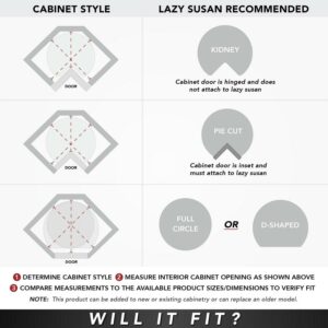 – Independently rotating hardware eliminates the need to mount to cabinet doors and makes installation simple; Kidney Lazy susans do not attach to any door