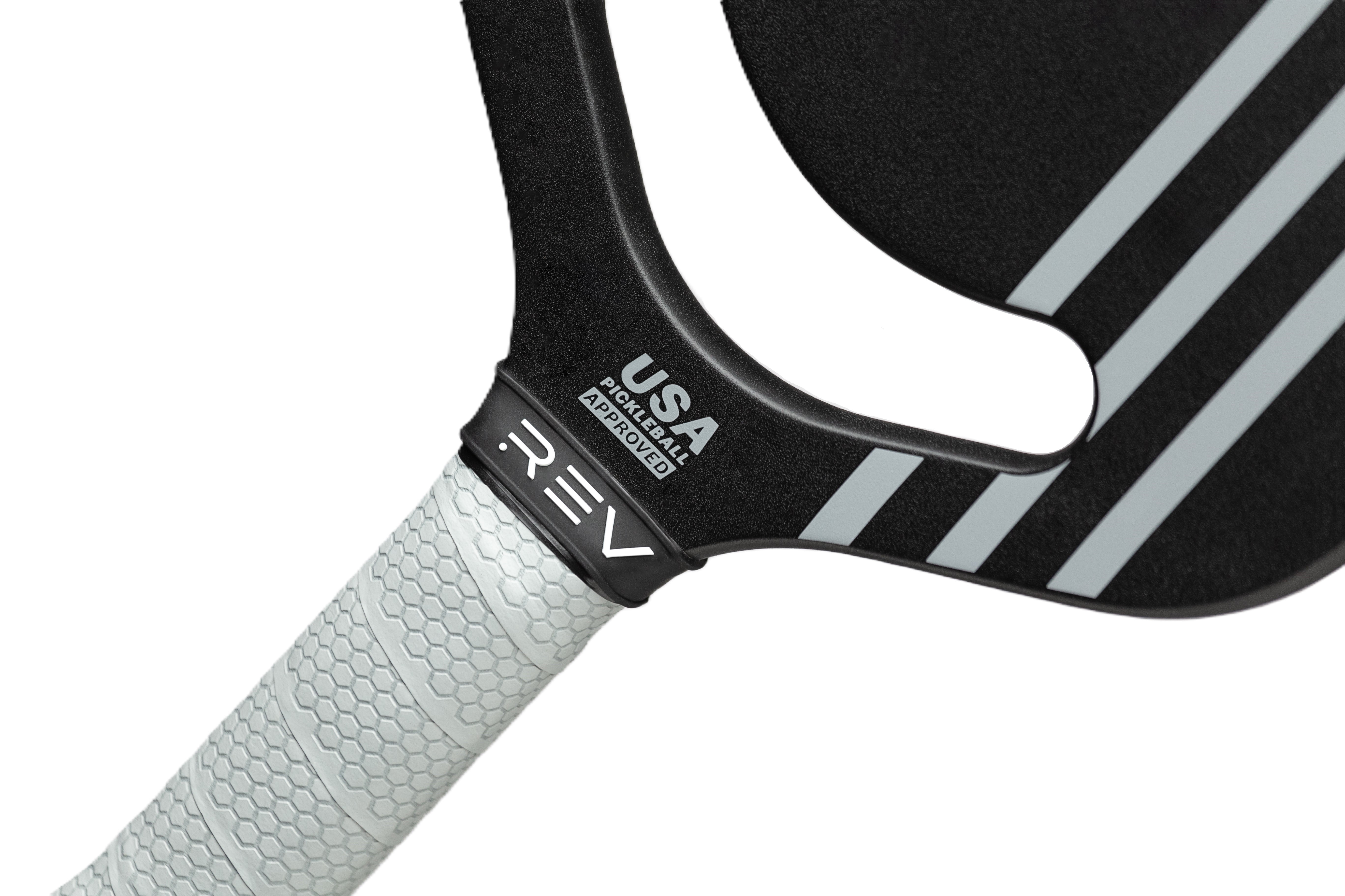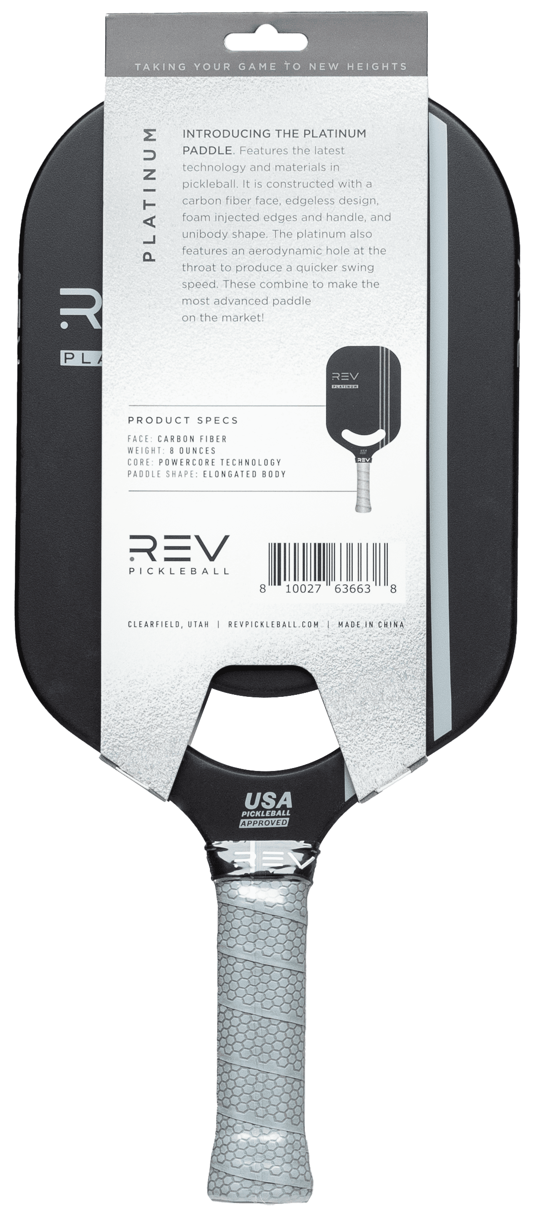 DIMENSIONS – 16.5″ x 7.5″ HANDLE LENGTH – 5.3″ HANDLE CIRCUMFERENCE – 4.2″ THICKNESS – 13mm WEIGHT – 8.0 oz DESIGN DETAILS – The Aerodynamic Hole Design reduces air resistance for harder and smoother swings, while the Ergonomic Extended Handle and Elongated Face increase reach and allow for two-handed backhand shots. MATERIAL TECHNOLOGY – Our Carbon Fiber Blend Face and 13mm Powercore Honeycomb Core combine to create the perfect balance of power, control, spin, and weight. BENEFITS – Designed by Pickleball Professionals, the Platinum Paddle will quickly become the only paddle you grab when going to the court. Expect professional-level power, control, and spin at a price that doesn’t break the bank. USA PICKLEBALL APPROVED – The REV Pickleball Platinum Paddle has undergone rigorous testing and is officially sanctioned for tournament play
