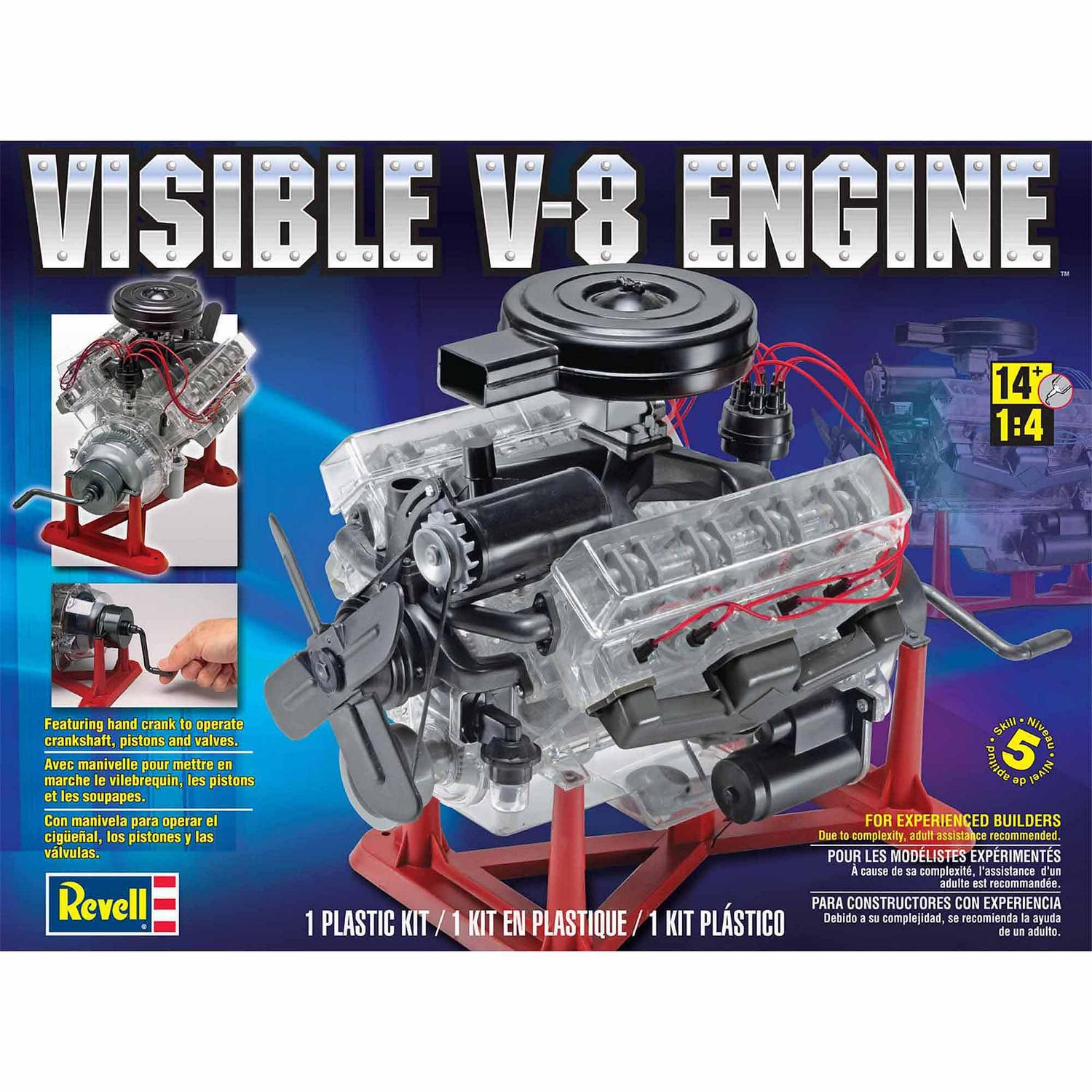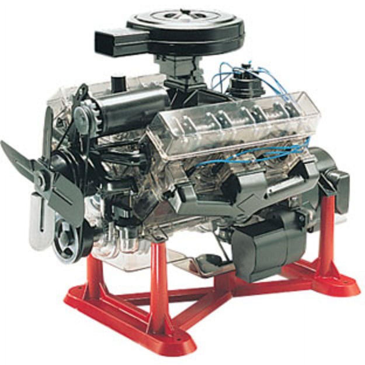 This 1/4 Scale Visible V-8 Engine Plastic Assembly Kit from Revell is the winner of the 2008 Parents Choice Award and Silver Honor – 1995 Doing and Learning Toys. What better way to see how an internal combustion engine works than to be able to see all of the parts move! As you turn the crank, each of the parts move, just like the real thing. The Visible V8 Engine features moving pistons and connecting rods. A hand crank operates the pistons, camshaft rocker arms and valves. The kit includes a rubber fan belt and vinyl ignition wires. Also included is a display stand and screwdriver for construction. A superb educational tool on the inner workings and construction of a V-8 engine! Suitable for ages 14 years and up. WARNING: CHOKING HAZARD — Small parts. Not for children under 3 yrs.