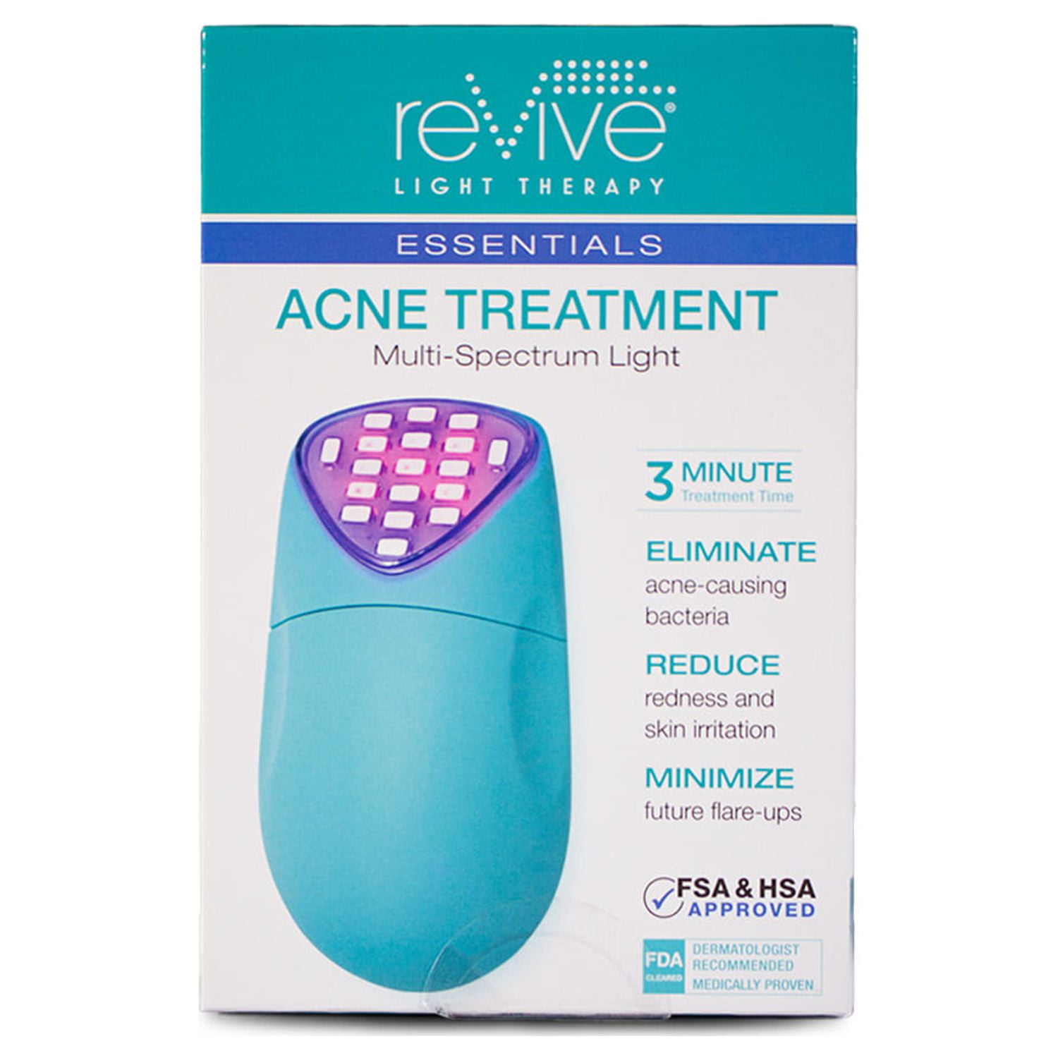 ReVive Light Therapy® Essentials Kills acne-causing bacteria, clears existing breakouts, a prevents future flareups Calms redness and inflammation 3-minute treatment time; visible results in just a few days Non-UV blue and red LED light pentrate to treat acne from within Portable design fits easily in purse, bag, or luggage 0.4 lbs Battery powered – requires two AA Batteries