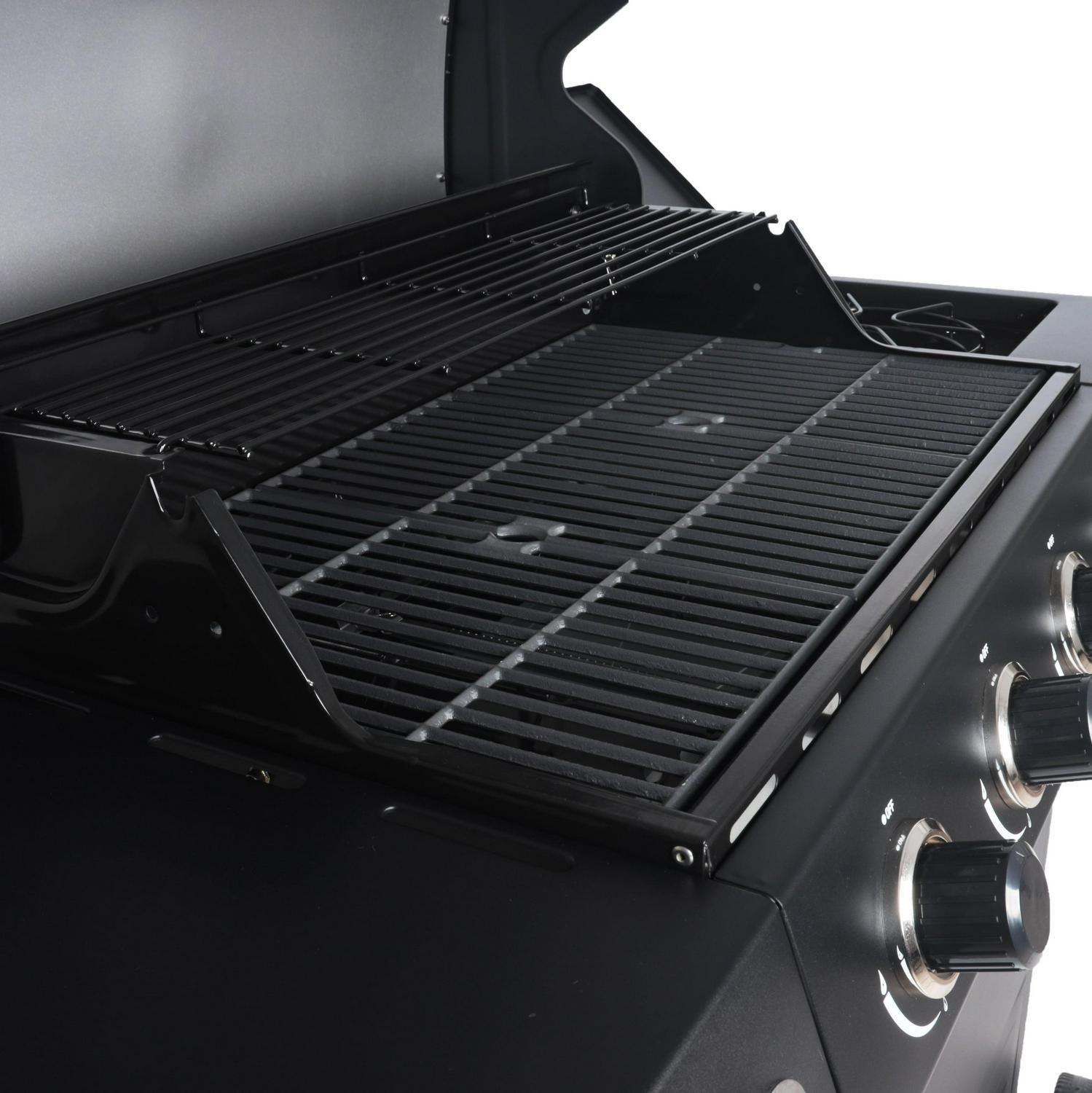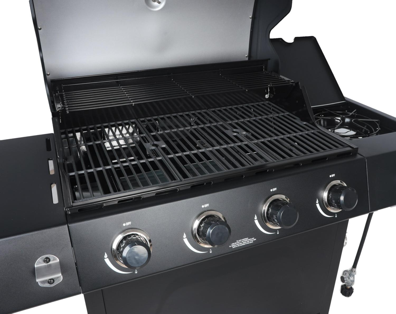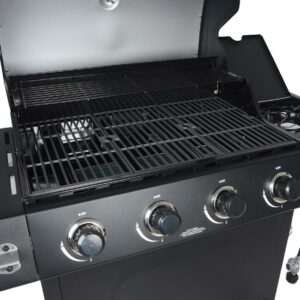 A grill perfect for food, fun, family and friends, the RevoAce 4-Burner Propane Gas Grill with Side Burner, is a great choice whether preparing and feeding a couple or a crowd you will find the space, power and control you need for success. This grill features 480 square inches of primary cooking area that is made of porcelain coated cast iron and an additional 180 square inches of warming area that is made of porcelain-coated steel. With the side burner you can prepare sauces and side dishes as well. Each of the five 12,000 BTU burners (for a total of 60,000 BTU) lights up with integrated ignition providing you the power and control over the BBQ.