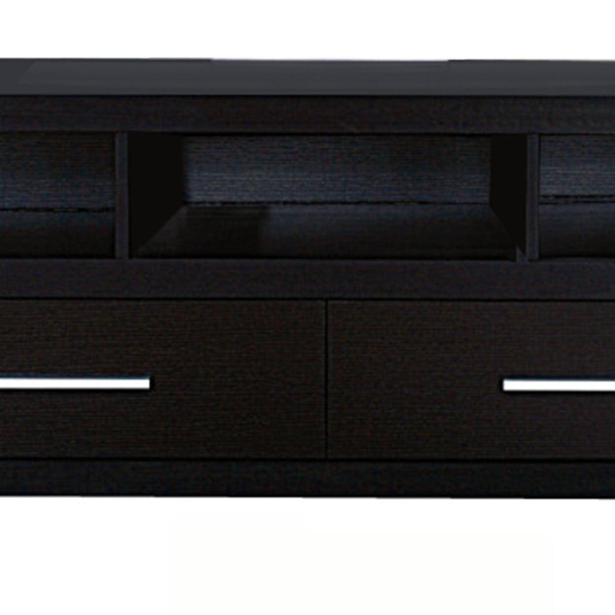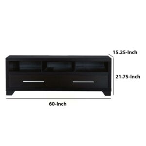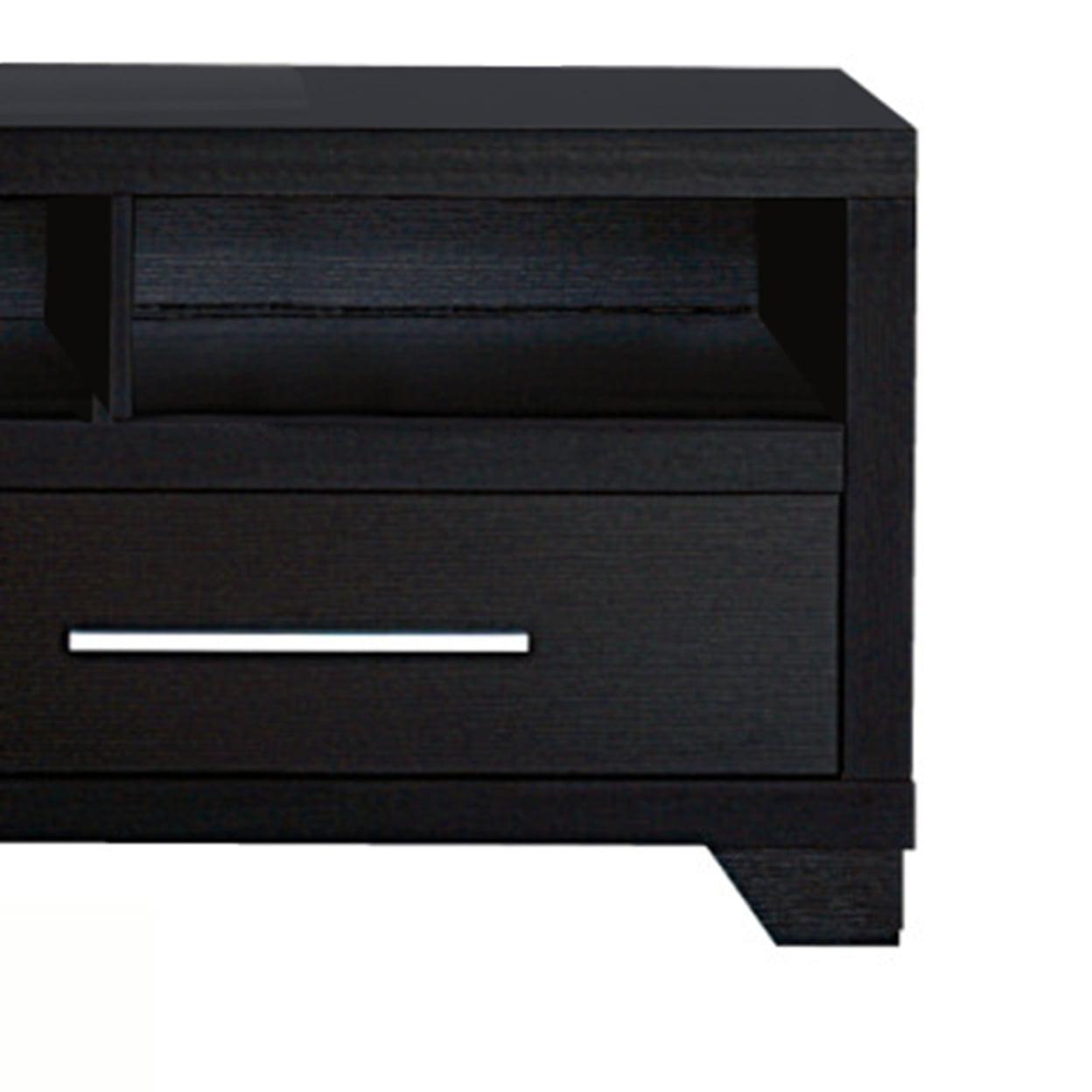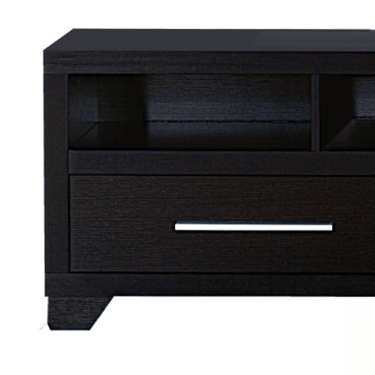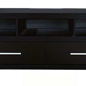 Rich and Elegant TV Stand With Storage, Black- Saltoro Sherpi This TV stand design is sure to stand out in any living or family room space. A gorgeous black wood finish offers a contemporary flair but is sophisticated enough to fit in with a multitude of different home decors. Two drawers provide ample storage space for DVDs, remotes, and electronic accessories, while the open shelf design easily houses a variety media players.