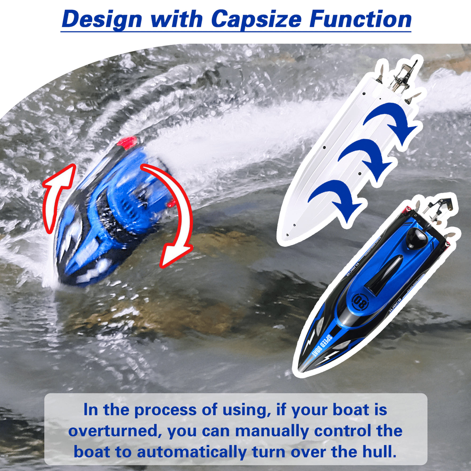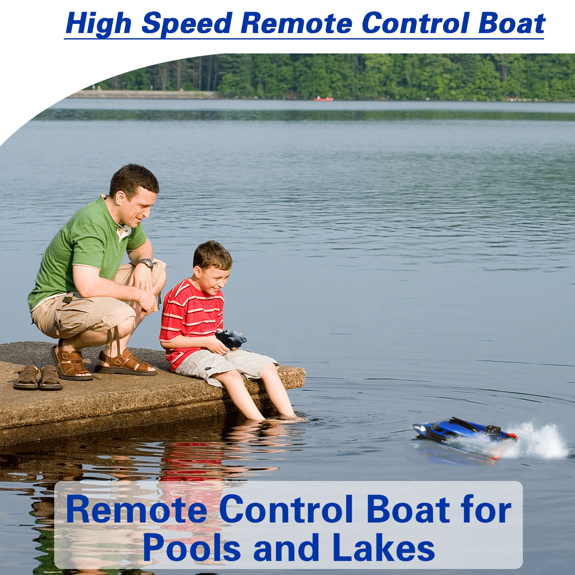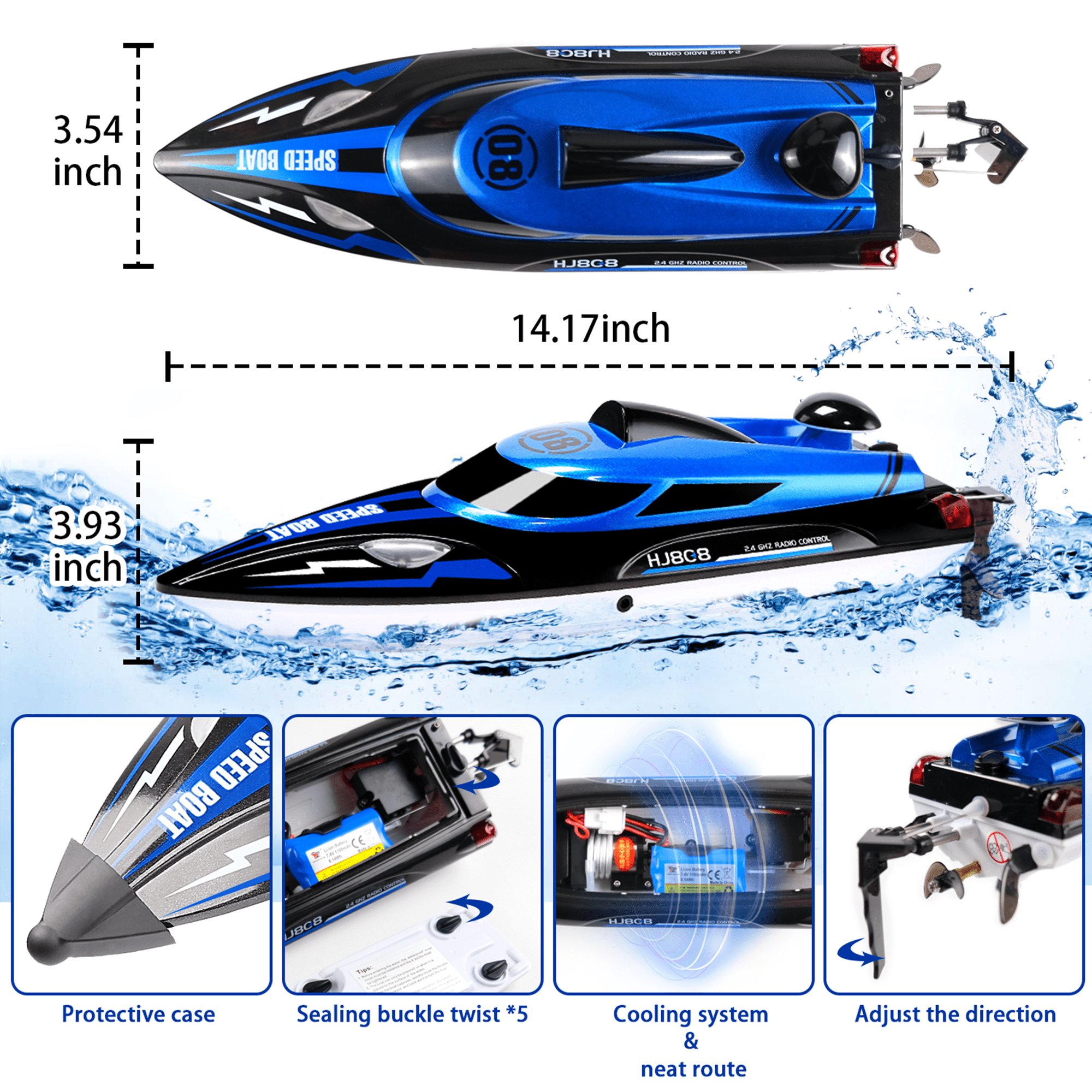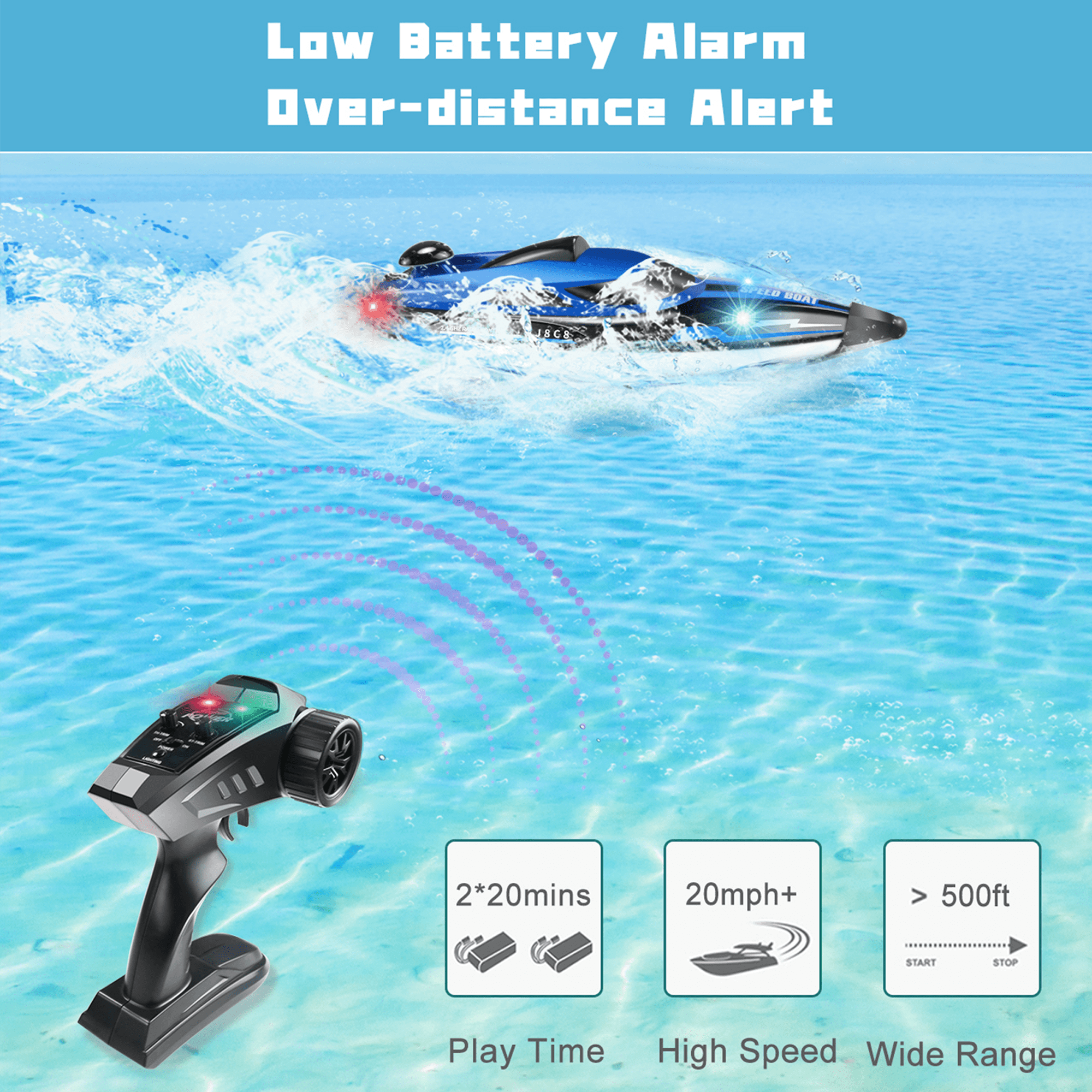 🚤[ High Speed RC Boat Toys for Kids ] – This remote control boat has a cool appearance and scientific low resistance hull design, with a high-power motor, its travel speed can reach to 20+ MPH or more. Experience unparalleled speed and agility on the water with the RC boat’s powerful motor system. 🚤[ Long Playing Time with 2 Rechargeable Batteries ] – High speed rc boat comes with 2 rechargeable long-lasting batteries to provide players with a more lasting entertainment and competitive experience. Each battery lasts about 20 minutes. 🚤[ Easy to Control ] – The remote control adopts advanced 2.4G technology, multiple RC boats will not interfere with each other when playing at the same time. The remote control has a control distance of 500 feet, and the extra-long control distance can bring players a more exciting gaming experience. 🚤[ Waterproof & Durable ] – The inner and outer sides have edge waterproof design, the inner cable is neatly arranged, and the cooling system protects the life of the motor. RC boat features LED lights, Illuminating your nighttime aquatic adventures. This feature not only adds a spectacular visual element to the RC boat but also makes it easy to track in the dark waters of pools and lakes, enhancing both safety and fun. 🚤[ Perfect Gift for Kids & Adults ] – It is a perfect birthday, Christmas gift choice for boys and girls, not only be used to play with friends but also increases the family fun. It also can be a great gift for yourself and give yourself some relaxed time and enjoy your life. ◆Color: Blue ◆Lighting: LED lights ◆Max Speed: 20 MPH ◆Package List: 1*rc boat, 1*remote control, 2*rechargeable battery