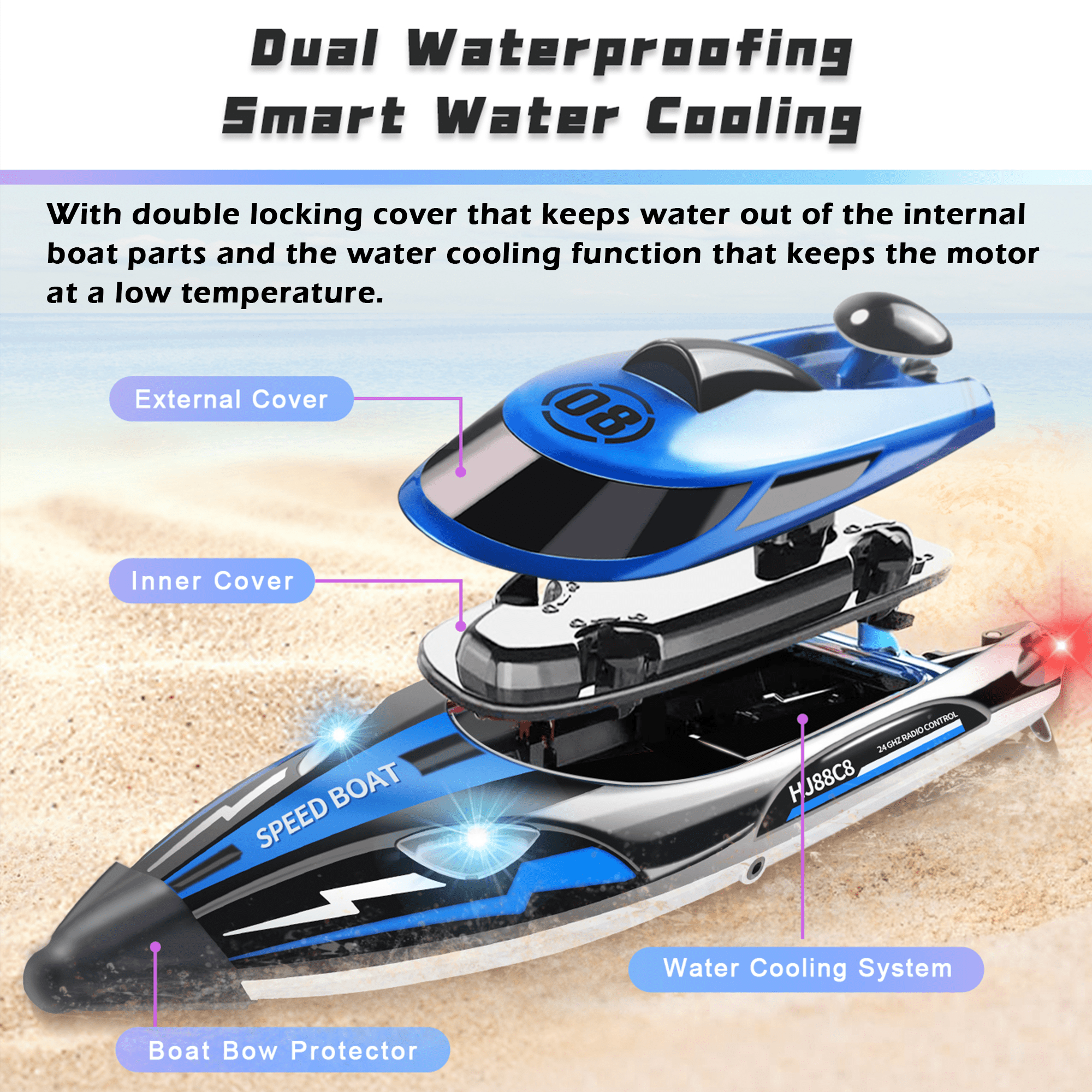 This remote control boat has a cool appearance and scientific low resistance hull design, with a high-power motor, its travel speed can reach to 20+ MPH or more. High speed rc boat comes with 2 rechargeable long-lasting batteries to provide players with a more lasting entertainment and competitive experience. The remote control adopts advanced 2.4G technology, multiple RC boats will not interfere with each other when playing at the same time. The inner and outer sides have edge waterproof design, the inner cable is neatly arranged, and the cooling system protects the life of the motor. RC boat features LED lights, Illuminating your nighttime aquatic adventures. Perfect birthday, Christmas gift choice for boys and girls, not only be used to play with friends but also increases the family fun.