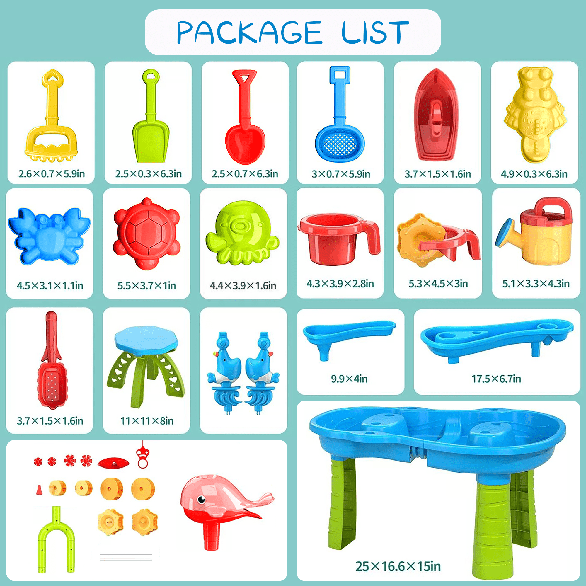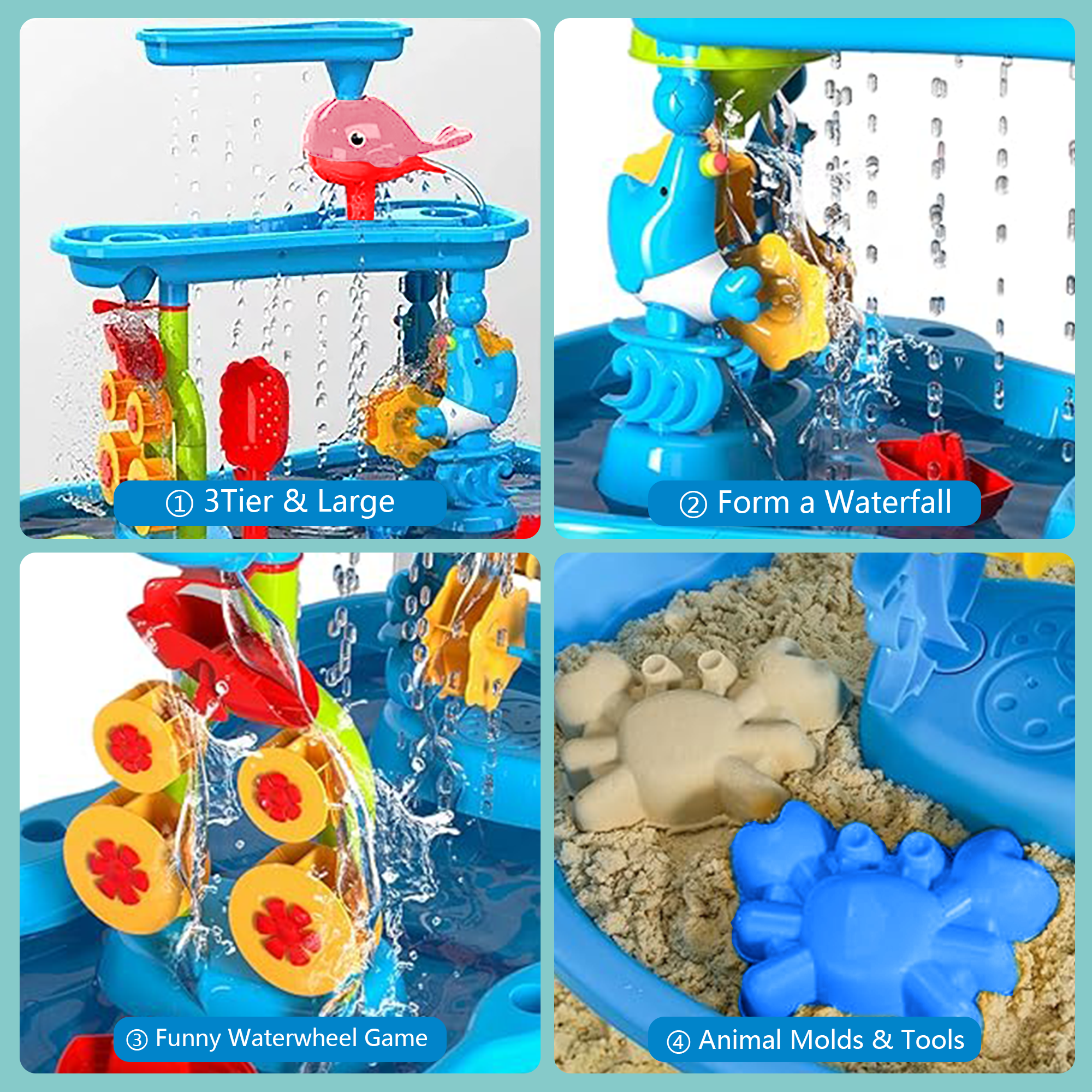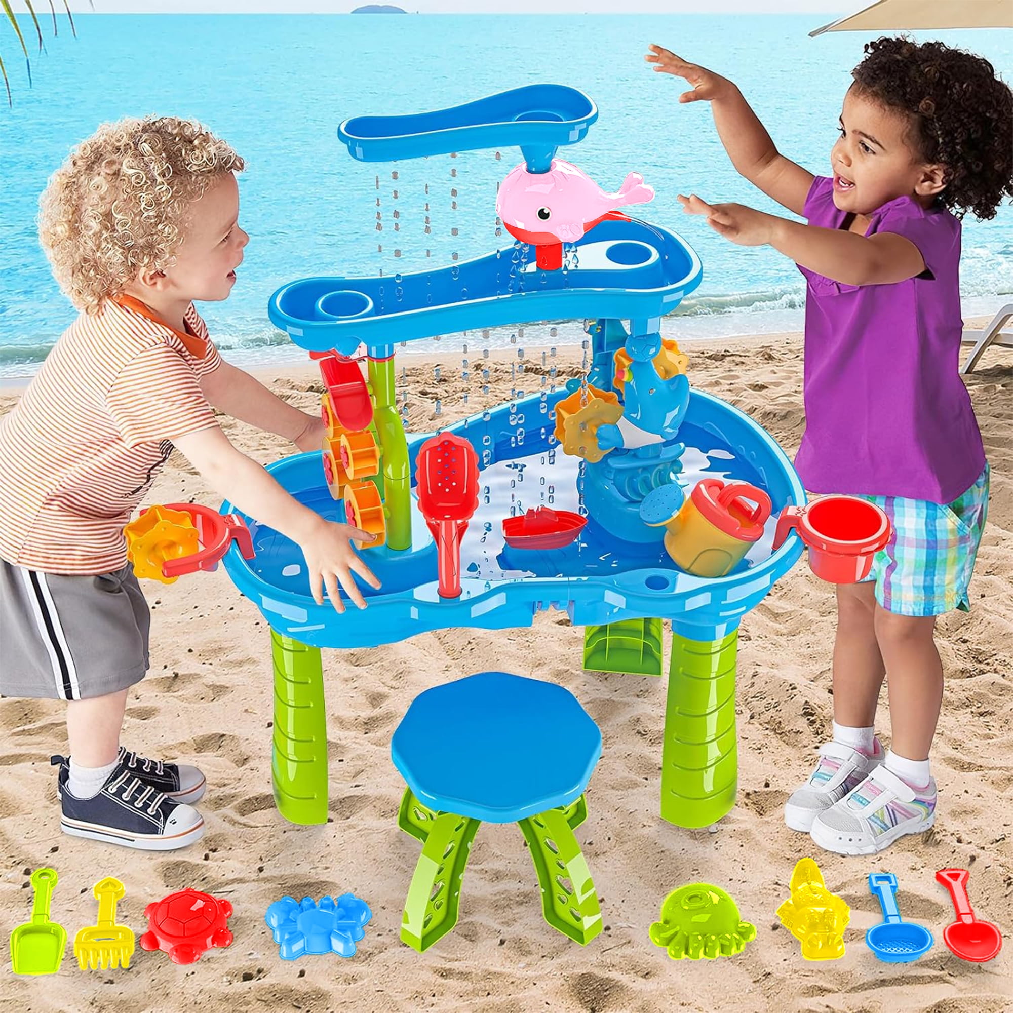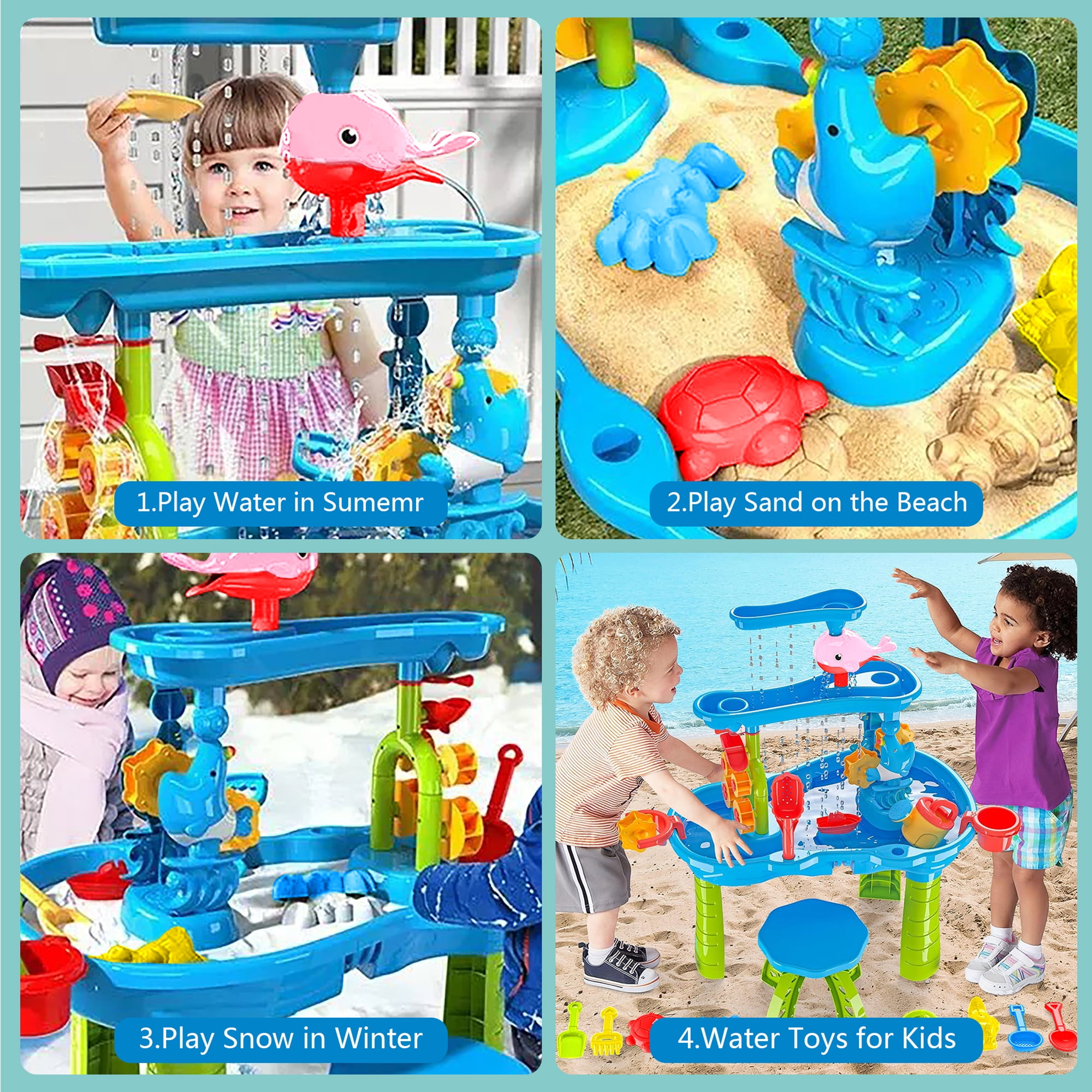 Richgv sand and water table for kids is composed of 3-tier tray, more spacious and more fun to play, creating a mini water park in your backyard or on the beach. Our upgraded sand water table set comes with colorful and rich accessories to create more fun, including dolphin funnel, water windmill, tree water tower, boat toy, watering can, shovel, scoop, rake, sieve, 4 sand molds (crab, turtle, crocodile) and a small stool. Water play table helps kids develop fine motor skills, hand-eye coordination and enhance sensory exercise. Outdoor sand water activity table can be filled with water, sand, snow, soil or anything you can think of for multiple sensory exploration. Toddler outdoor toy sandbox table toy is made of durable high-quality ABS material, which is easy to assemble that kids can explore and build together with the help of parents. Great gift for boys and girls age 3 4 5 6 7 8 9 years old for summer parties, birthdays, Halloween, Christmas or other holidays.
