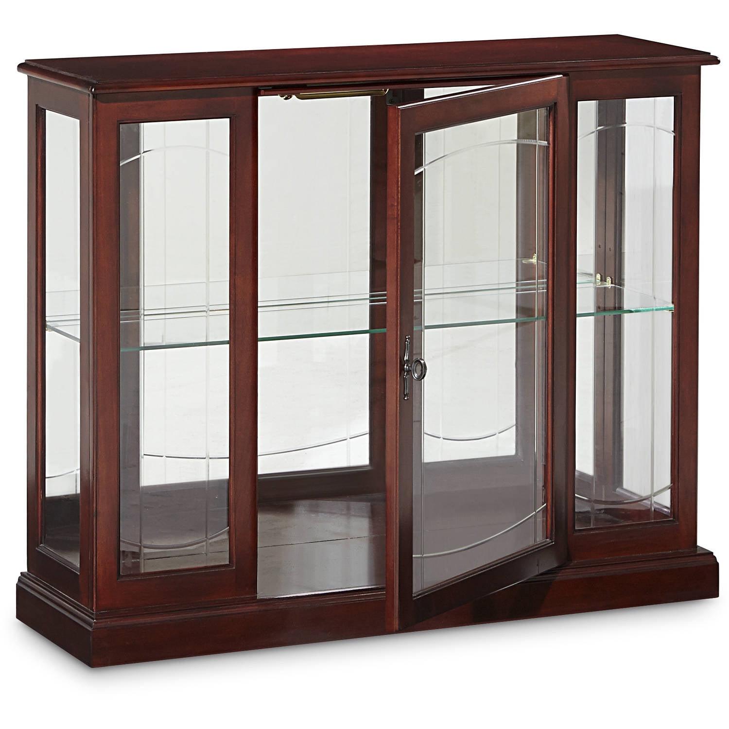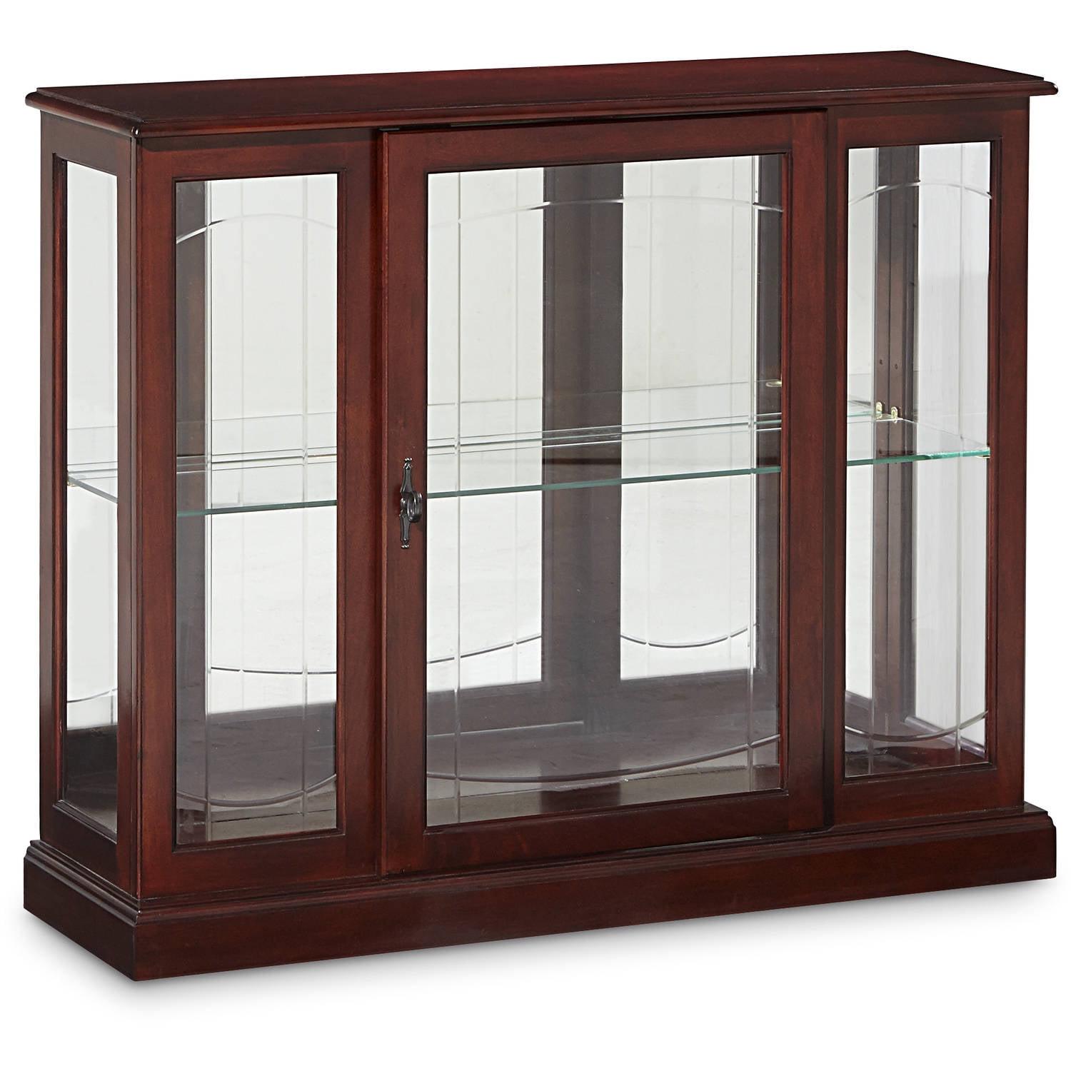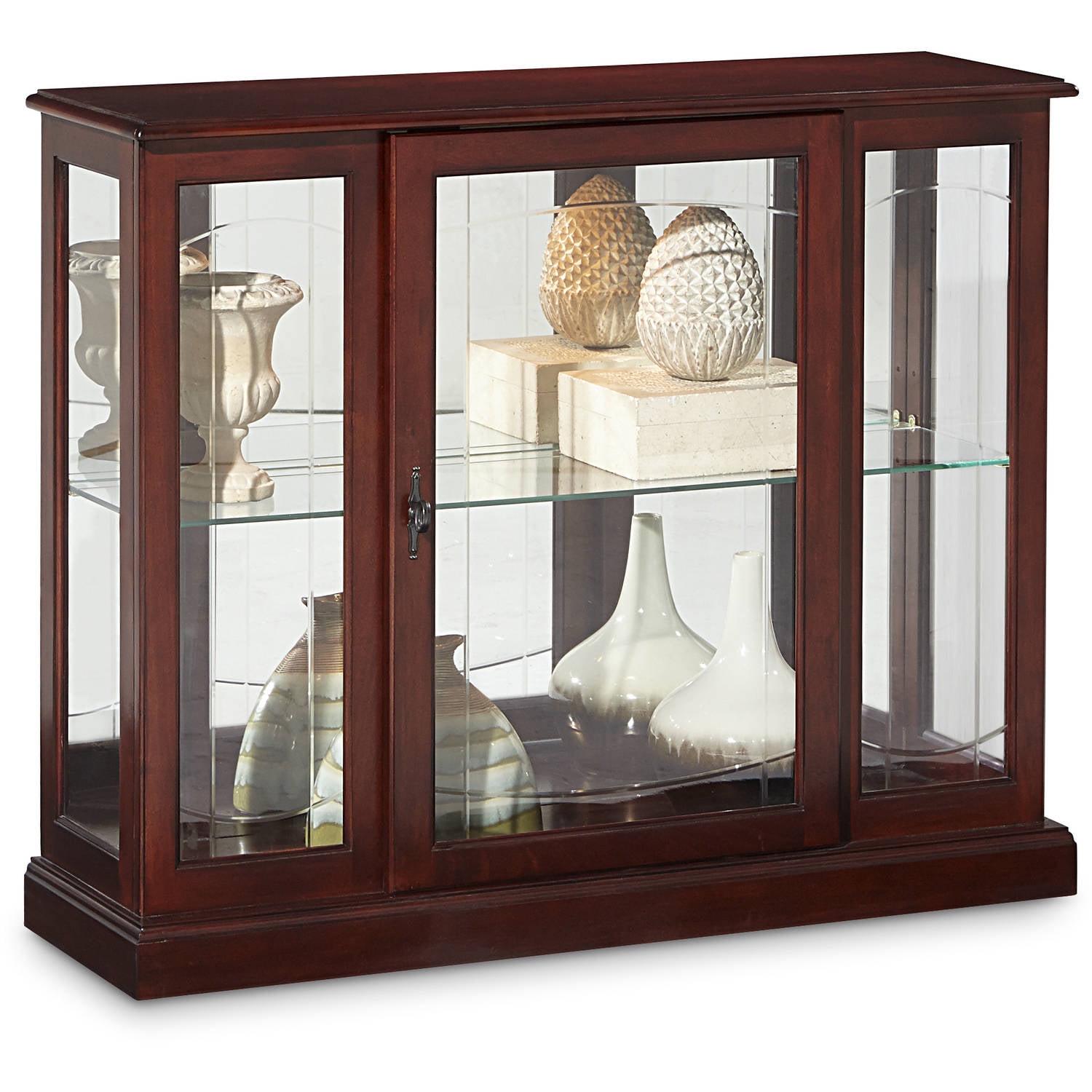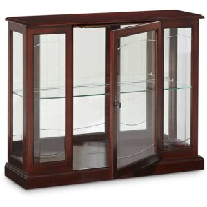 At 33 inches high, our curio console reserves prime wall space above for hanging a favorite print or painting. Or you may place it behind a sofa to add interest to the center of a room. Our mirror console is built of select hardwood veneers and solids and a dark Ridgewood Cherry finish. The console features elegant patterned beveled glass on the front. It has a mirrored back, interior lighting, and one adjustable glass shelf.
