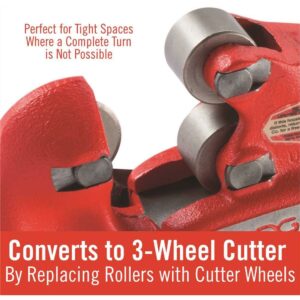 The RIDGID 2A Adjustable Heavy Duty Pipe Cutter can take on thick steel pipe quickly and efficiently for a variety of commercial and industrial-grade projects. Suited for professional use, this pipe cutter tool is designed for heavy-grade industrial pipes. Use this tool to cut steel pipe by hand or with a power cutter. Protect pipe threads with the long shank of the adjustable pipe cutter. The extra-large handle allows for easy and fast adjustments. Ridgid’s 2A pipe cutter tool can handle steel pipe from 1/8 inch to 2 inches. You can convert this pipe cutter tool to a three-wheel cutter if you replace the internal rollers with cutting wheels. Use in the three-wheel mode in tighter spaces where complete turns aren’t possible.