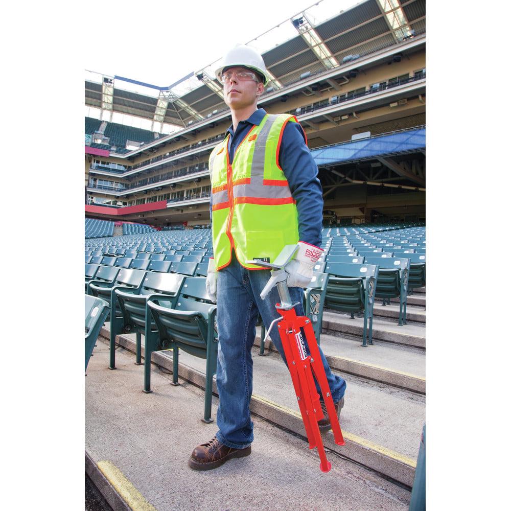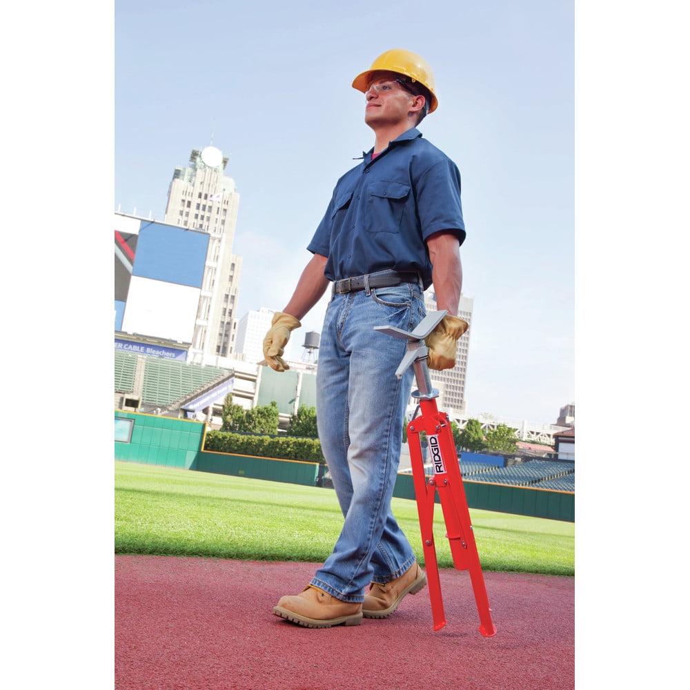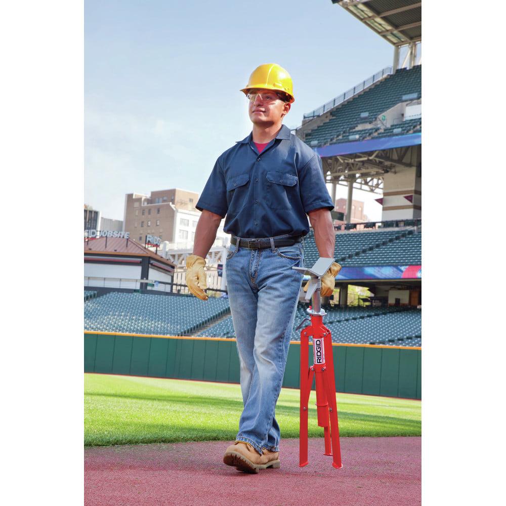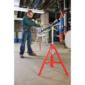 Support piping for welding or fitting with the RIDGID V-Head Pipe Stand. The high jack stand can be height-adjusted from 28 to 52 inches, and supports a maximum pipe diameter of 12 inches with a weight of up to 2,500 pounds. The Ridgid pipe stand is equipped with a locking ring that is lifted to loosen the elevator tube and then lowered to lock it in place at the desired position. The pipe support stand is also equipped with a jack screw that can fine-tune the height adjustment, and it has a wide base with rectangular legs and flat cylindrical feet for sturdy grounding. The Ridgid V-head pipe stand accepts roller-head assemblies with the proper fit, such as Ridgid models RJ-98 and 99.