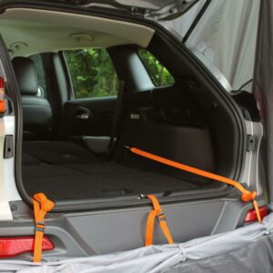 The Rightline Gear SUV Tent lets you sleep off the ground in the comfort of your own vehicle. The tent connects to the back of any size SUV, minivan, wagon, or pick-up truck with cap. Large size no-see-um mesh windows and doors have storm covers that can be closed for privacy. The SUV Tent features (2) gear pockets, a lantern hanging hook, and glow-in-the-dark zipper pulls. The vehicle sleeve easily disconnects, allowing you to leave the tent behind as you go about the adventures for the day.