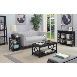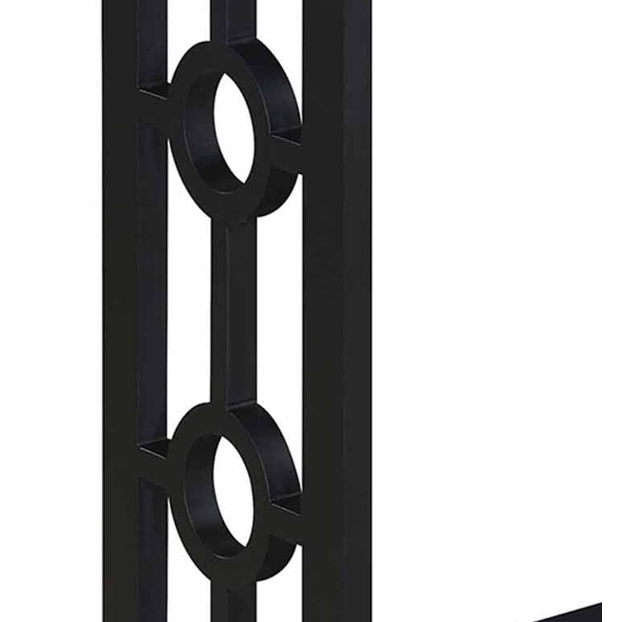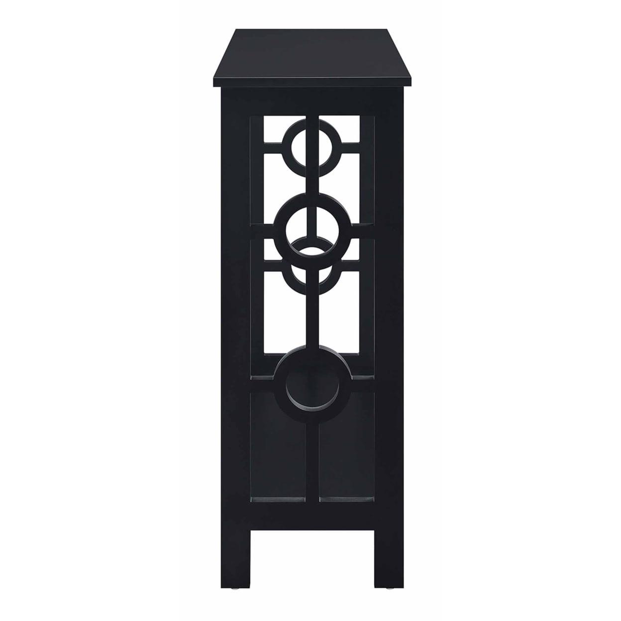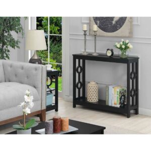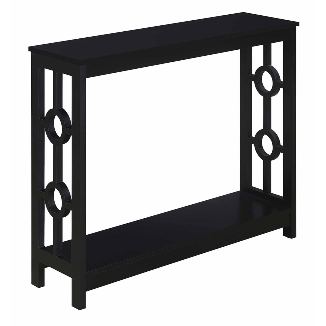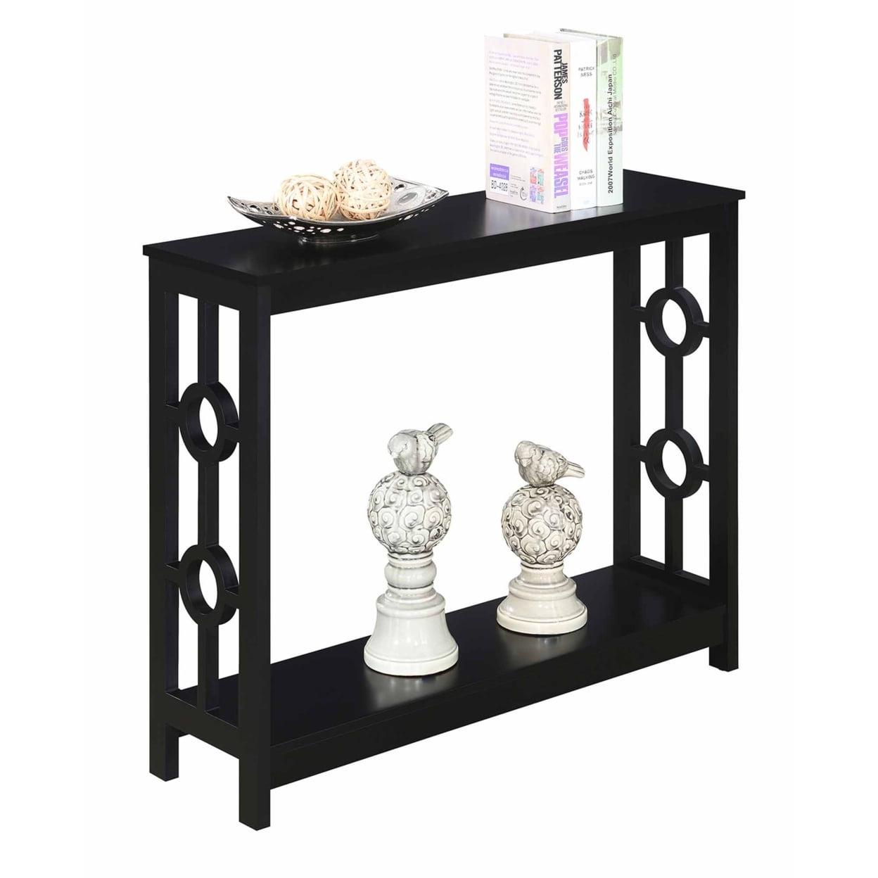 Ring Console Table, Black Spruce up the essence of your living room with the Ring Console Table by Convenience Concepts today! This distinctive contemporary piece showcases a well thought out design that combines a clean line silhouette and two circles that adorn each of the side frames. Crafted with durable materials to become a staple in your home. The top and bottom shelves are fashioned from particle board that is finished with a non lead based paint and melamine; making them easy to maintain. The frame design and legs were constructed from MDF and finished with a non lead based paint. With ample shelves; this two tier unit will satisfy your display and storage needs. Exhibit all your most beloved collections or books with pride; as this accent table is stylish and ideal for any type of mementos. With endless versatility this item can be placed anywhere; from hallways to your home office; it will fill the room with style. Add it to your ensemble today and enjoy its simple assembly that is worth every step! Complete the look with additional furniture pieces from the Ring Collection by Convenience Concepts. They are available in multiple finishes; so you are sure to find the perfect fit for your home. Each sold separately.