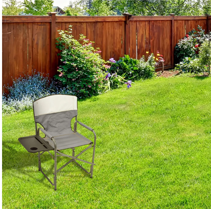 RIO Brands XXL Oversized Powder Coated Steel Frame Foldable Director’s Chair with Fold Out Side Table, Media and Drink Slots, and Carry Straps, Gray