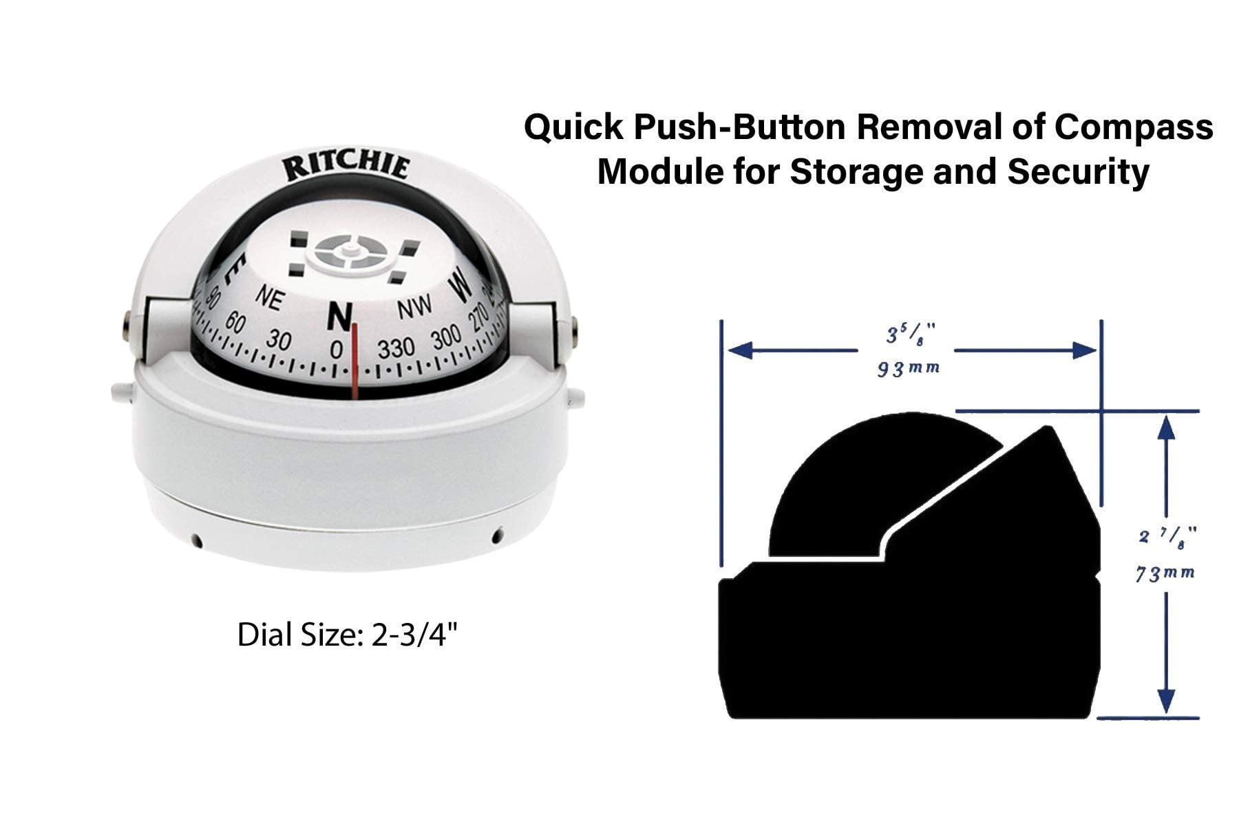 3 3/4″ easy to read direct reading dial Compact low-profile design Quick push-button removal of compass module for storage and security