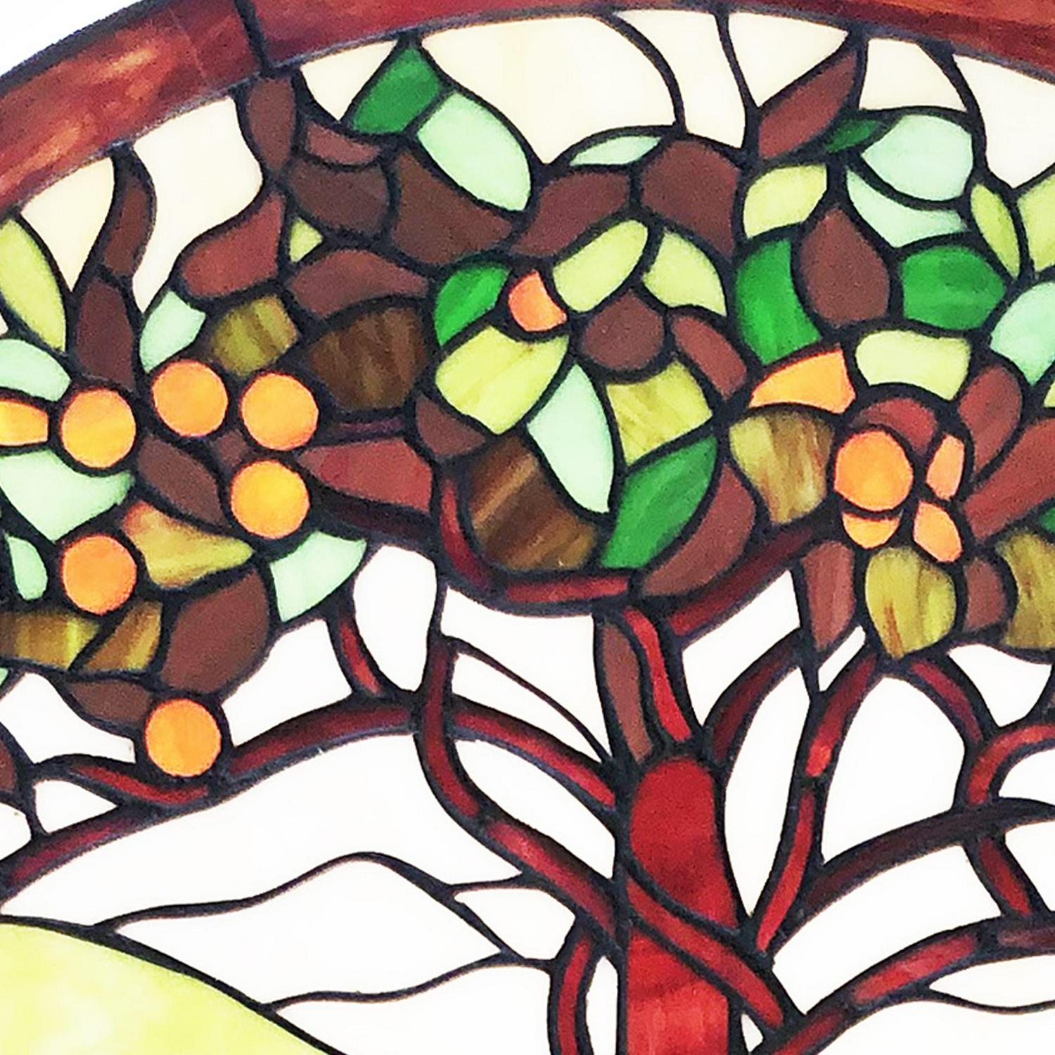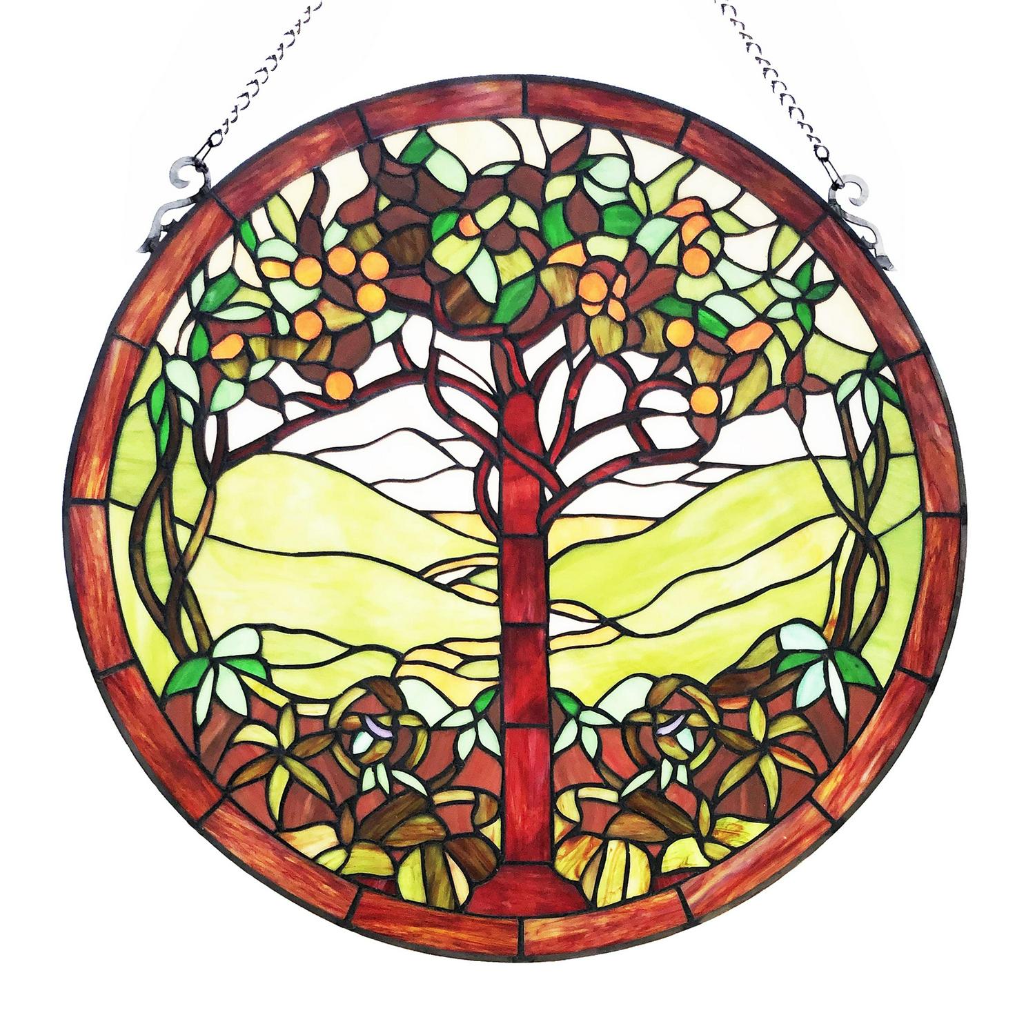 Inspired by Tiffany Nouveau Fruit design and is The Tree of Life. This panel is designed with vibrant yellow and ambers and rich reds and green stained glass. Each panel comes with a decorative hanging chain for support and strength so that you can easily install it and enjoy. This 24 in. round shaped stained glass panel is perfect for your home office, kitchen window or dining room space.