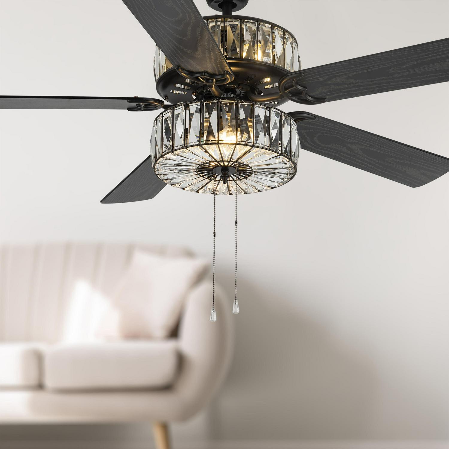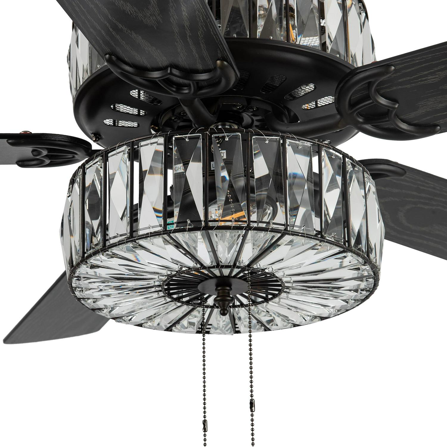 Bring glamour to illuminate your room in style with this crystal River of Goods ceiling fan. Featuring a bronzed caged chandelier ceiling fan adorned with over 70 clear crystals; woodgrain reversible blades in black on one side, while the opposite side features mahogany, this fan offers a luxurious aesthetic. Three fan speeds and a reversible switch help keep you comfortable year-round. In warm weather, run the fan counterclockwise to stay cool. In cold weather save money by reversing the ceiling fan direction to push warm air down.