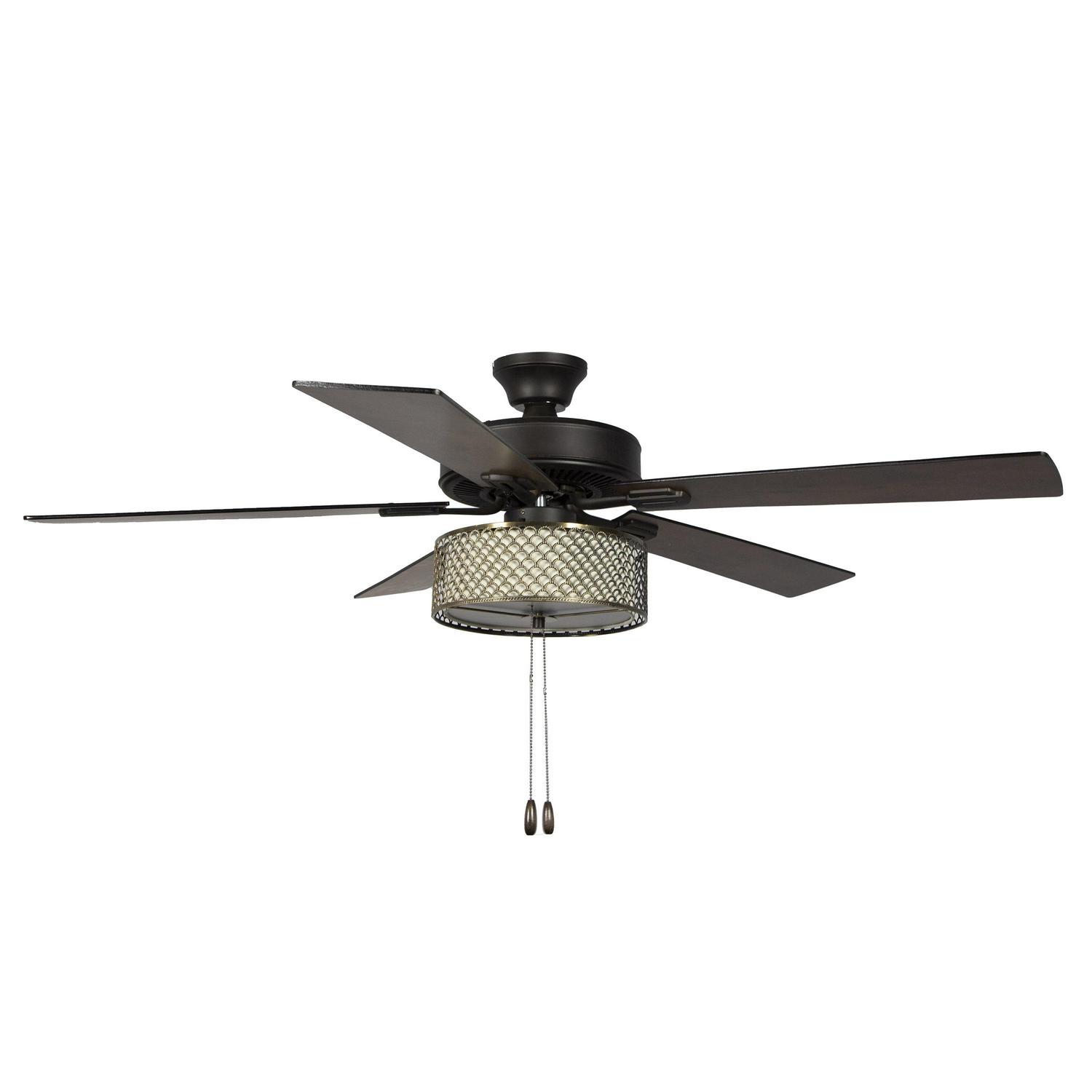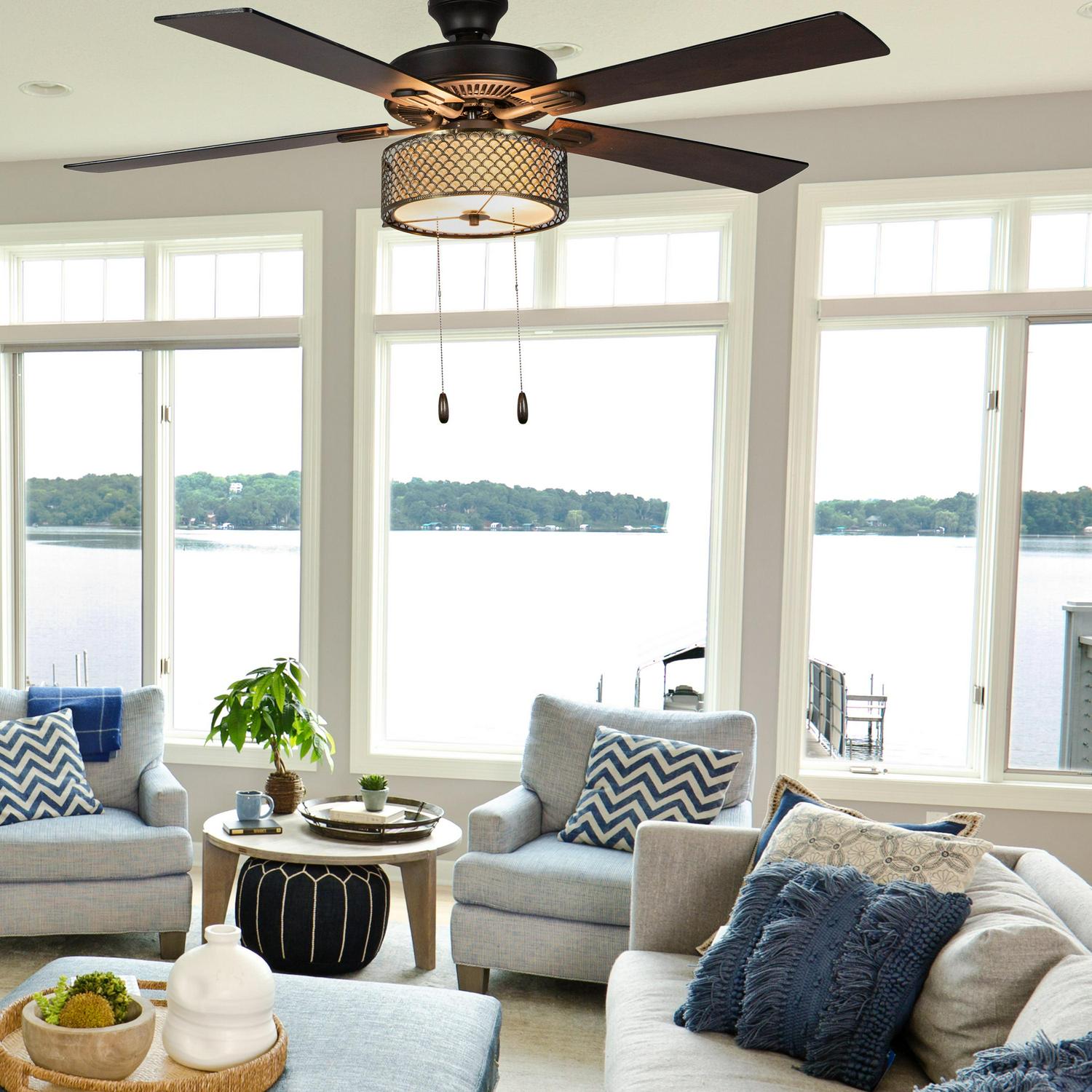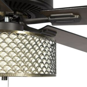 The River of Goods Gloria Bronzed Wave 52 inch LED Ceiling Fan offers a transitional sophistication to your home with its bronze scallop metal exterior and cream fabric interior shade. The 2-lights add ambiance to your home office, living or bedroom space. The 3-speed reversible motor allows you to circulate cool air or heat all year round. Item requires hardwiring, professional installation is recommended.