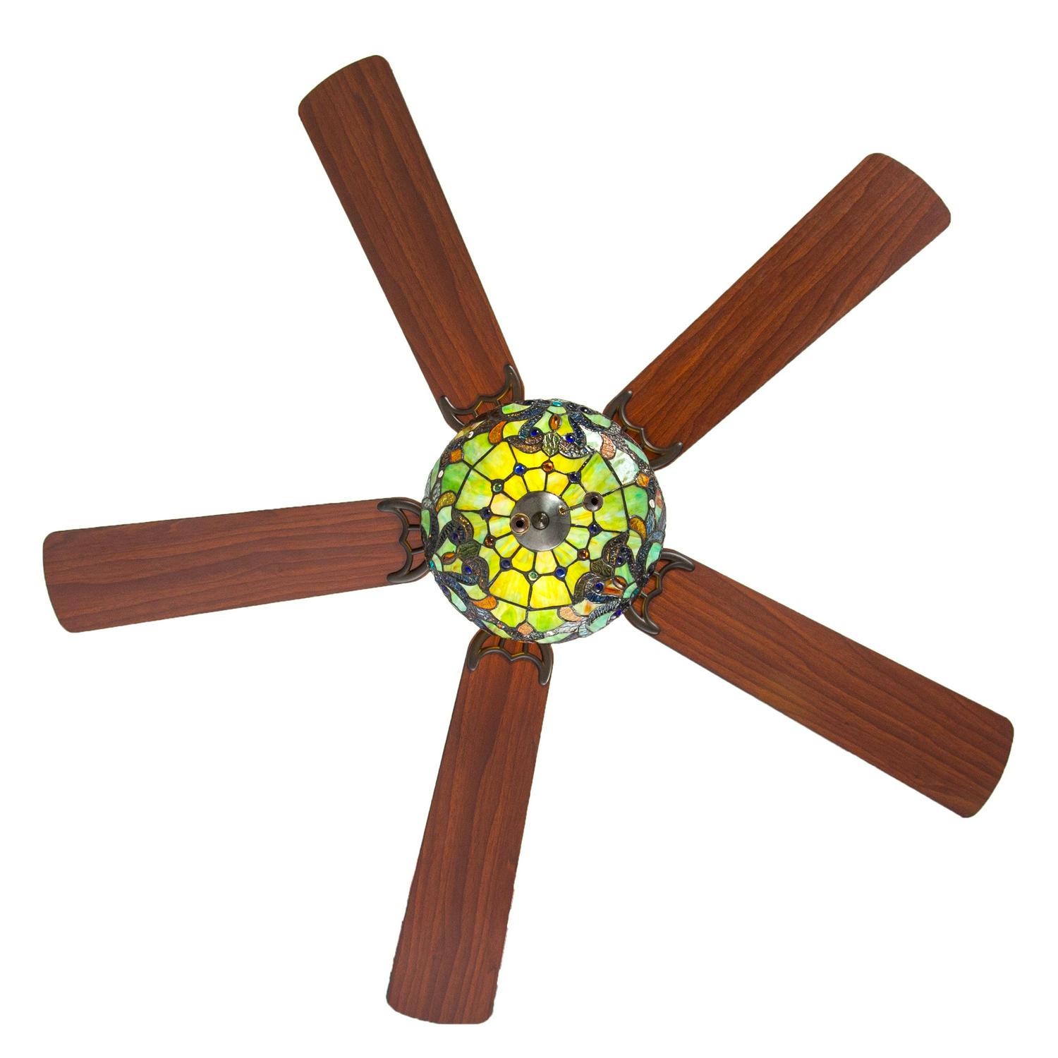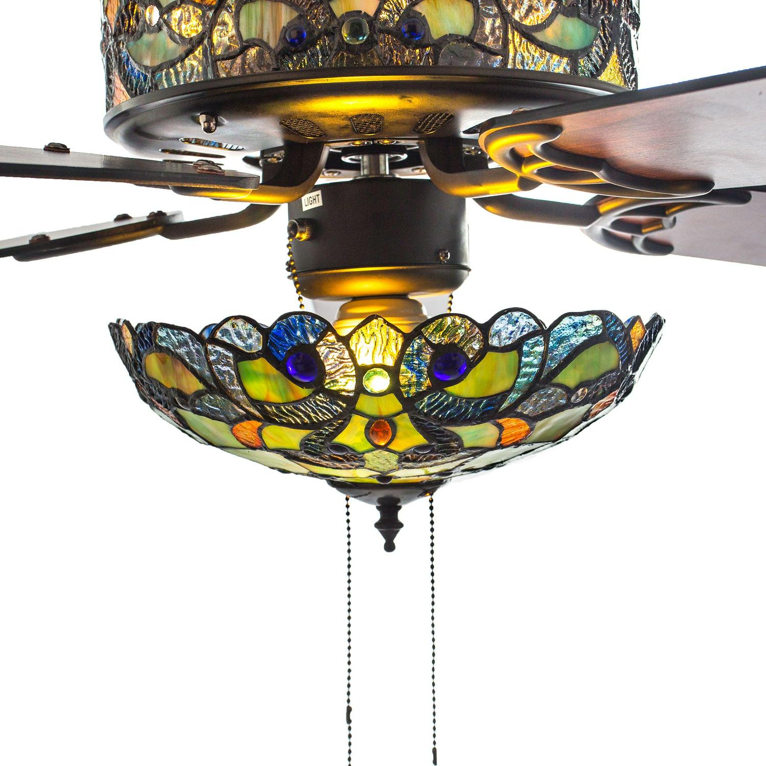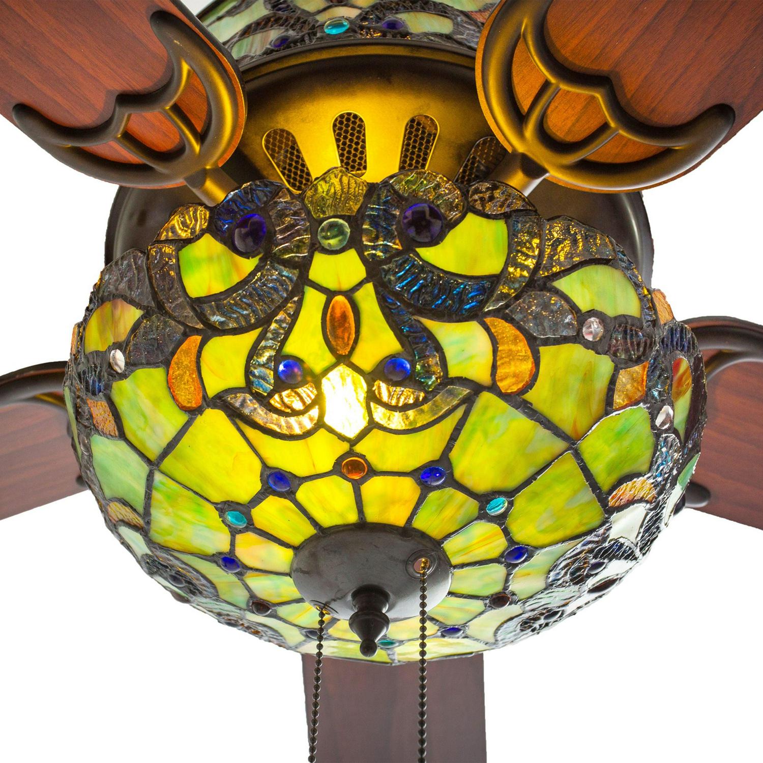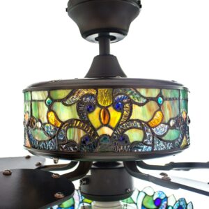 The beauty of stained glass in a functional ceiling fan. Illuminate your home in style and comfort with this Magna Carta designed ceiling fans. Six lights highlight the more than 250 total glass cuts and bring shine to the over 60 glass cabochons. This traditional baroque design is created with striated and ripple glass. Each glass cut has been soldered together using the copper foil method, made famous by Louis Comfort Tiffany in the early 1900s. Every piece of glass is unique in color, so variations may occur making each style special. Five wood grain-textured blades are included with black on one side, and mahogany on the other for reversible color options. Pull chain switches allow for manual power off/on, light operation, and three-speed motor (reversible) . A short 4″ down rod and longer 21″ down rod are included for two display options, as well as flush mount. Three fan speeds and a reversible switch help keep you comfortable year-round. In warm weather, run the fan counterclockwise to stay cool. In cold weather save money by reversing the ceiling fan direction to push warm air down.