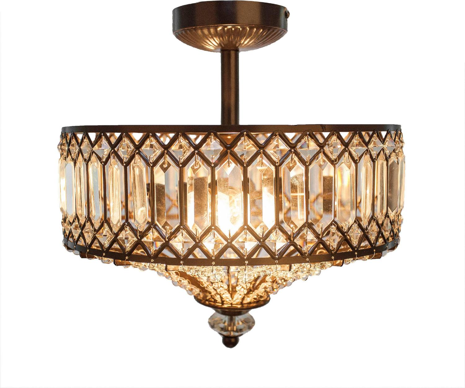 Bring a touch of Hollywood glam lighting into your home. This ceiling lamp is encrusted with sparkling K-9 crystals and is complemented by a bronze metal framework. This lamp is like jewelry for your home! A gorgeous fixture for your bathroom, bedroom, walk-in closet or hallway that is sure to steal the show.