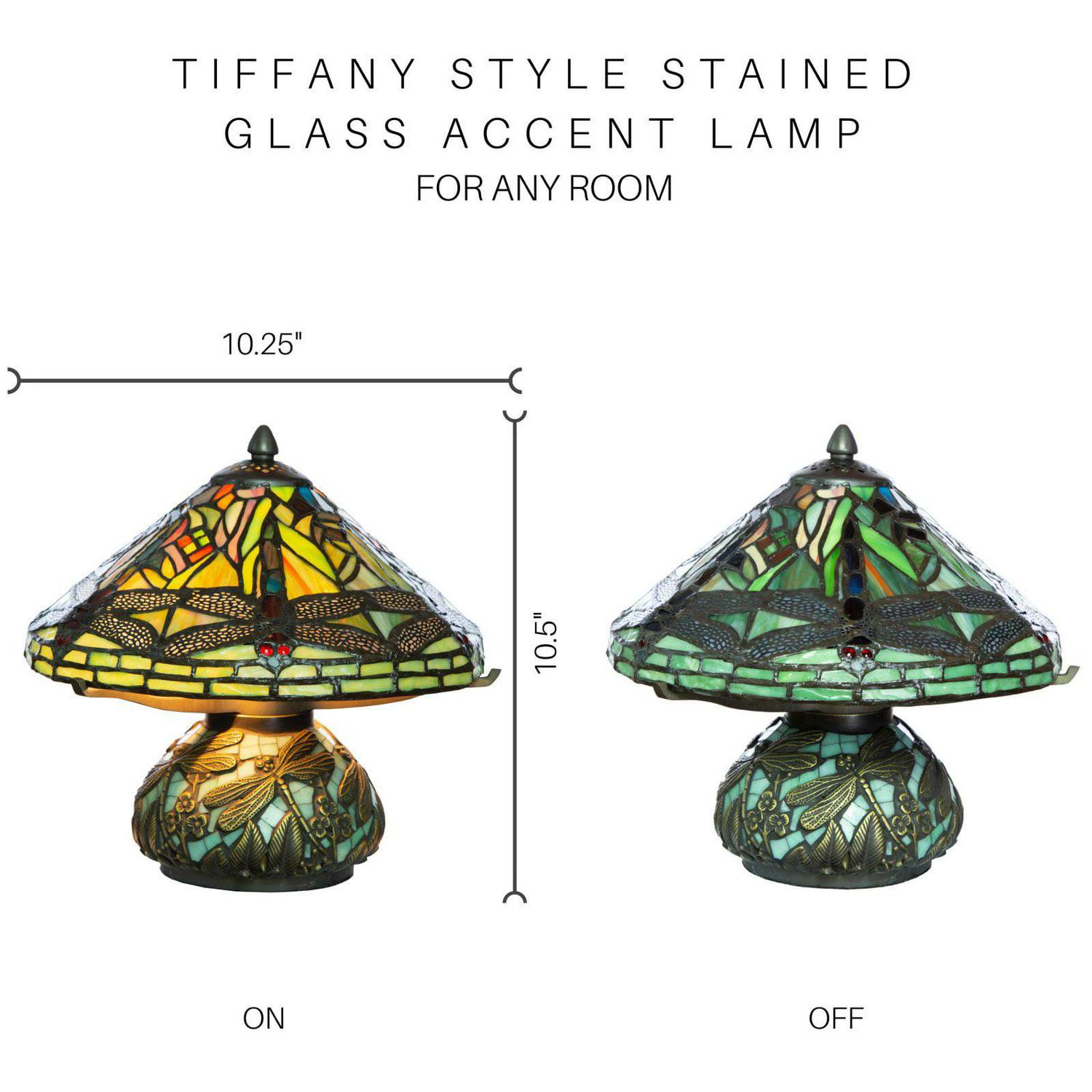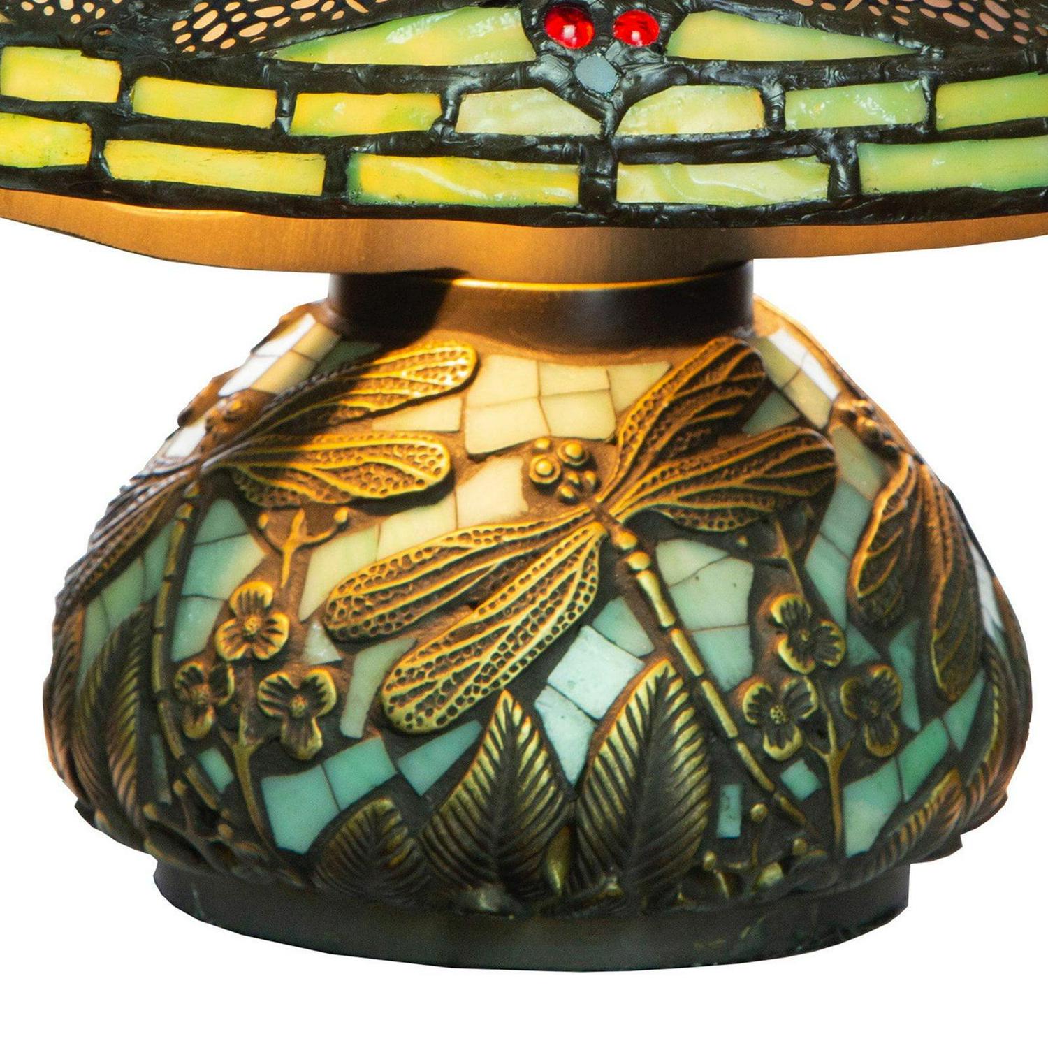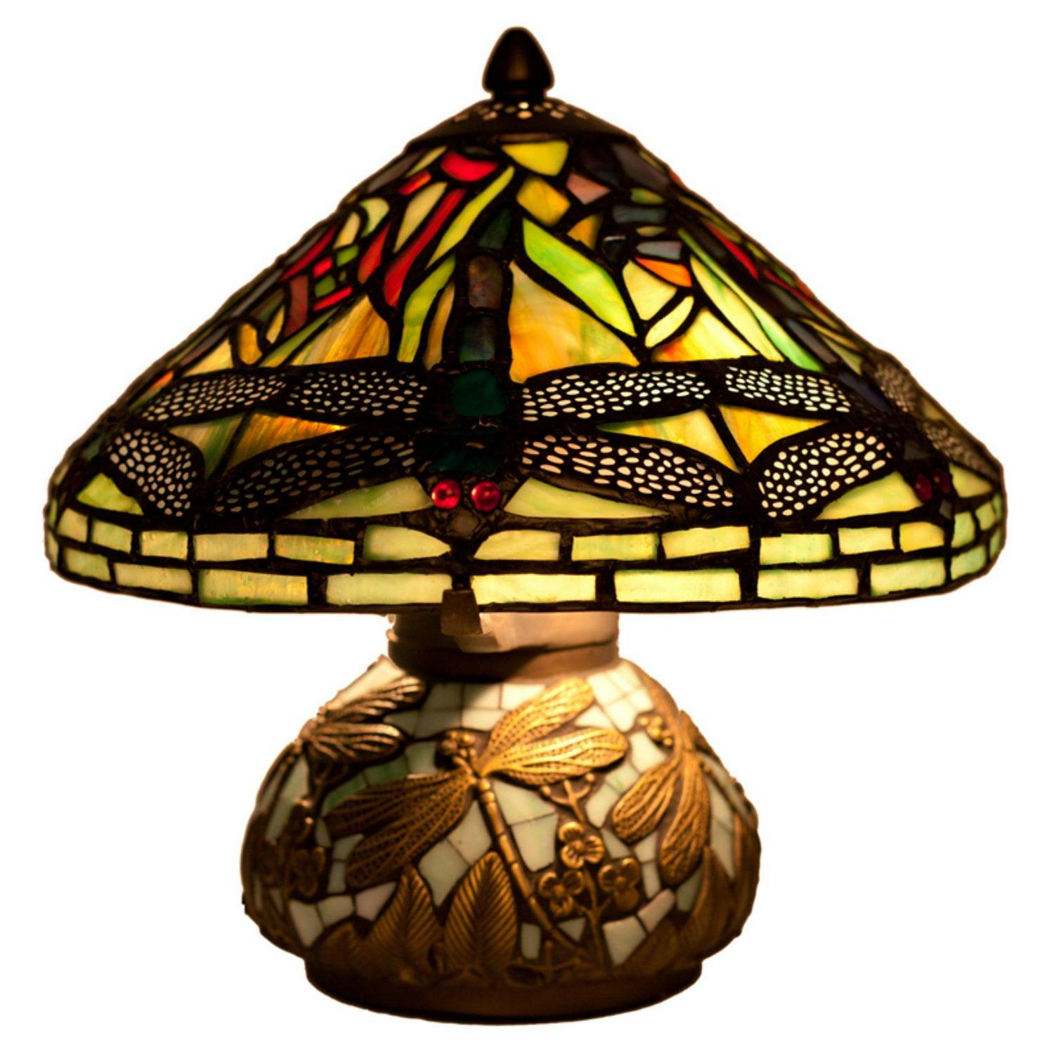 Beam a warm glow into your home with the River of Goods 9578 Stained Glass Dragonfly Table Lamp with Mosaic Base. A symbol of self-realization, the dragonfly delights on this adorable lamp with additional floral detail on a mosaic base. An ultra-long cord allows you to display it wherever you choose.