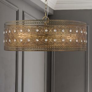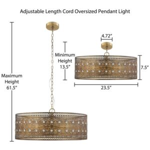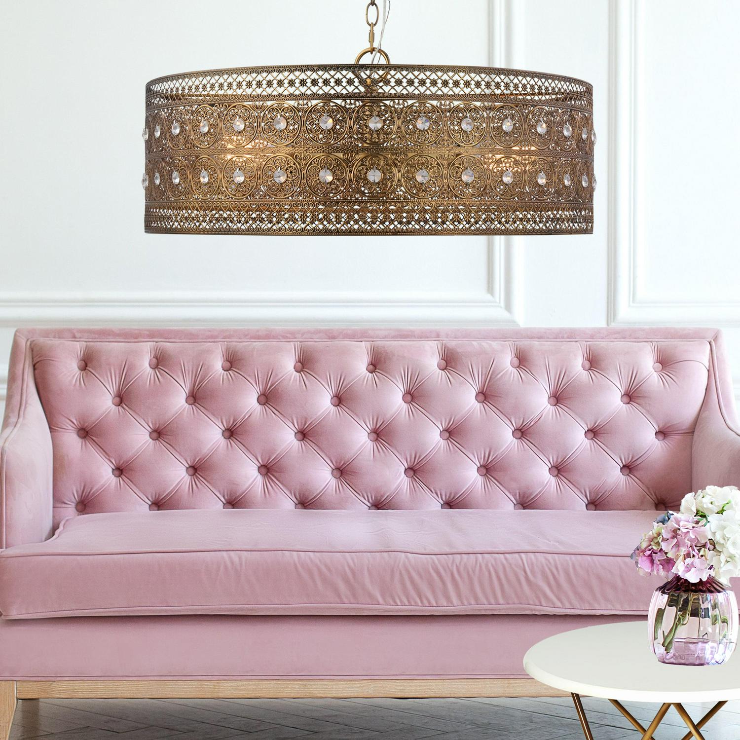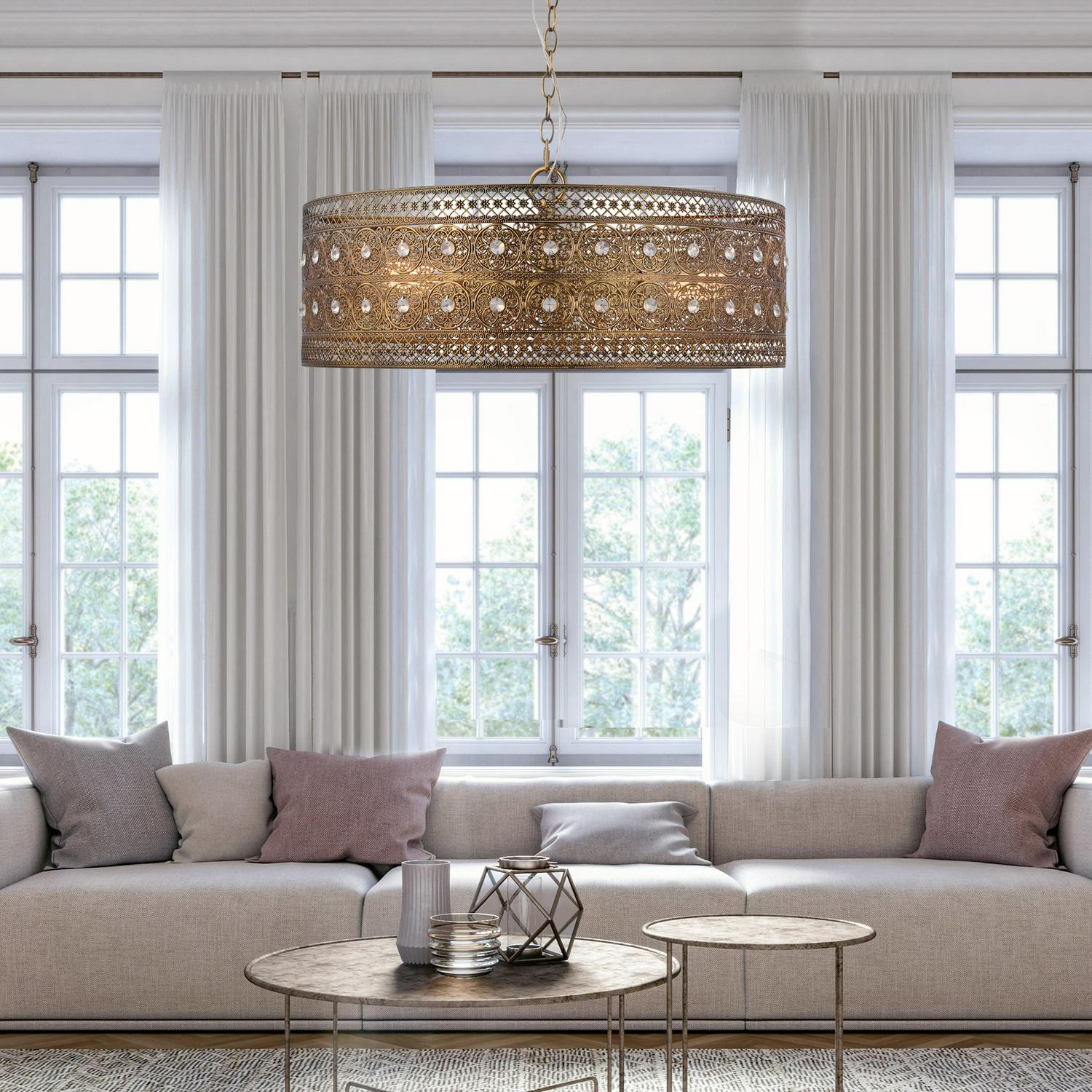 The River of Goods Monroe Crystal and Brass 3-Light Oversized Chandelier. Make a statement with this oversized brushed brass and K-9 crystal jeweled 3-light hanging chandelier. This 23.5 in. wide chandelier is perfect for traditional or glam décor styles. The shade features a double-layered medallion pattern, with 70 individual faceted clear K-9 crystal jewels within the shade. A luxurious piece for your dining room, living room or foyer.