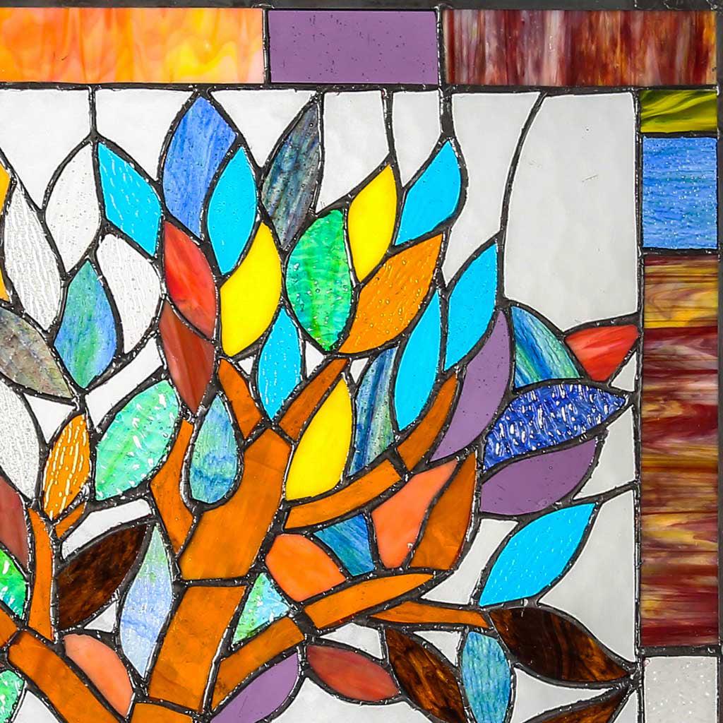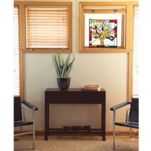 Showcase a natural theme with this Mystical World Tree stained glass panel hanging in your window. Light from the window adds vibrancy to the 131 pieces of colorful glass, and striated and rippled designs add a textured look to the design. The compact square shape makes this panel easy to hang without completely blocking the view from your window.