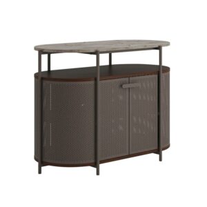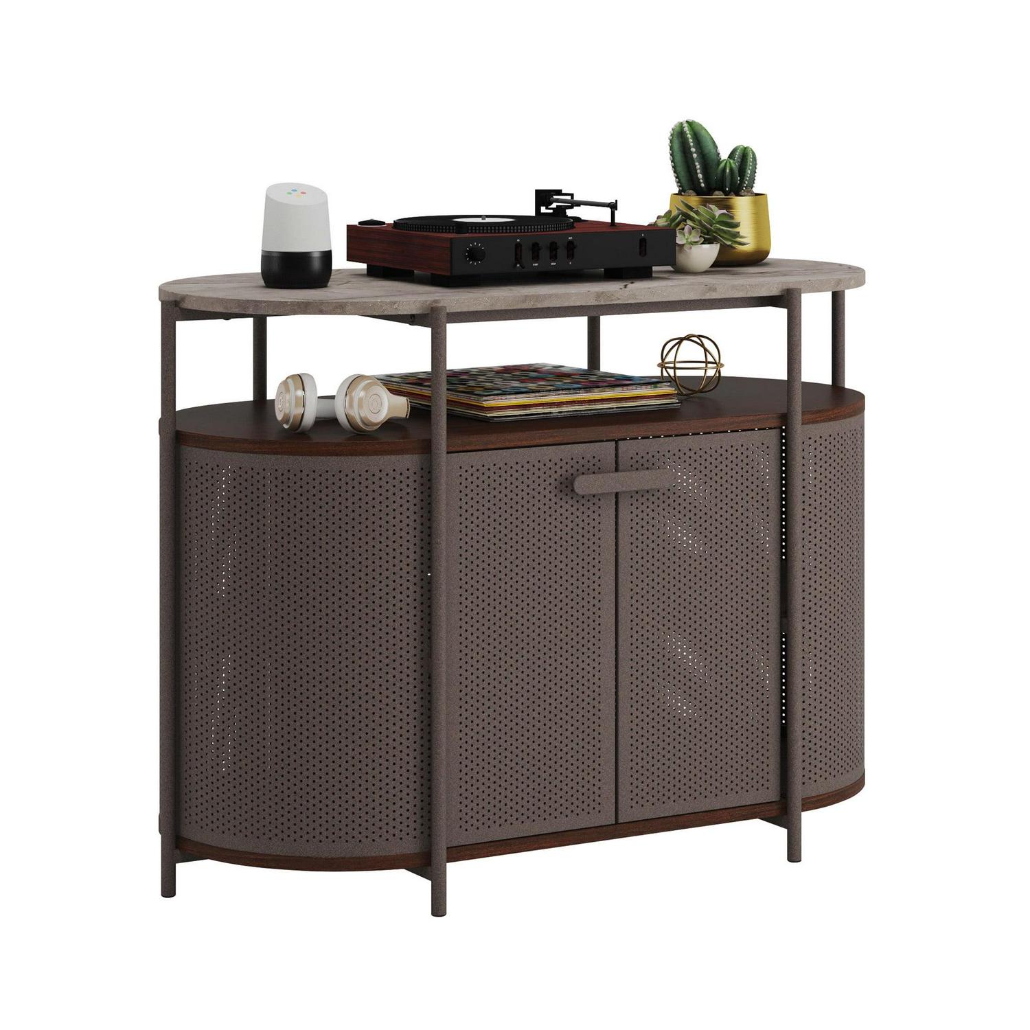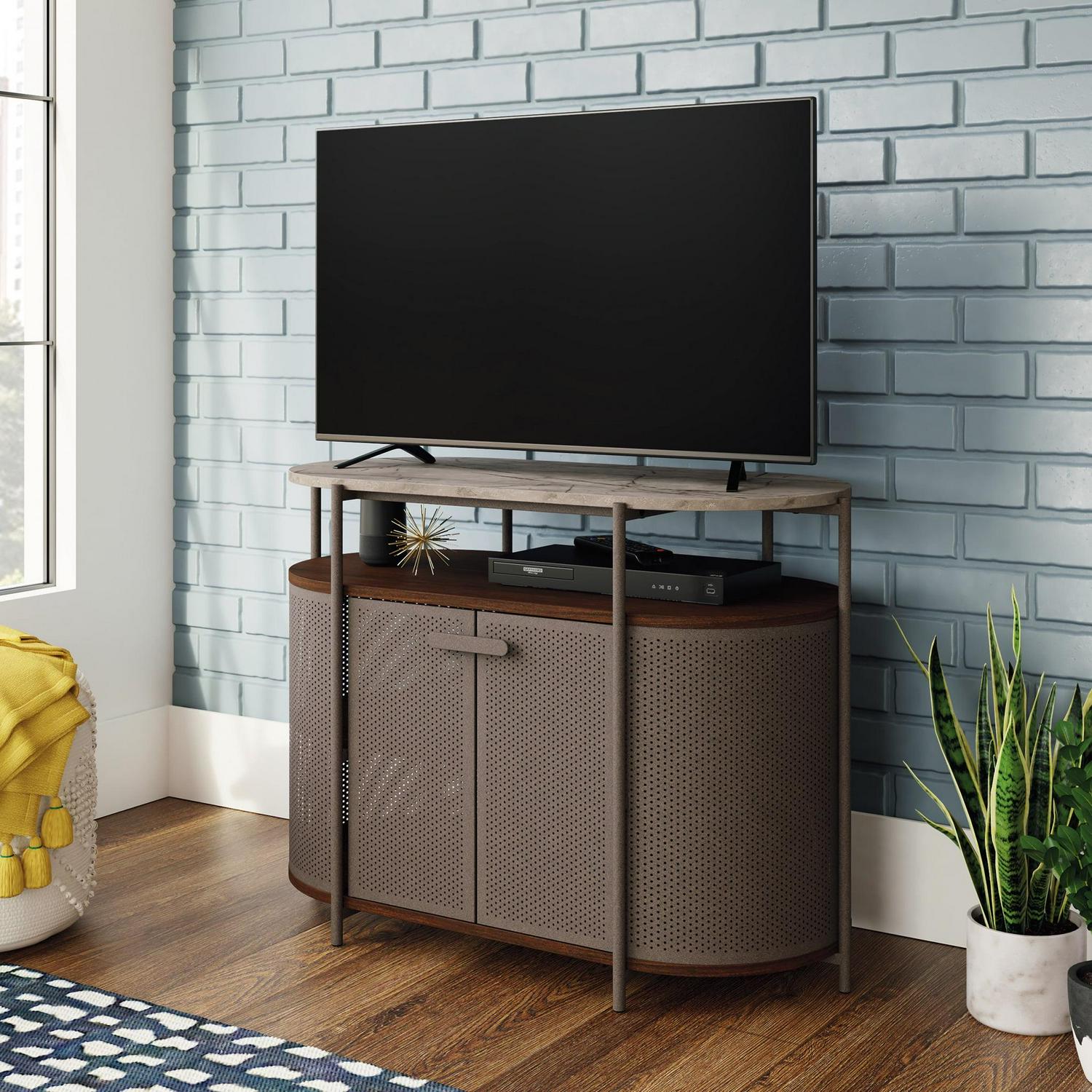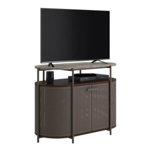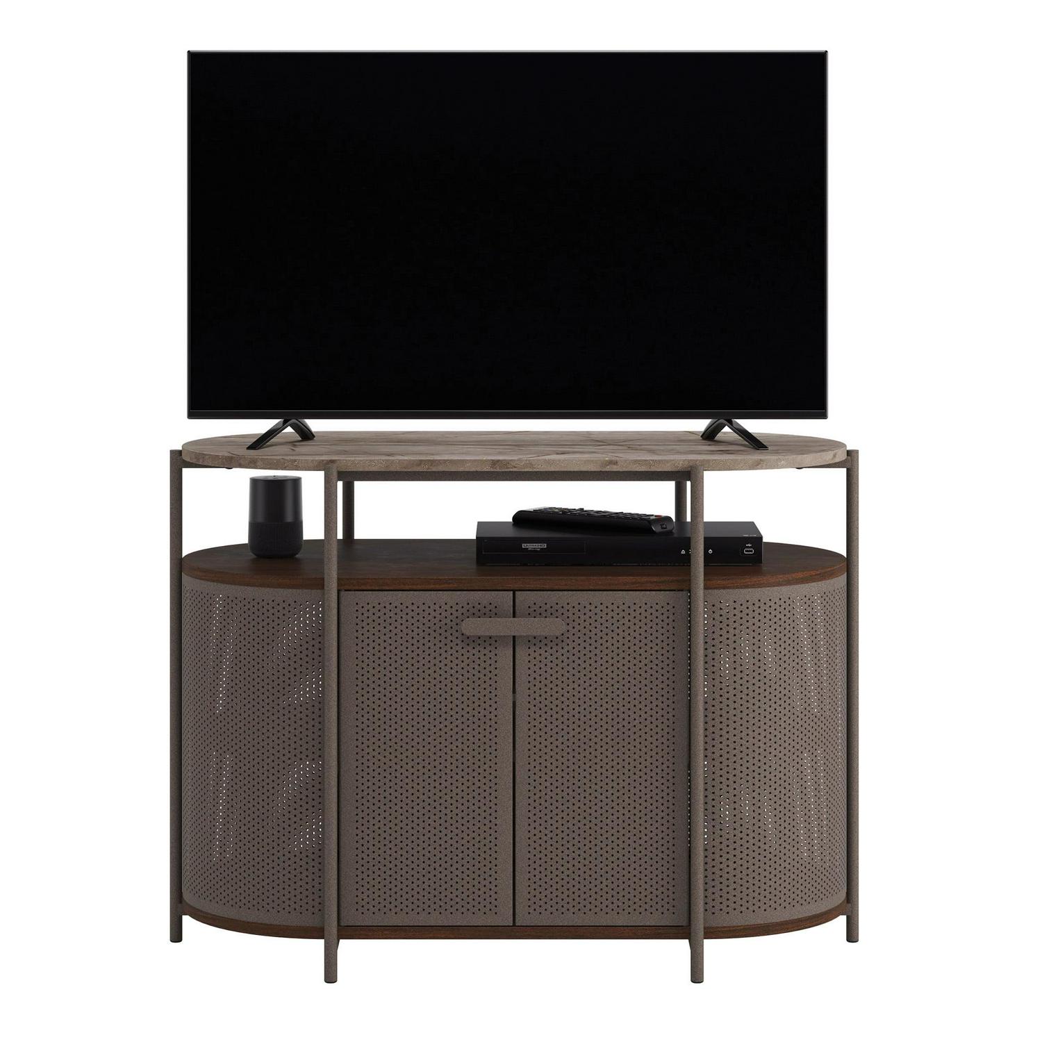 Every piece of furniture in your home should be brag-worthy show off the incredible style and inherent functionality of this metal TV stand. This TV stand accommodates up to a 40″ TV weighing 50 lbs. or less or creates extra display options for a lamp, thrift store finds, and your eclectic home decor. Open shelving under the top surface of this modern TV stand holds your audio/video equipment in a convenient, easy to reach space. This metal TV console features a textured, powder-coated metal frame for style and stability. Additionally, vintage perforated side panels and doors add interesting visual texture. This perforated media console is finished on all sides for versatile placement in any room of your home and looks good from any angle. This metal TV stand features a cord management system to keep your home tidy free of stubborn electronic cords. Finished in an Umber Wood with faux Deco Stone top surface accents, you won’t be able to stop talking about this media stand.