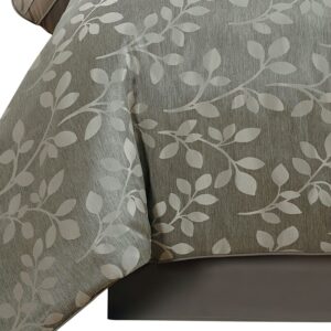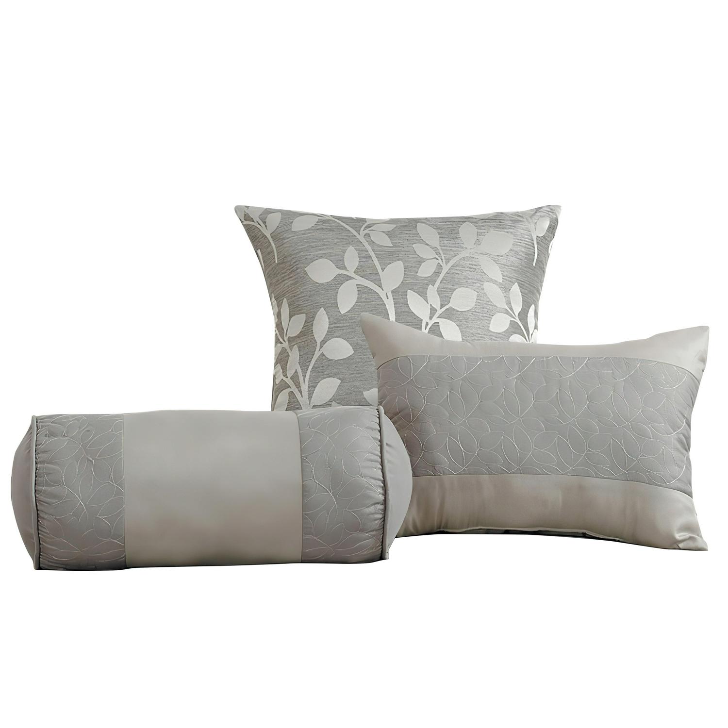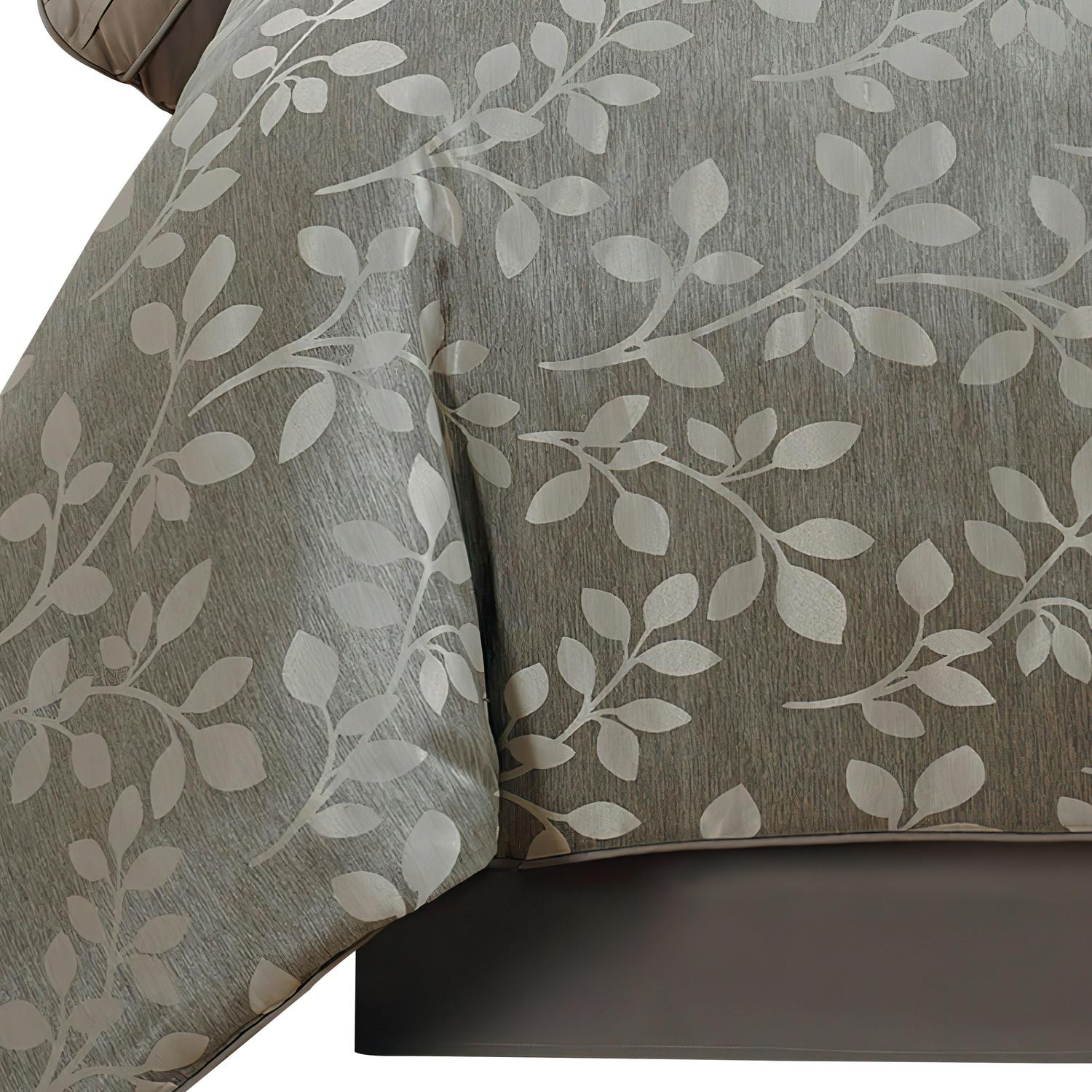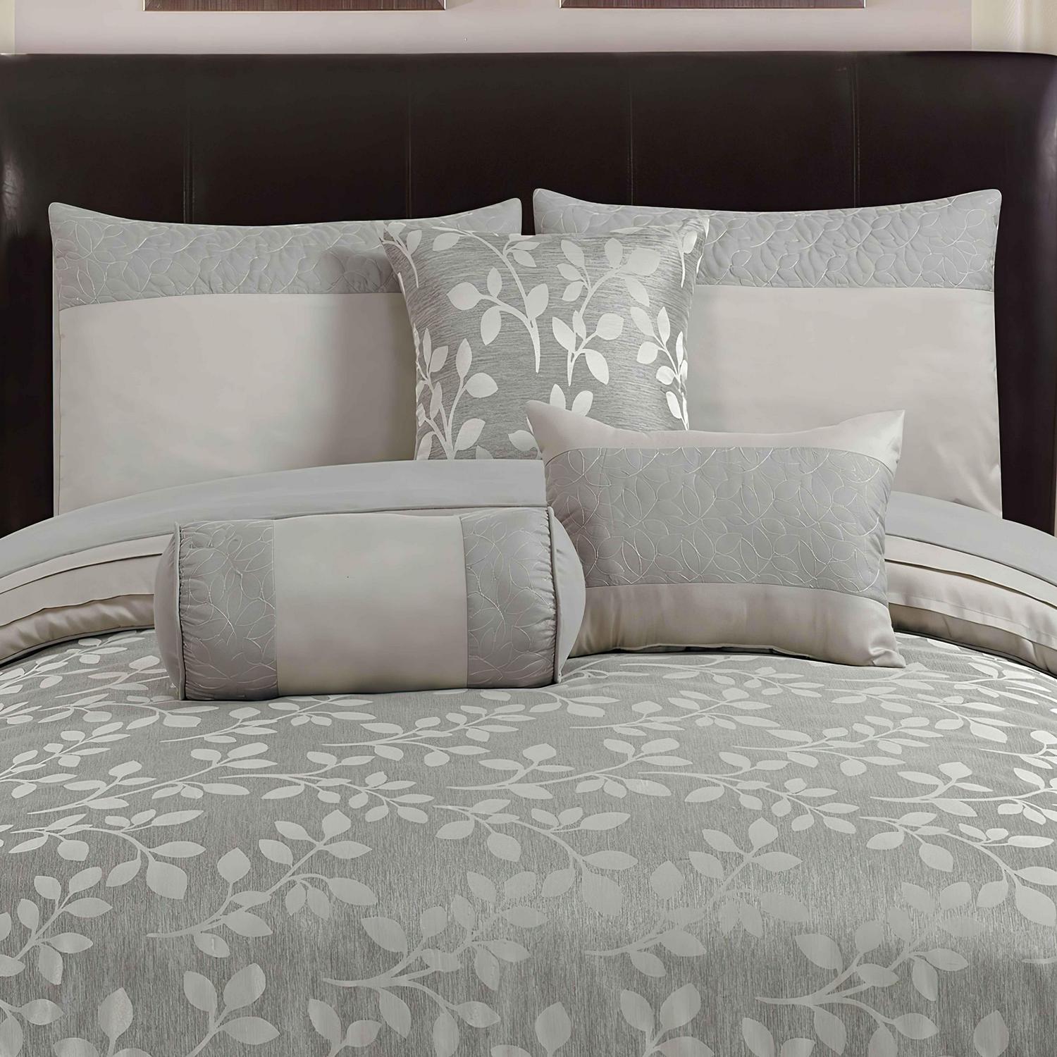 Riverbrook Home brings you the Selvy 7 Piece 100% Polyester Queen Comforter Set, offering the ultimate in affordable luxury. Muted grey and silver give this elegant comforter set a quiet style with a contemporary takes on old world elegance. The jacquard leaf pattern adorns the comforter and one of the decorative pillows. The coordinating pillow shams add a stunning quilted texture which can also be seen on 2 additional bonus decorative pillows adding style, color, and unique shapes. This 7 Piece Comforter Set includes: 1 Comforter, 2 King Shams, 2 Euro Shams, 1 Bed Skirt, and 3 Bonus Embellished Decorative Pillows completing the set with everything you’ll need to transform your room. Polyester fabric and fill. Machine Washable; follow care instructions on each piece for best results. The digital images we display have the most accurate color possible. However, due to differences in computer monitors, we cannot be responsible for variations in color between the actual product and your screen. Selvy 7 Piece comforter Set is imported.