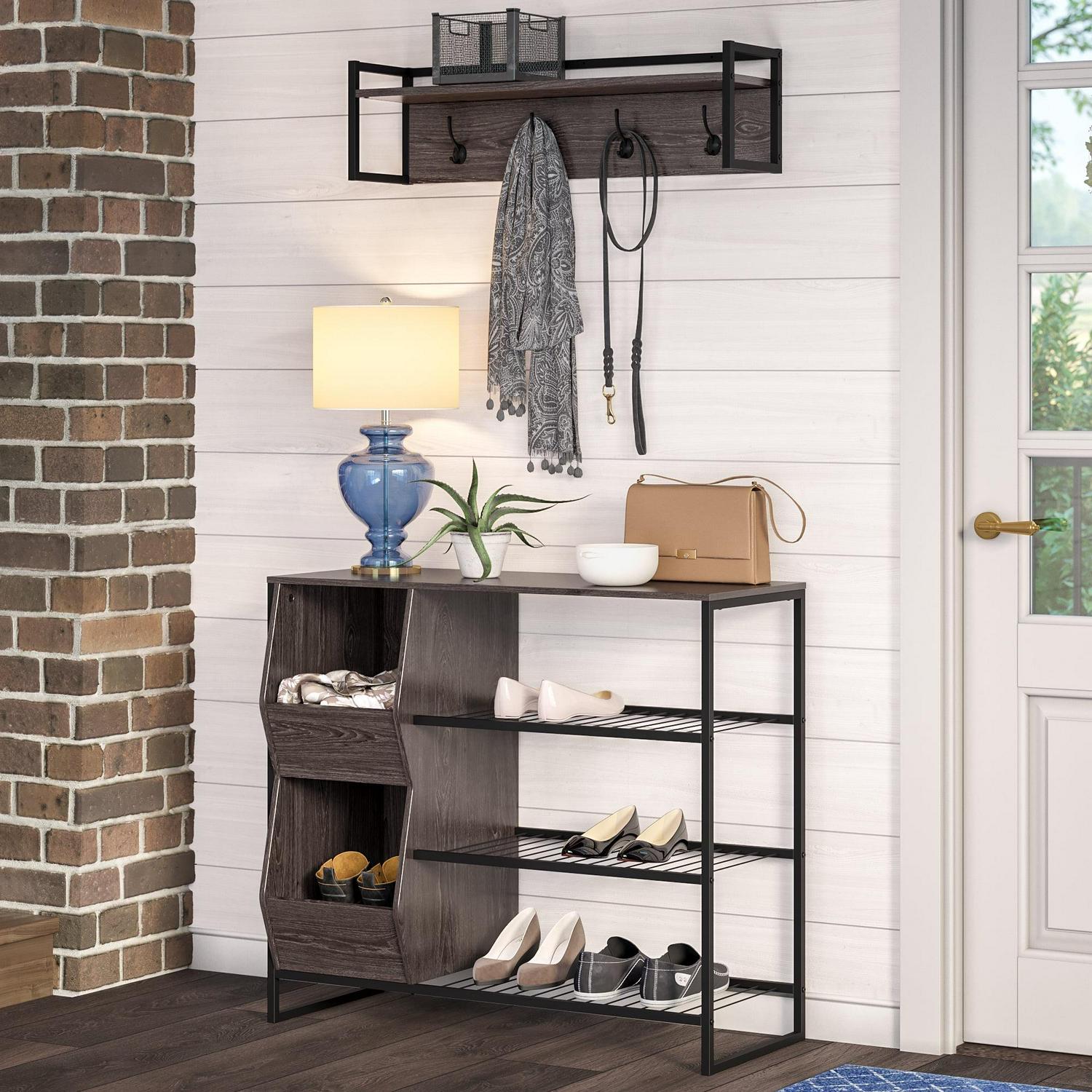This modern shoe rack features two veggie bins and three shelves for ample, versatile storage in your entryway. Use the three shelves to hold up to nine pairs of shoes and store extra entryway clutter in the open veggie bins, including handbags, scarves, gloves, kid’s shoes, hats and more. Weathered woodgrain and black metal frames add contemporary charm and order to your space. Anchors to the wall for added stability. Tidy up and add contemporary style to your entryway with the entire metal frame Afton Collection. Shoe capacity on racks: 6-9 pairs