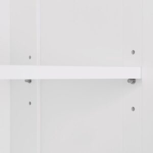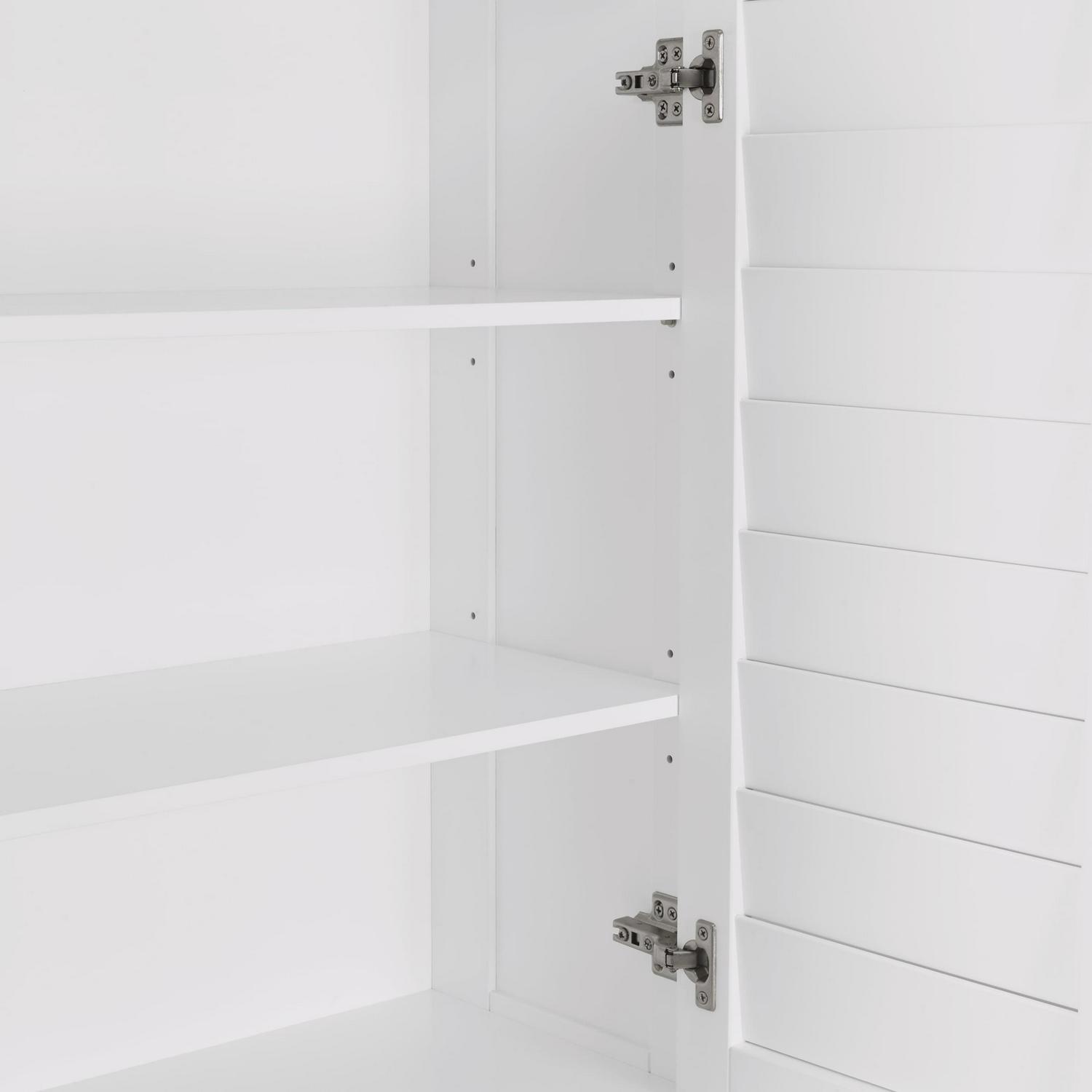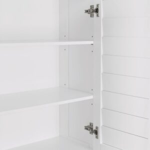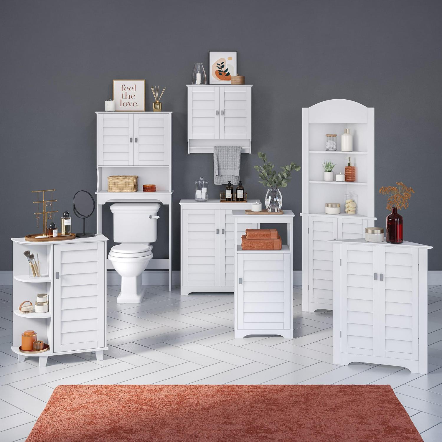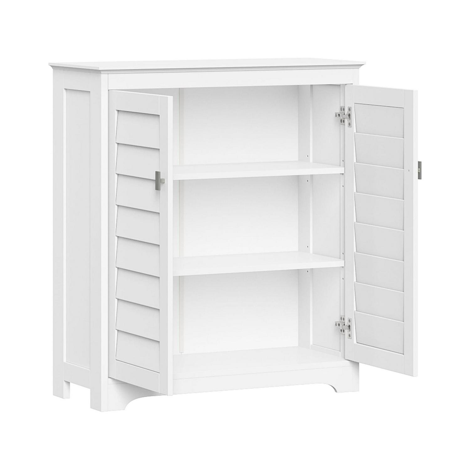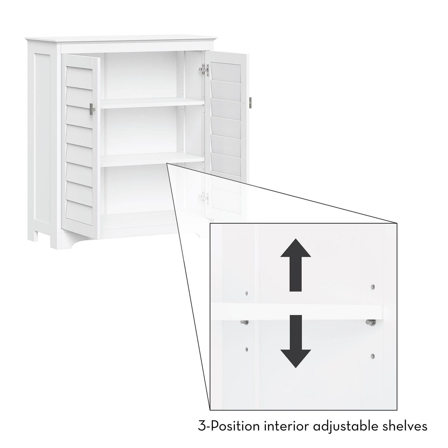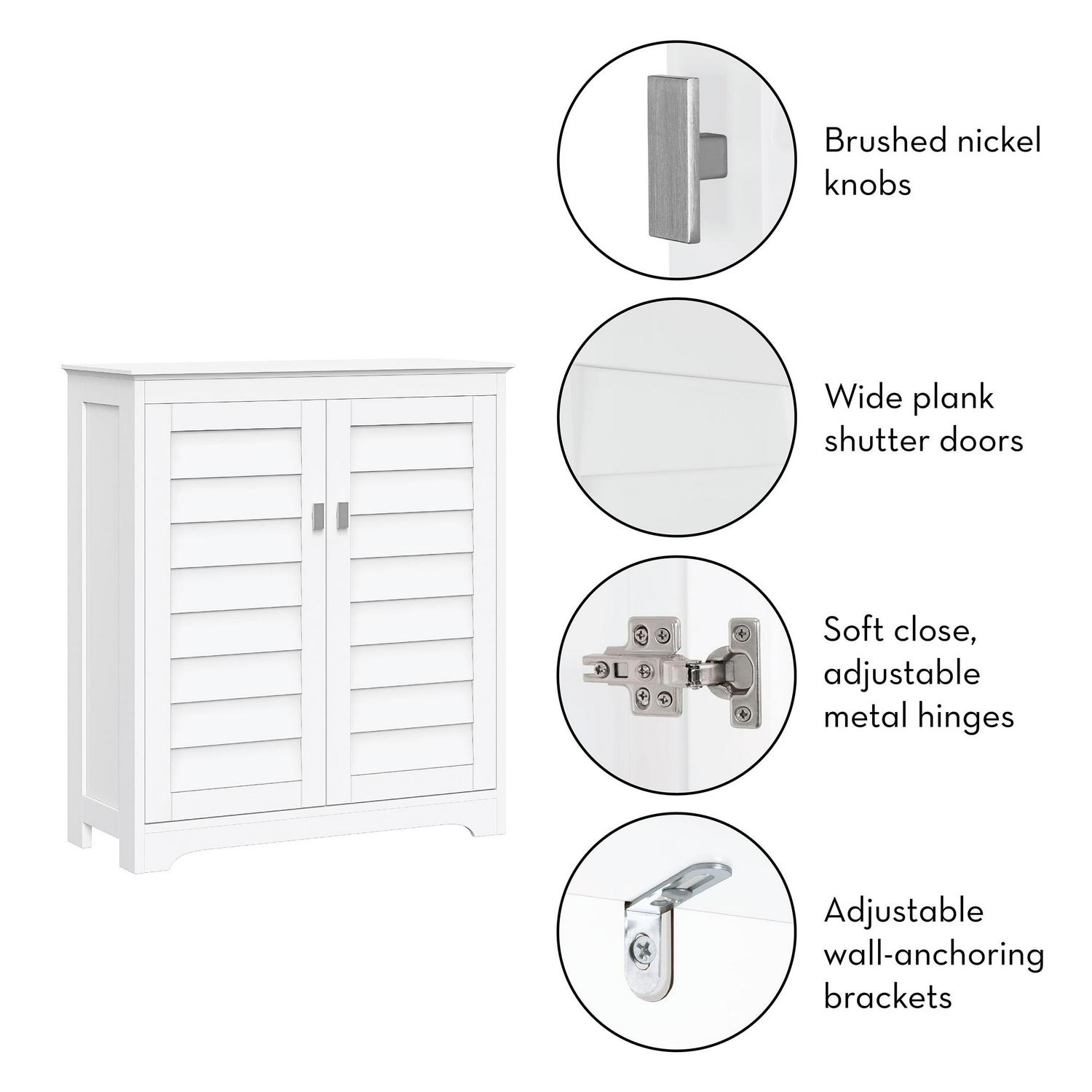 Add stylish storage to any room with this shutter door floor cabinet. Featuring two plantation-style shutter doors and rectangular, brushed nickel knobs, this storage cabinet makes a timeless addition to bathrooms, laundry rooms, living rooms and more. Utilize the open top shelf to display your favorite decorative items, then open the double doors to reveal two interior adjustable shelves that move up, down or out for a storage space customized to your needs. Perfect for concealing toiletries and extra towels in the bathroom, or books and children s toys in the living room. Doors close softly with adjustable, self-closing hinges for even door alignment and no loud slamming. Includes detailed assembly instructions and wall mounting hardware for added safety. Give your home an organizational makeover with the entire Brookfield Collection.