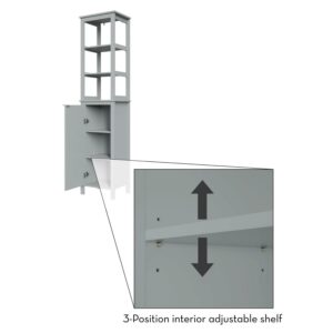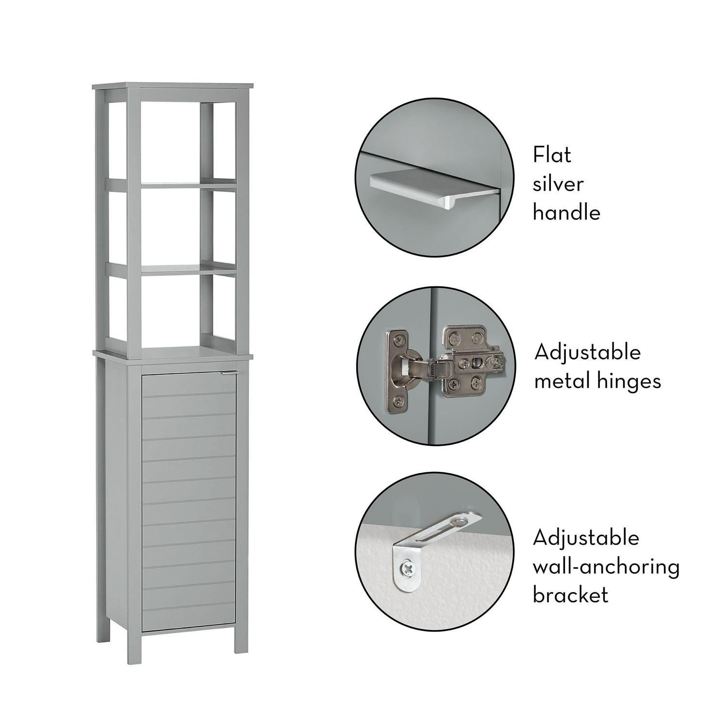 Give your space a clean, new look with RiverRidge Madison Collection Linen Tower with 3 Open Shelves in a neutral gray tone. Features three fixed shelves above and three shelves behind cabinet door (two fixed and one adjustable). Maximize storage space and complete the set with coordinating Madison Collection furniture pieces. Additional dimensions: open shelves: 11.75-in. W x 11.44-in. D x 9.44-in. H, space between open shelves: 10.88-in. H, interior shelves: 11.75-in. W x 10.75-in. D, interior fixed shelf: 10.88-in. H, and space between two bottom interior shelves: adjustable.