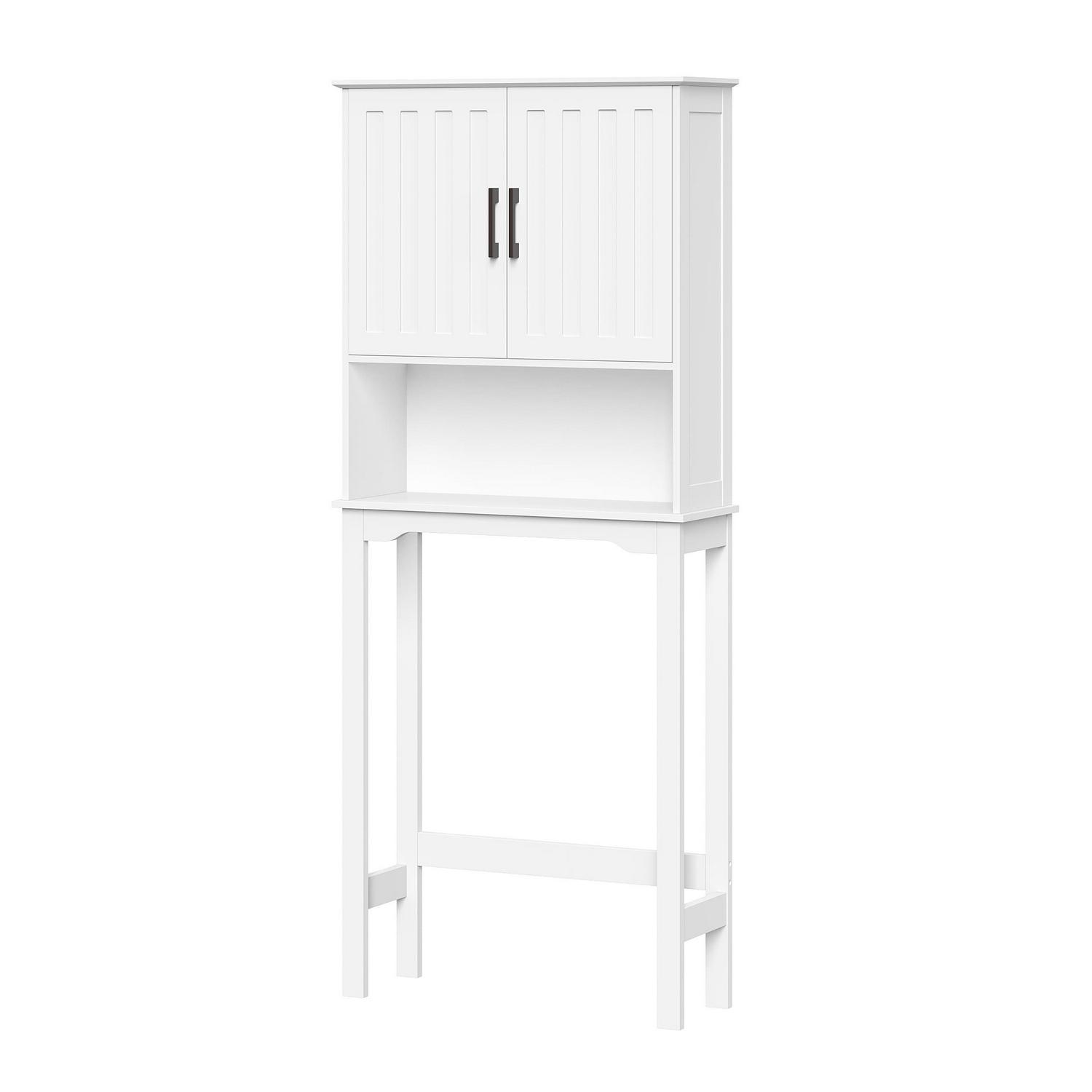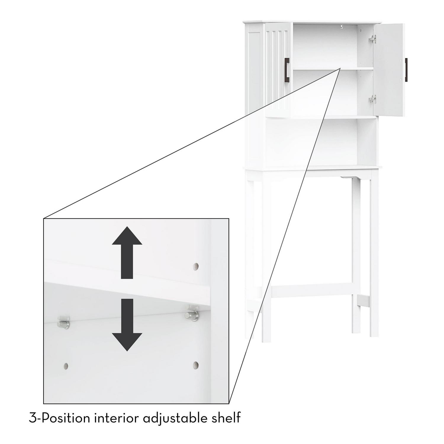 Make use of open space above the toilet to hide bathroom essentials and display favorite décor pieces with this classically designed spacesaver. Includes one fixed and one adjustable shelf behind double doors and one open, fixed shelf. Cabinet doors feature vertical inset styling and matte black handles for a clean, modern look. Includes easy-to-follow assembly instructions and fits over most standard toilets with a toilet clearance height of 32.4. Create a stylish organizational system in your bathroom with the entire RiverRidge Monroe Collection.