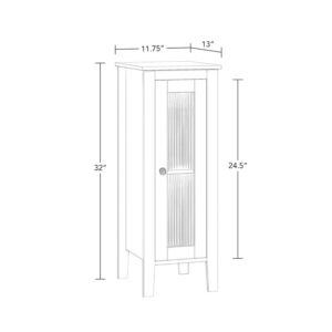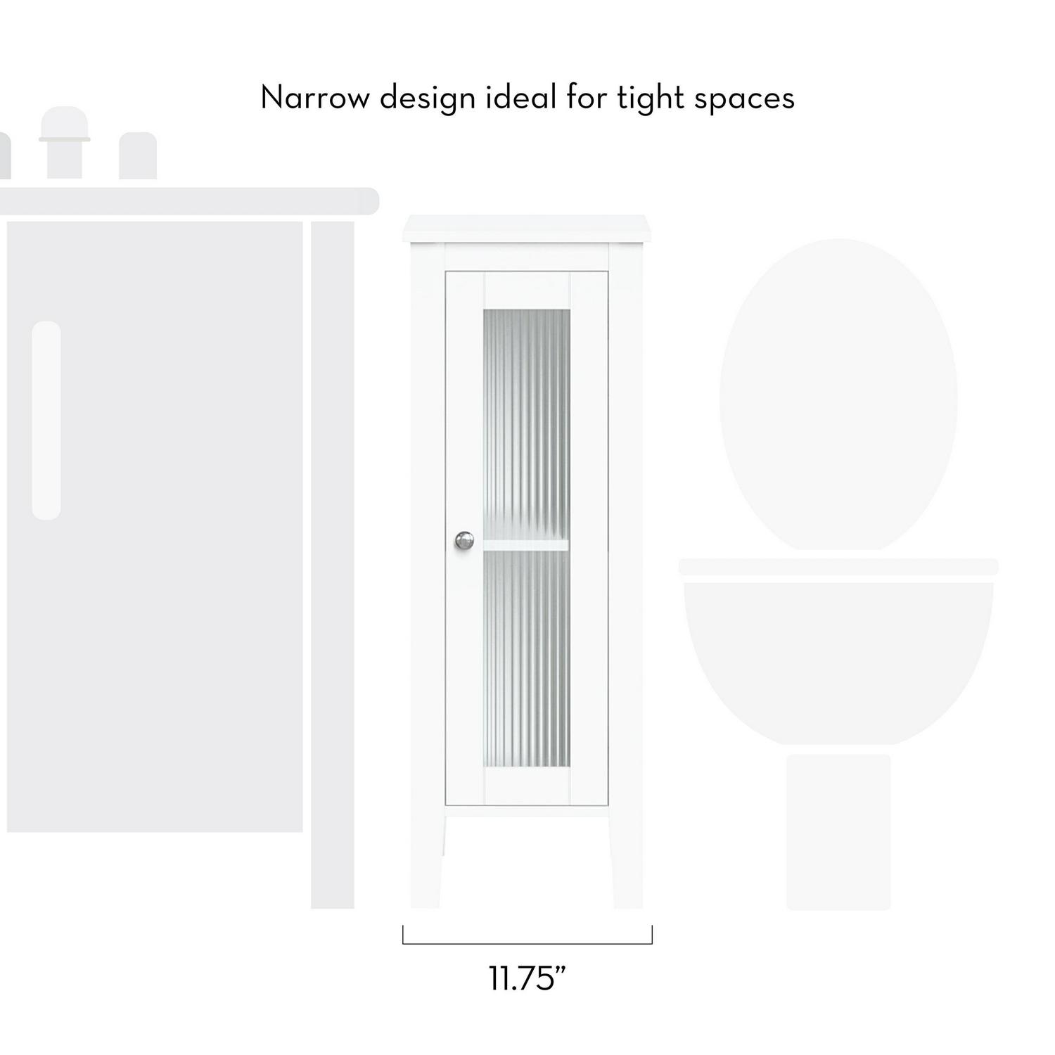 For tight spaces needing stylish storage, this slim, single door floor cabinet makes the perfect addition to bathrooms, laundry rooms and any other room in the home. Open the reeded glass door and place extra hand towels, cleaning supplies and more on the adjustable interior shelf, then allow the door to close quietly with its soft-close hinges. The top open shelf is perfect for displaying your favorite home décor items or placing your most-used items for easy access. With its smooth, white painted finish and polished silver doorknob, this cabinet boasts timeless, classic style that adds a bit of extra storage space to rooms with any décor theme. Includes instructions for easy assembly and secures to the wall with an adjustable anchor bracket for added stability. Give your space an organizational makeover with the entire RiverRidge Home Prescott Collection.