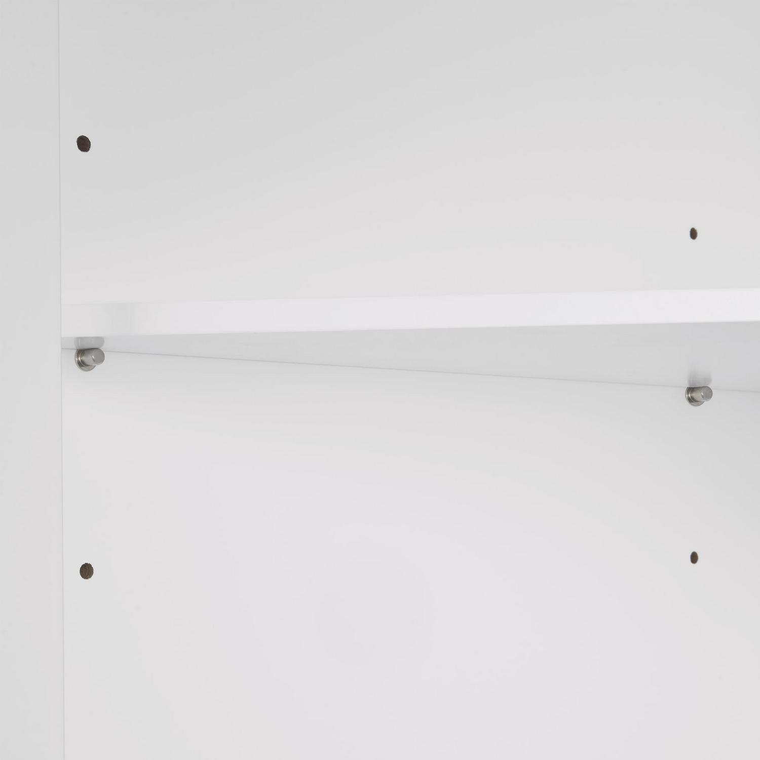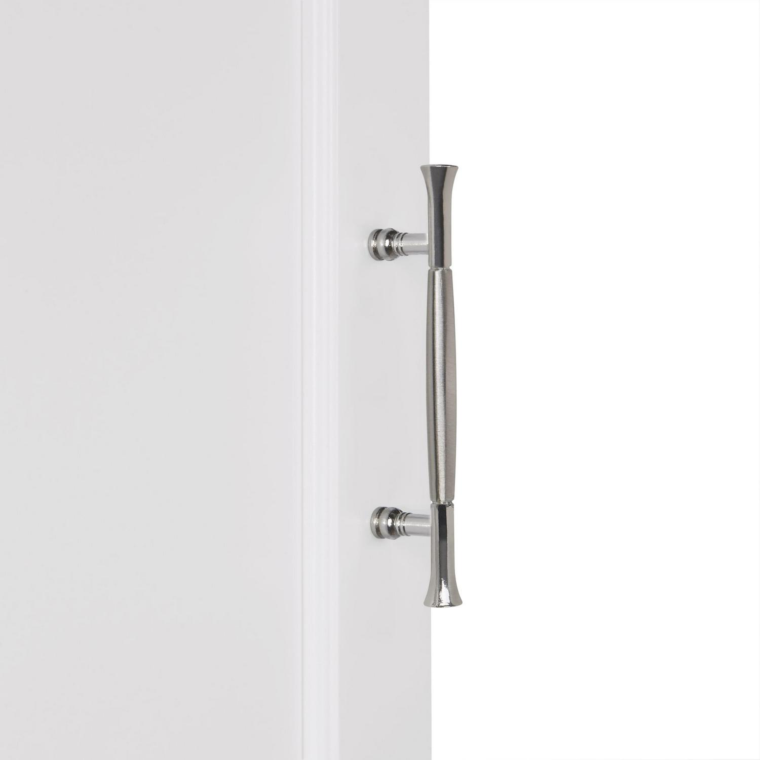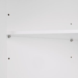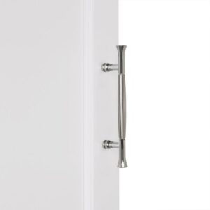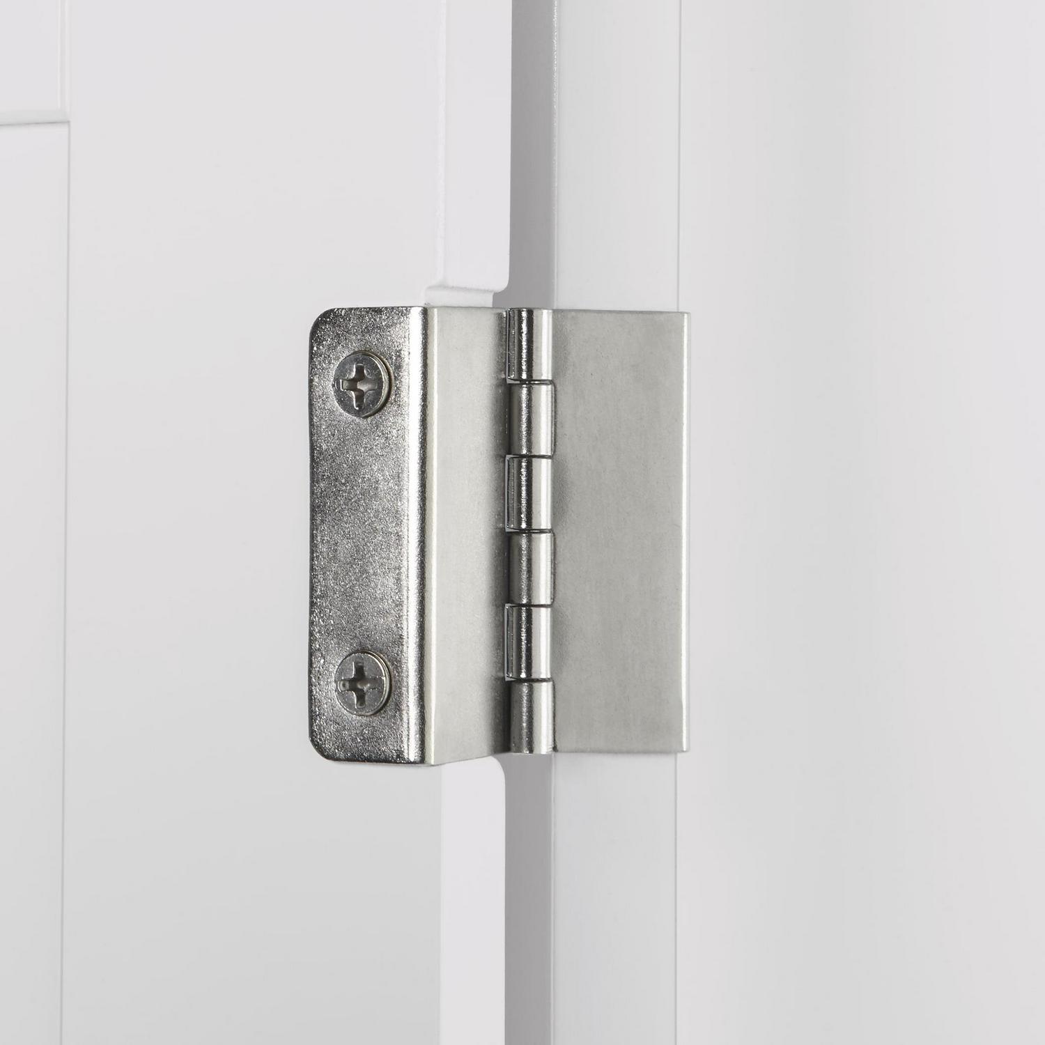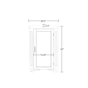 Maximize storage capacity in the bathroom or laundry room with the RiverRidge Somerset Single Door Corner Cabinet that features a classic design and attractive detailing such as inset doors and side panels, coved top shelf and two-tone satin/mirror finish handles. Additional dimensions: top shelf: 14.5 L x 20.5 W x 13.38 D, overall cabinet interior: 17.75 W x 11 D x 27.5 H, interior shelves: 17.75 W x 11 D, space between interior shelves: adjustable (10.88 – 16.13 )