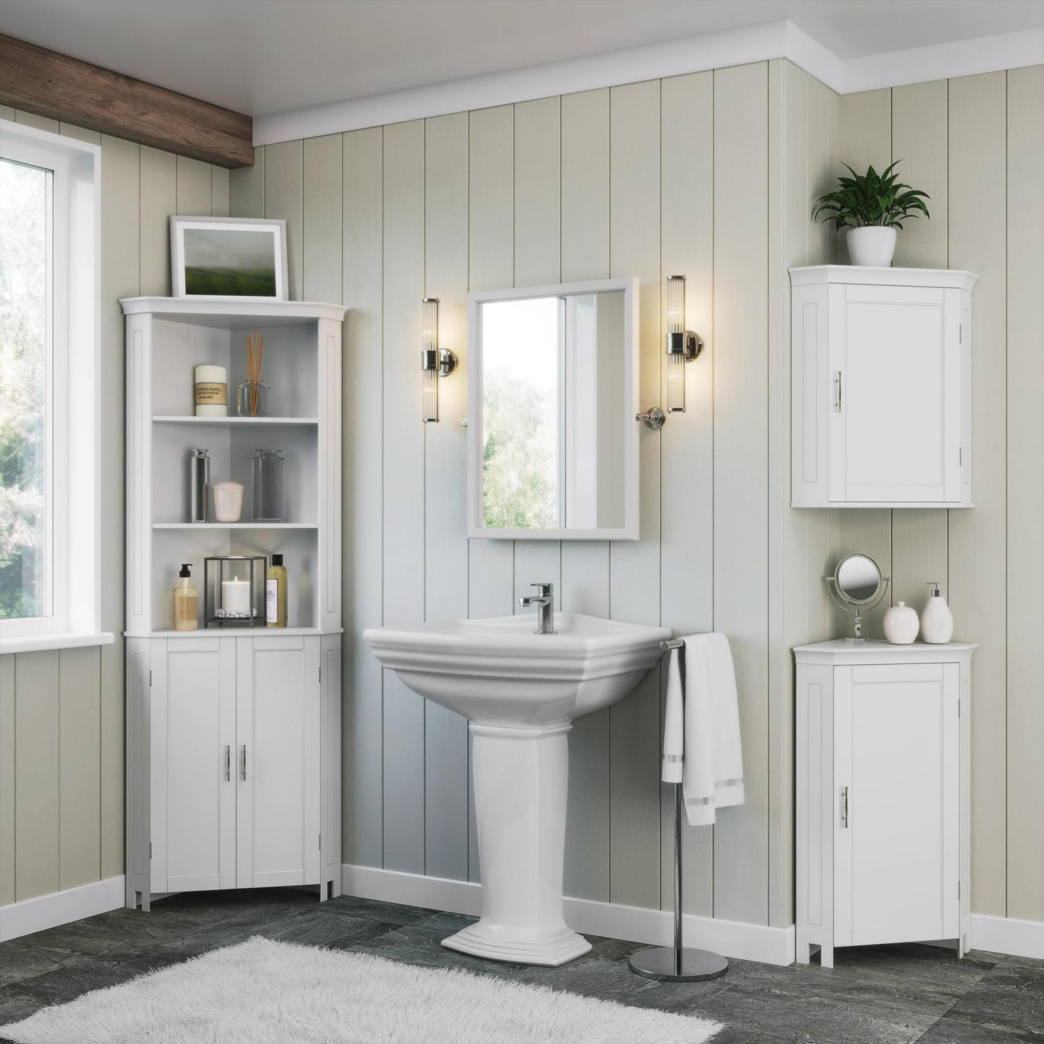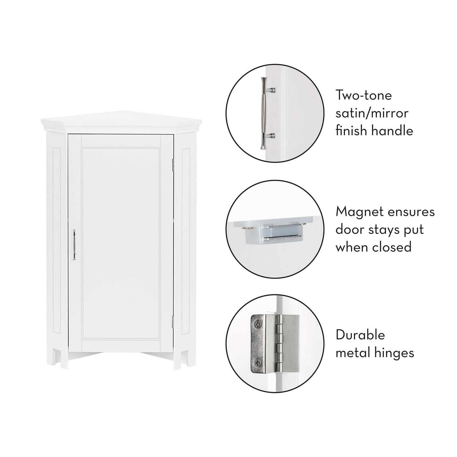 Assembled dimensions: 14.5-in. L x 20.5-in. W x 32-in. H; Features one interior adjustable shelf, perfect for storing extra toiletries such as toilet paper, wash cloths, soaps and more; Petite corner cabinet maximizes storage in small spaces; Anchors to the wall for added stability; Give the bathroom a completely new look with additional Somerset Collection items.; Constructed of Painted MDF; Assembly Required