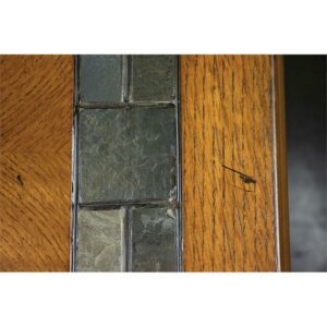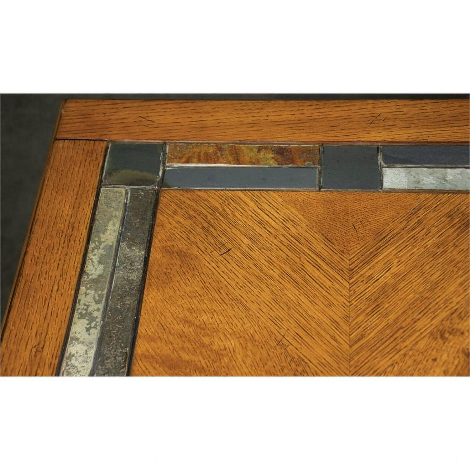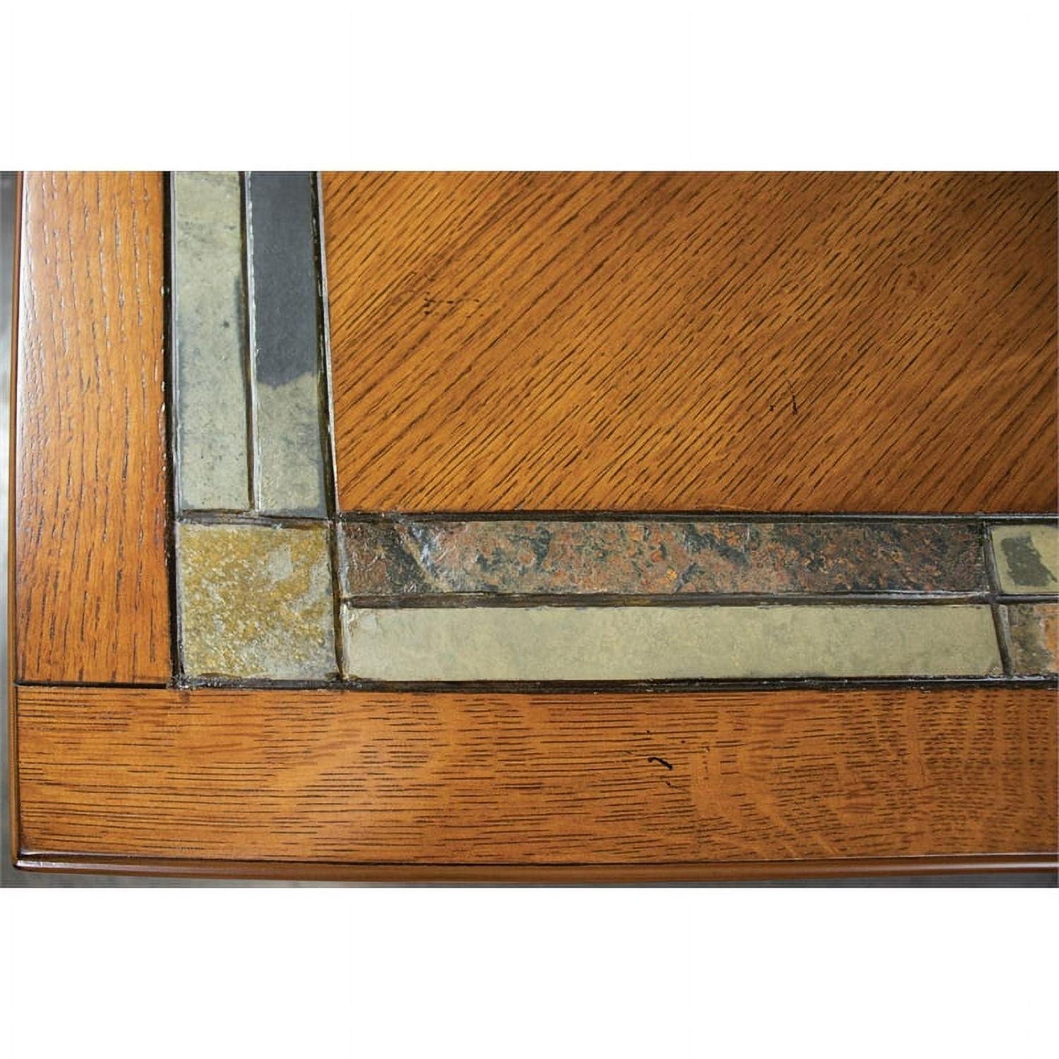 The veneer panel insert and slate tile border on the top of the Riverside Craftsman Home Chair Side Table provide a gorgeous accent for any room in your home. Constructed from hardwood solids with oak veneers, this table has an Americana Oak finish that gives it an aged, elegant look. The fixed bottom shelf is perfect for adding a decorative accent, and this chair side table looks great on its own or with the rest of the Craftsman Home collection (other items sold separately).
