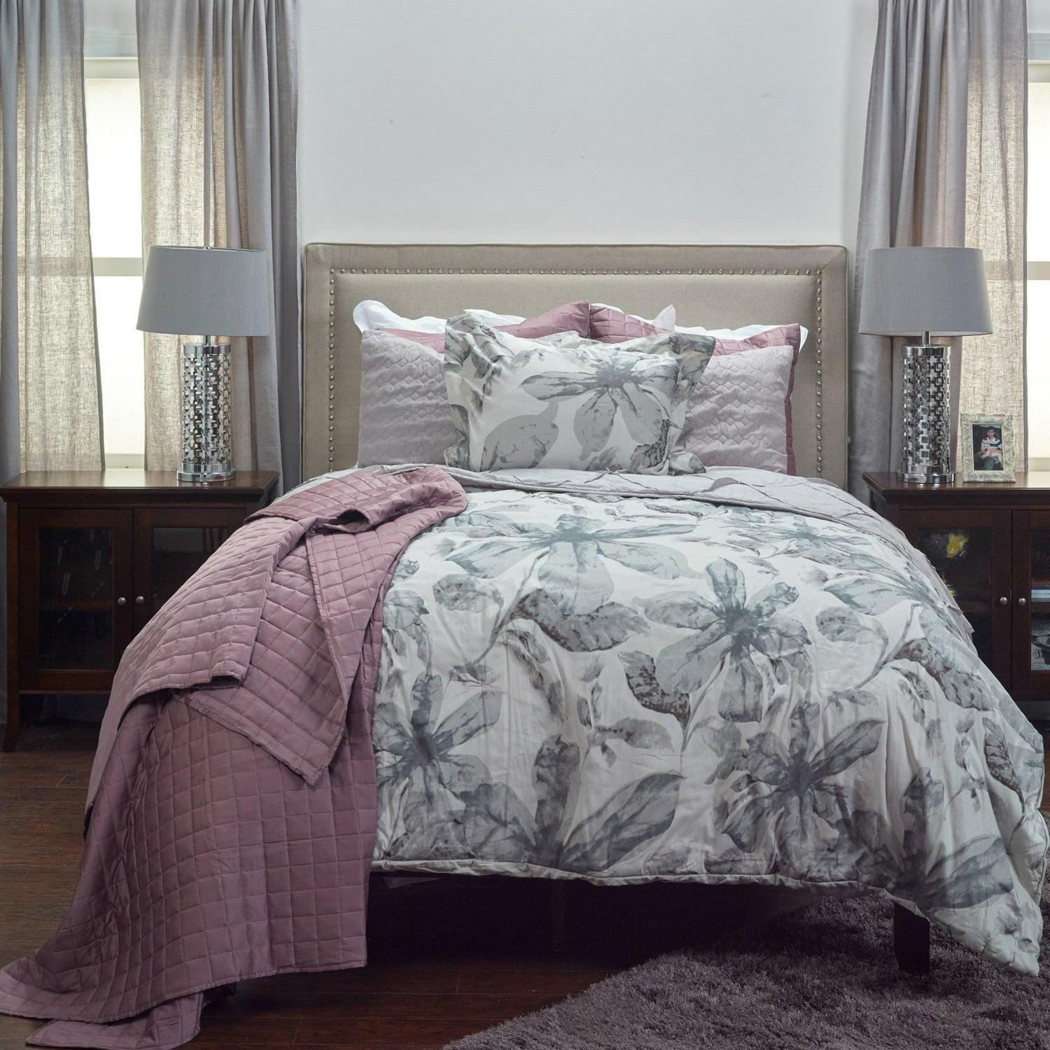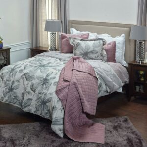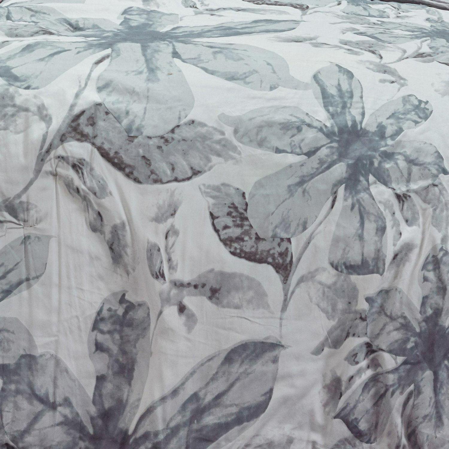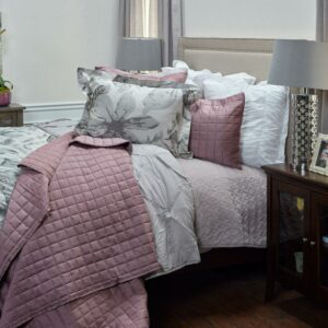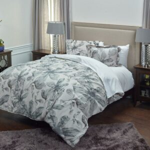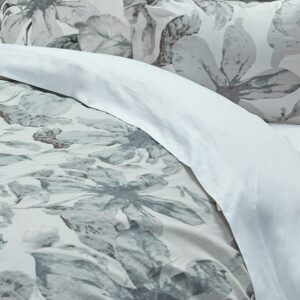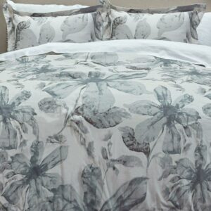 Lark Dress, the bed three piece bedding ensemble is truly a piece of artwork. Transforming petals, leaves and in the center pistols of the blossoms of the flowers brings this impressionistic bedding ensemble to life. The use of variations of silver and grey makes this a stunning choice for either your master suite or guest room.