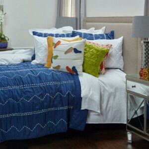 Oh I want to travel the world, climb every mountain, sail the open seas. Do it all . . . . twice at least. Snuggle into Sawyer. The global traveler in all of us is awakened by the ivory cotton accent hand stitched patterning of this delightfully adventurous quilt.