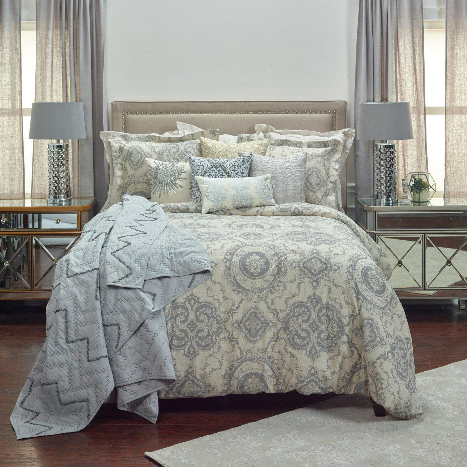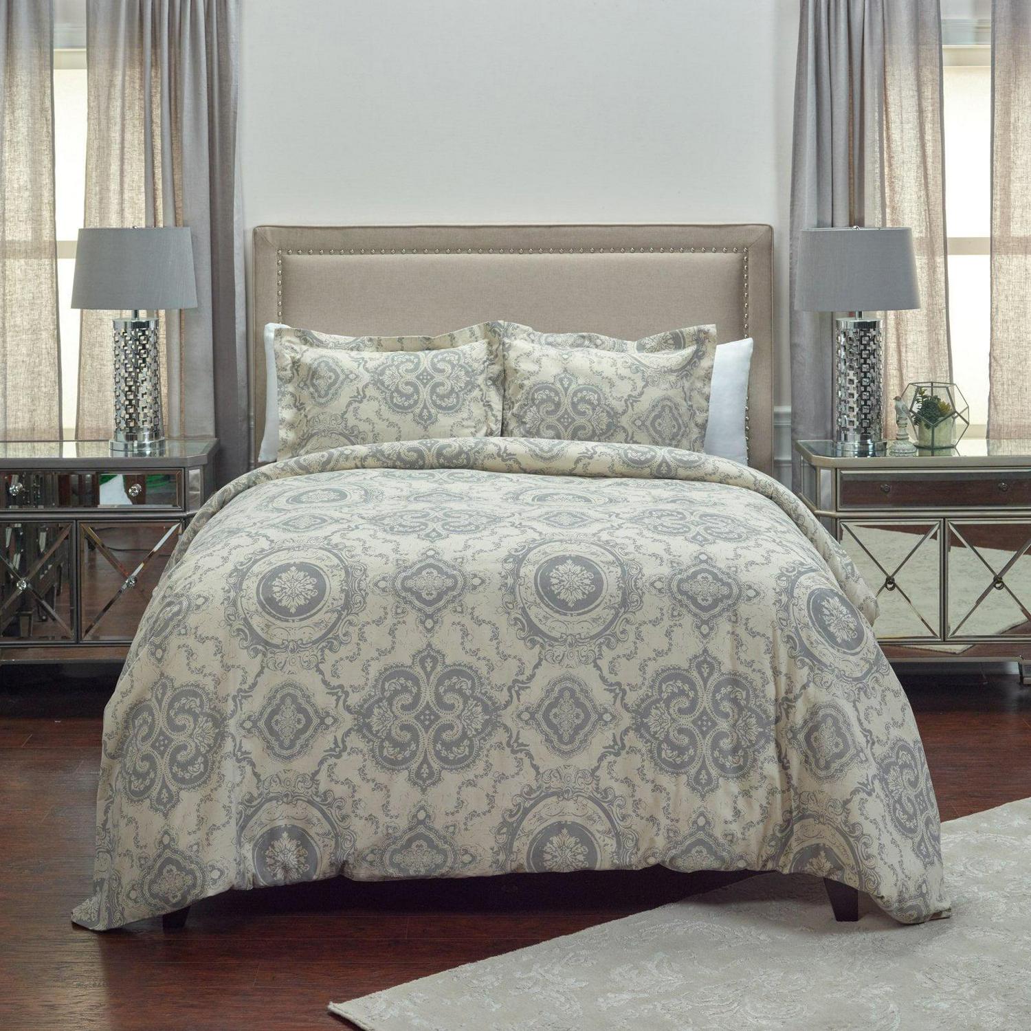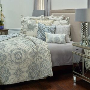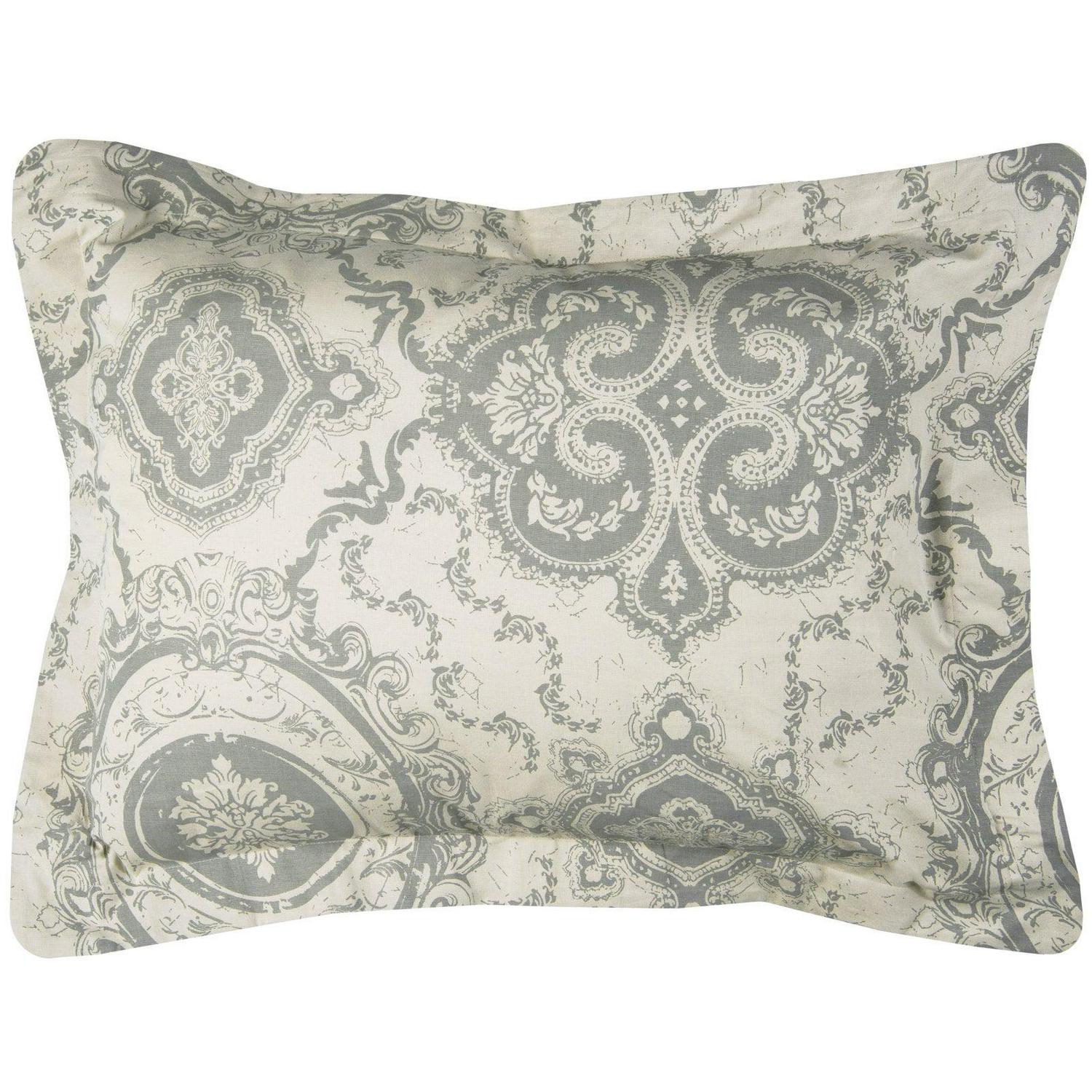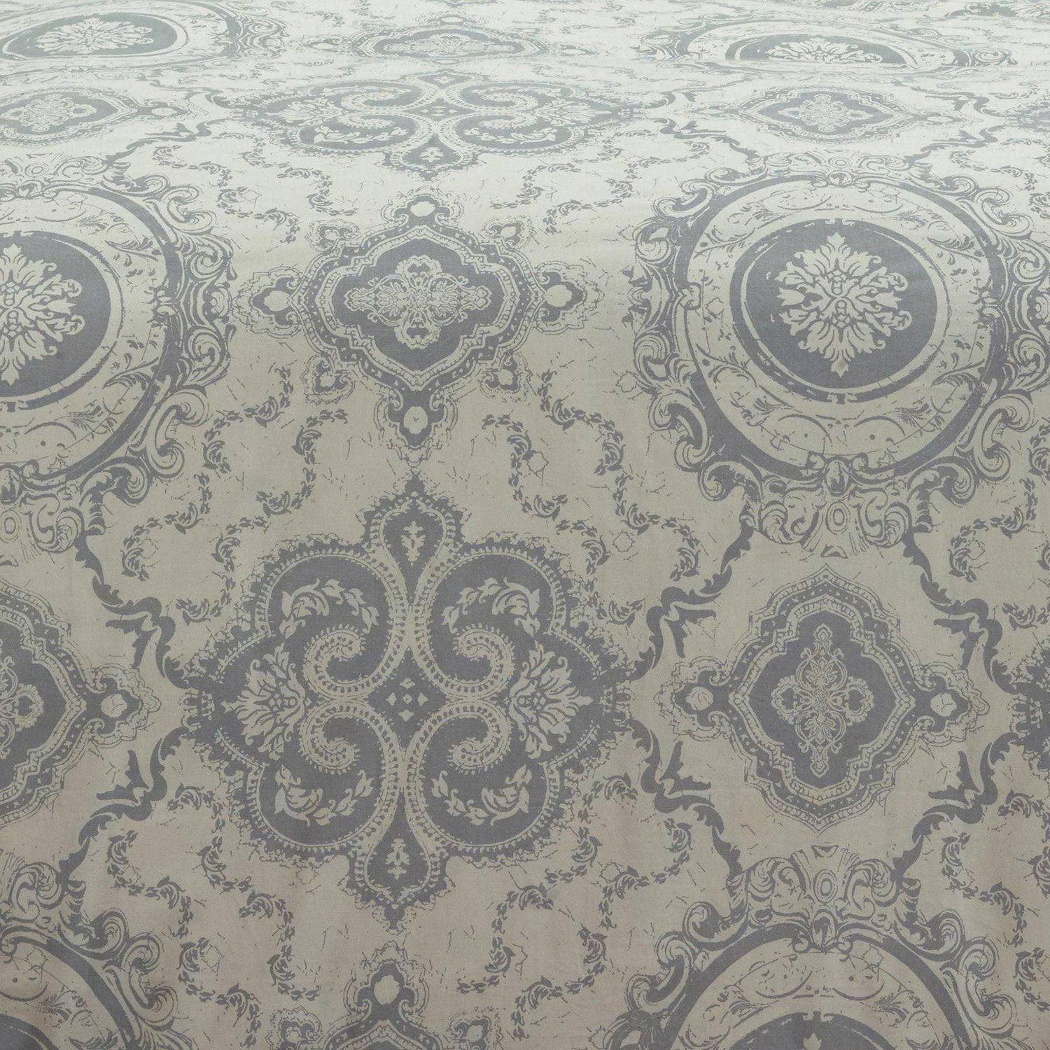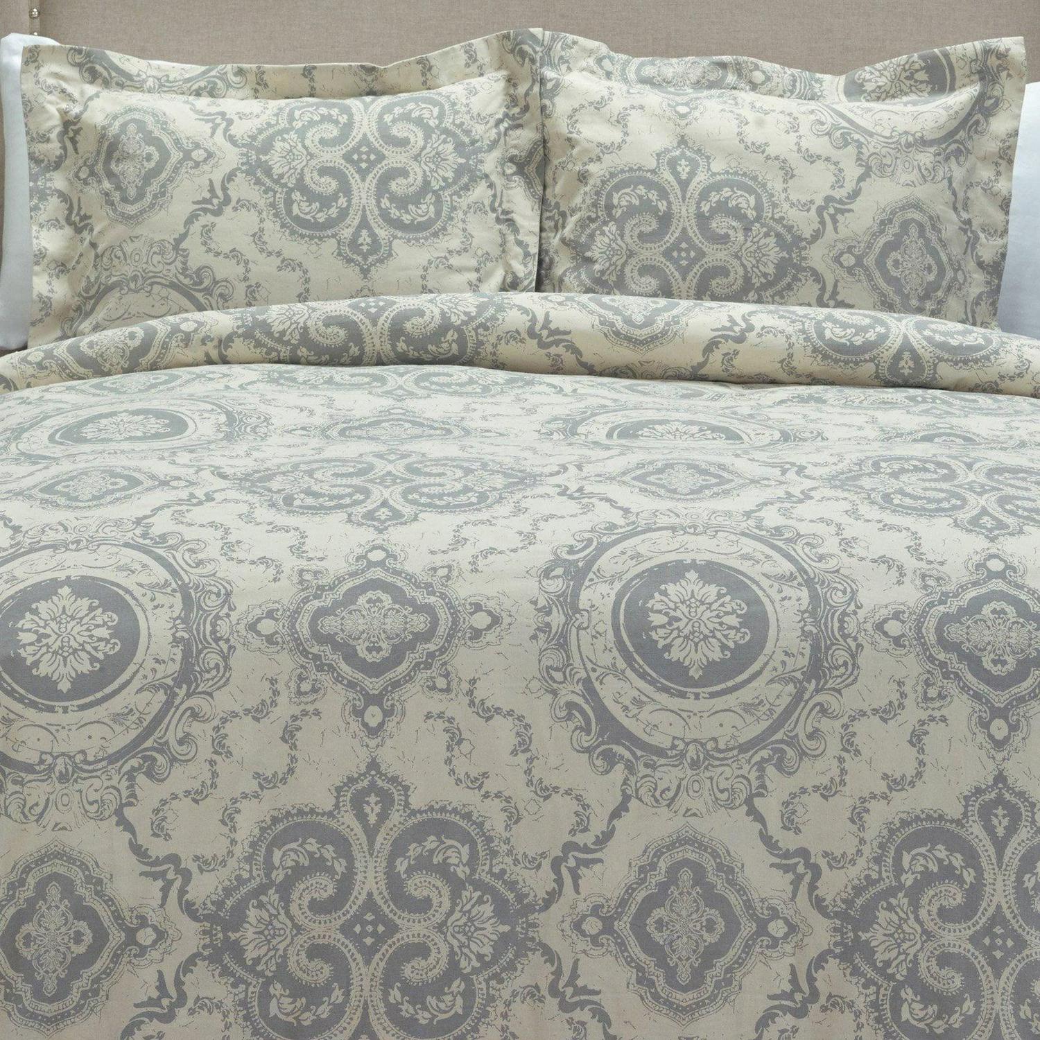 A classic Victorian garden medallion print interpreted on cotton with trellis inspired floral vinings gives an ethereal synergy to this wonderful throw -back pattern. Cotton flax give it a natural updated appeal. Solid double-flanged shams included in this three piece set make it a wonderful classic for a master or guest suite.