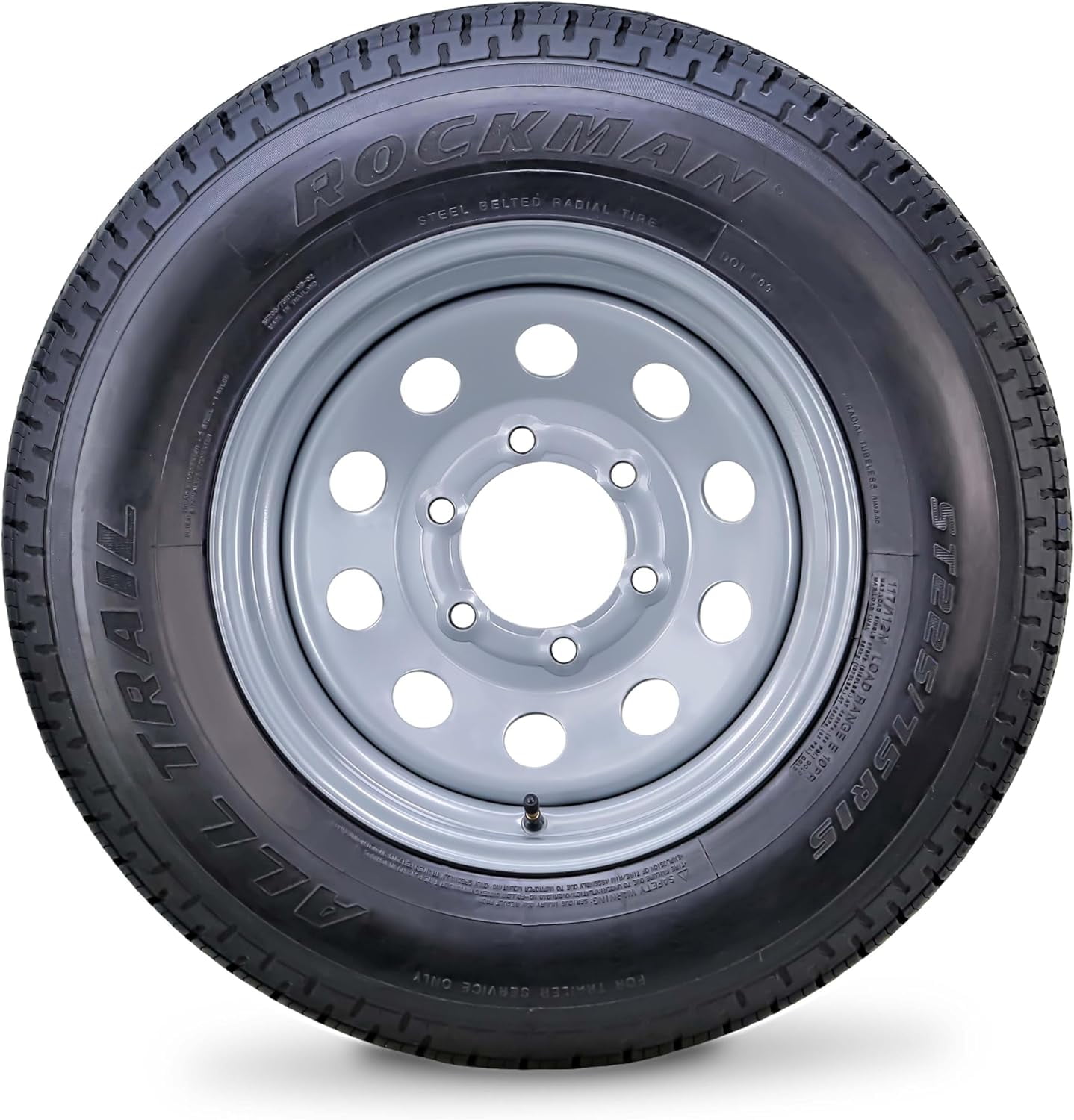 ROCKMAN Trailer Tire Wheel Assembly ST225/75R15 10-Ply E 117M 6 Lug on 5.5″ PCD Silver Mod Rim . DURABLE: 8mm deep tread depth vs 5.6 mm of other cheap competitors, durable and longer mileage life; PERFORMANCE: 10 ply rated, load range E. Load Index:117. Speed rating M–up to 75mph; WHEEL DETAIL: 6 Lug on 5.5″ bolt pattern, offset: 0, style: Silver Mod; SAFETY CERTIFIED: Meets or exceeds applicable DOT standards to provide dependable performance season after season for hauling cargo safely.; 0