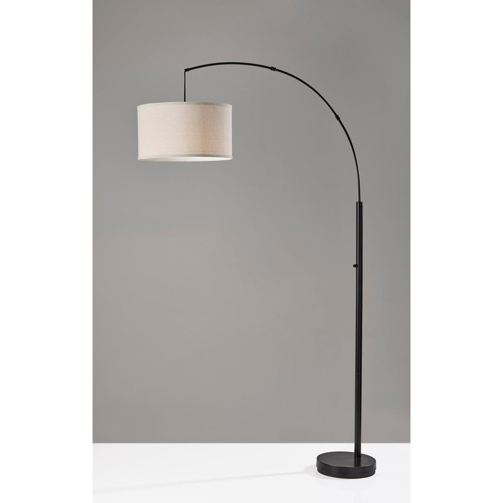 The Rockwell Arc Lamp pairs simplicity with modern styling to create an essential part of your home décor. An arching black pole holds a 16 round oatmeal linen shade with an elegant trim. Place this lamp next to the sofa or reading chair for a reliable and stylish source of decorative lighting. An easily accessible metal rotary switch turning the lamp on and off is located right on the tube.