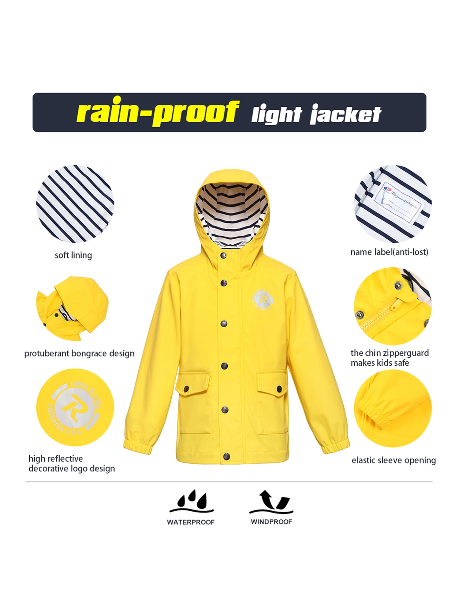 This Rokka&Rolla Boys’ Rain Jacket sizes 4-12 is a required essential for the rainy days. This boys’ rain jacket has a waterproof softshell fabric to keep you dry in any wet conditions. The rubberized fabric allows full stretch of mobility and comfort in this boys’ raincoat. The boys’ parka jacket is lightweight and breathable to improve performance in wind-like weather. Reflective logo at the front helps keep your kids safe.