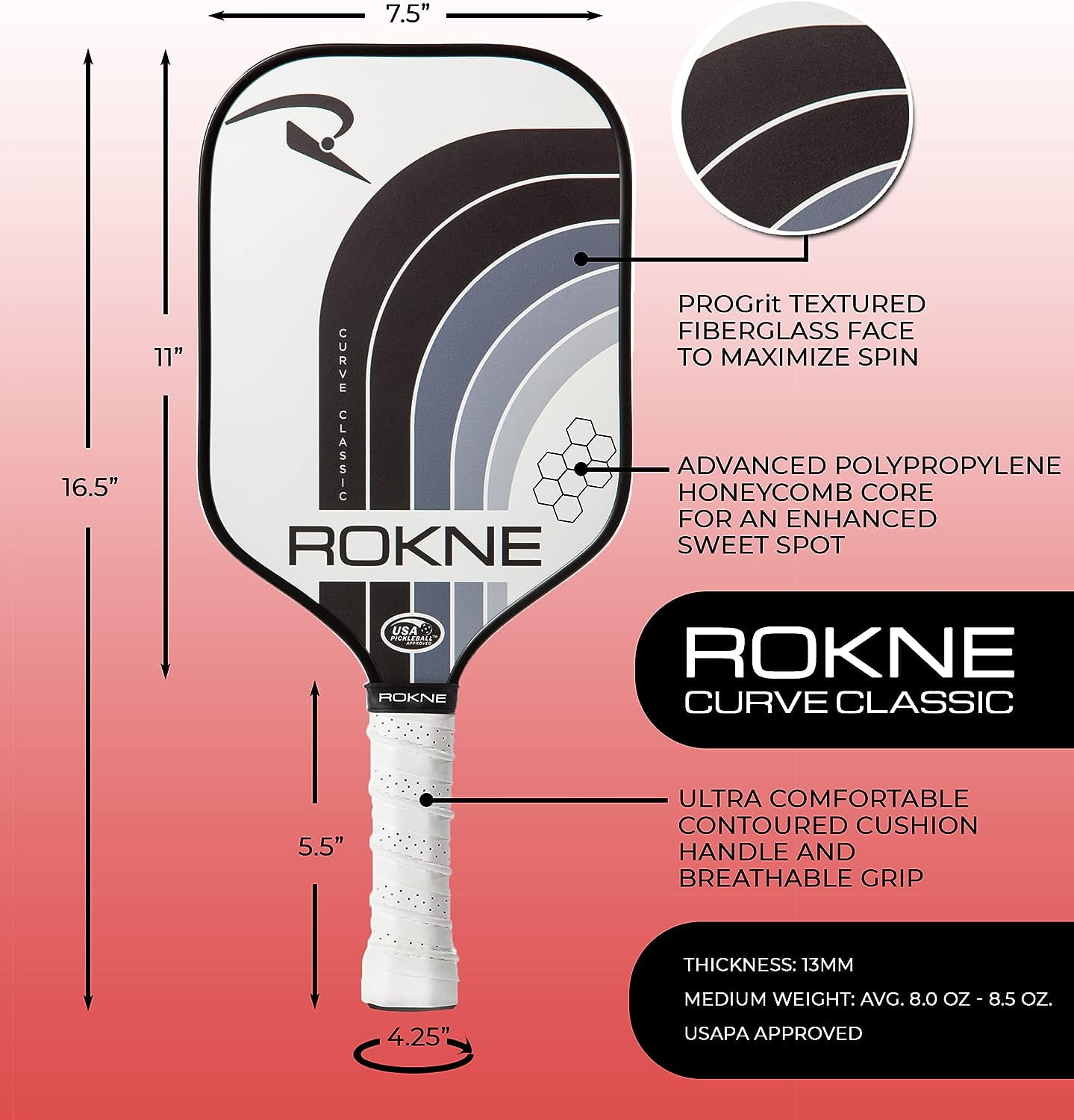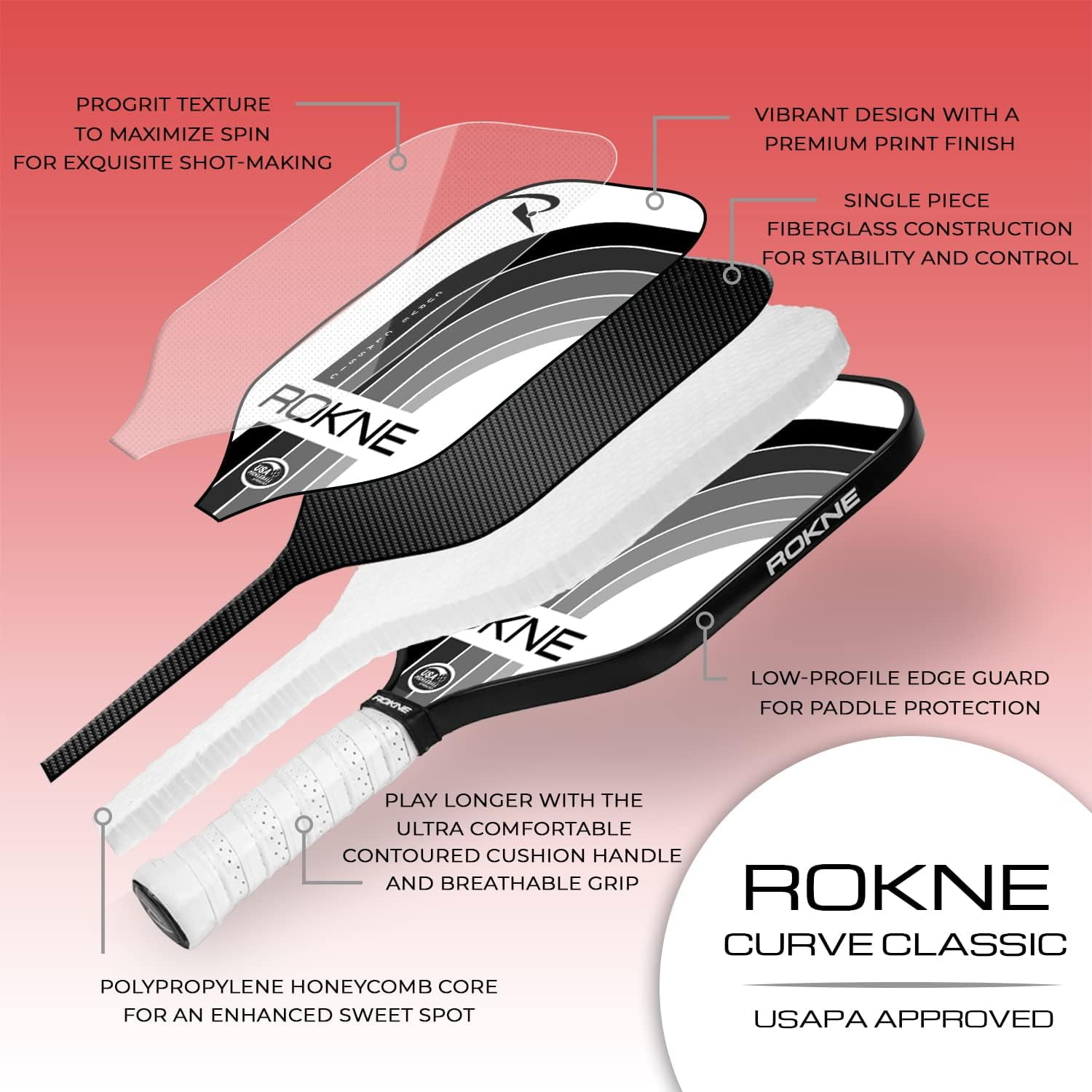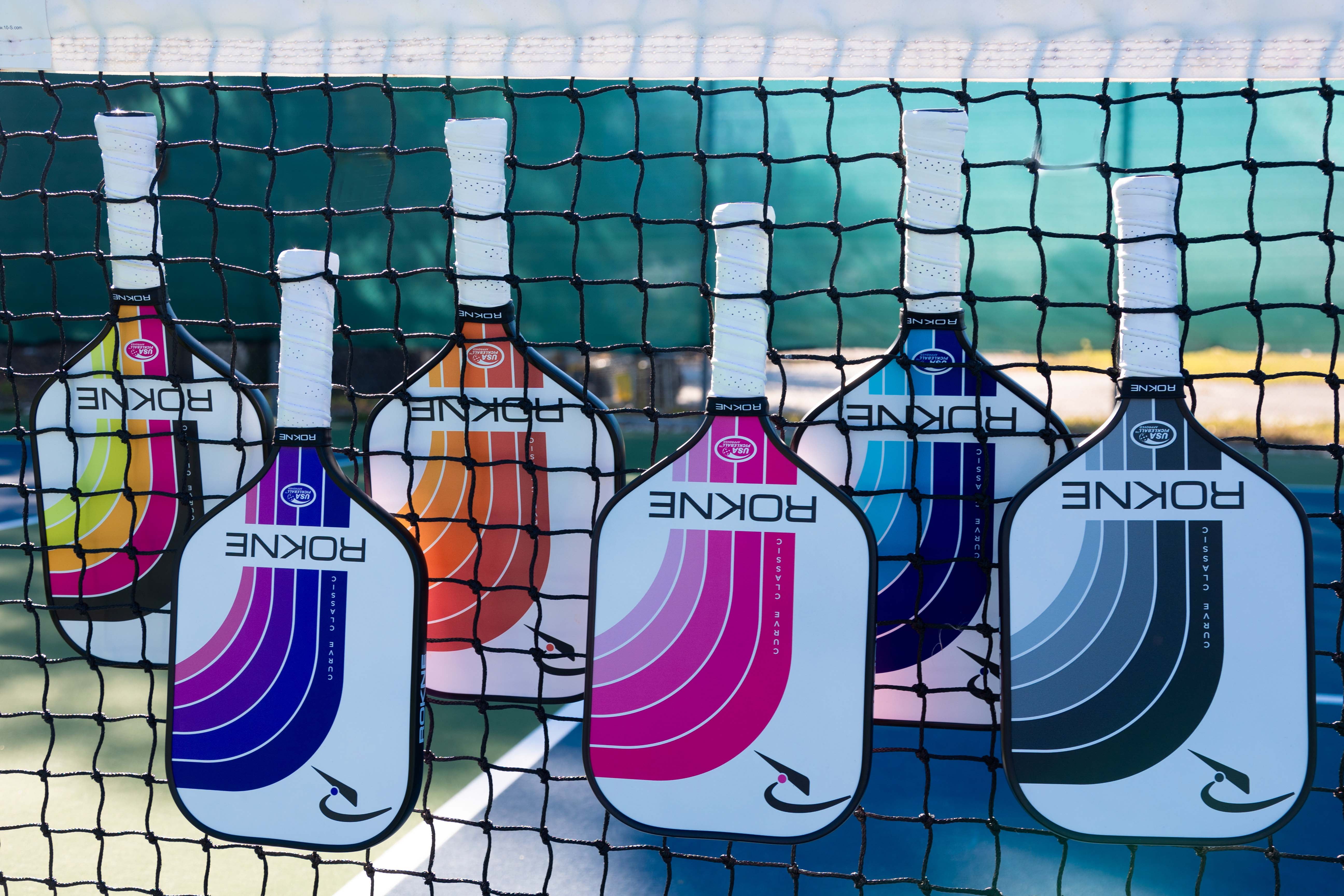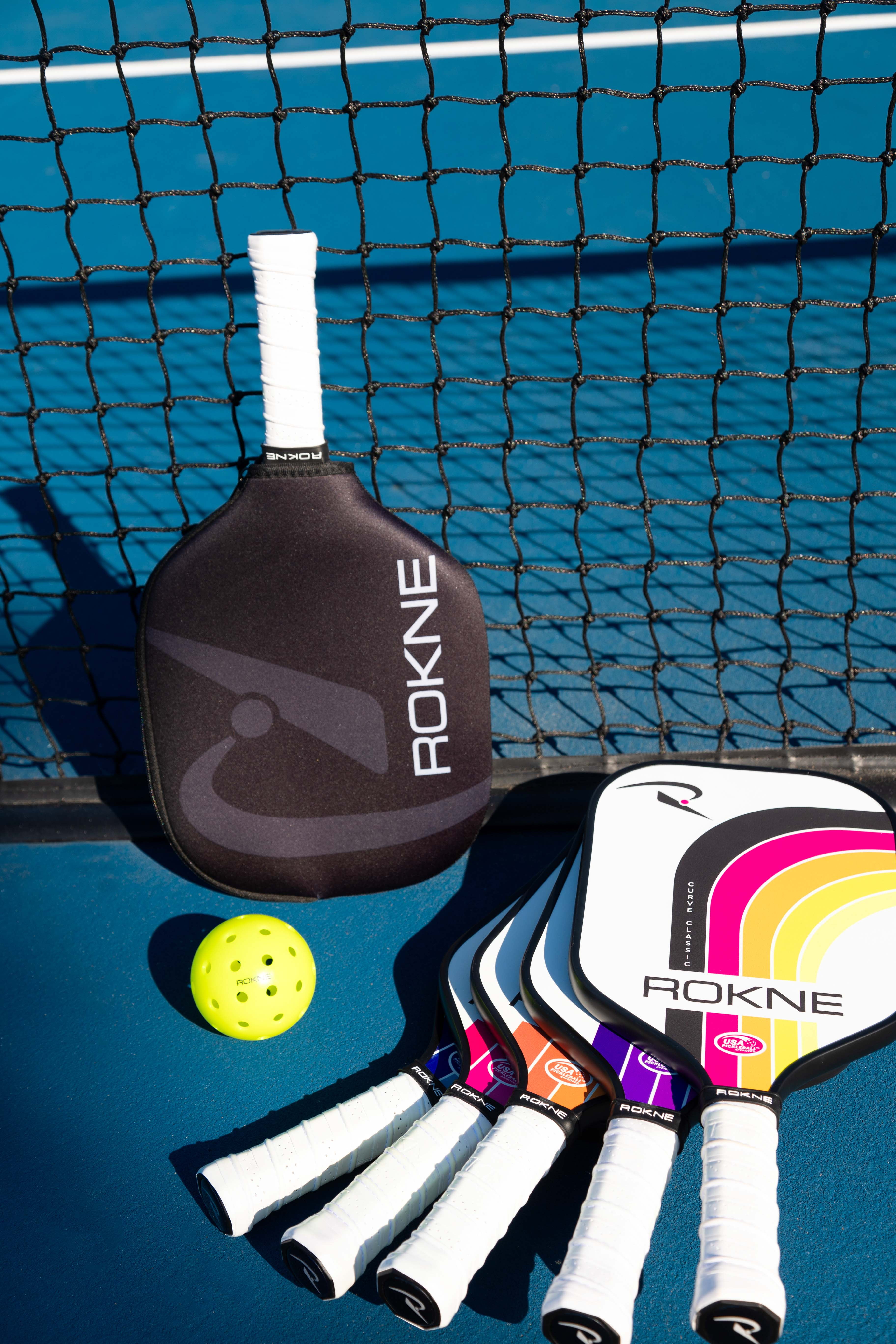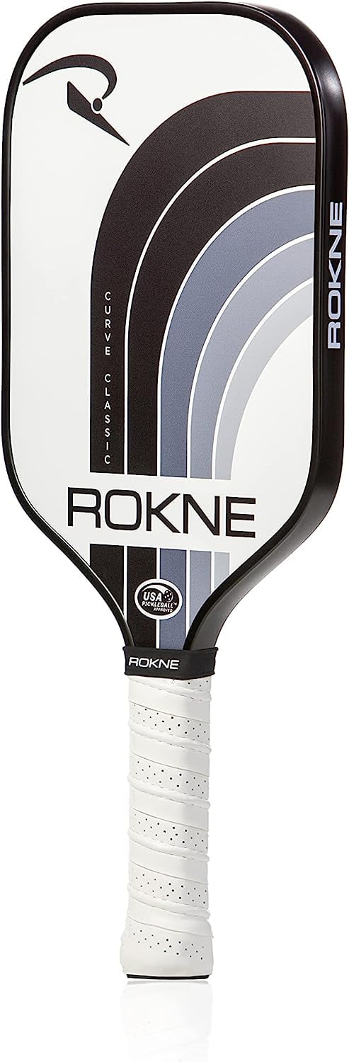 Clinch that match point with these pickleball paddles! Enhance your on-court skills with the Rokne classic pickleball paddle. This midweight quality paddle racket helps you maintain ball control with the perfect weight and balance built for speed and performance. Its ProGrit textured fiberglass pickleball racket face generates optimal spin for powerful and precise shots. The low profile edge guard provides ample paddle protection. The advanced polypropylene core and premium fiberglass face enhances the racket’s sweet spot so you can perform every ace, dink, volley, drive and lob like a professional. Without a question, this ranks high among the best pickle ball rackets of the sport! Stand out and serve with the Rokne Curve Carbon Fiber Pickleball Paddle! The unique 5.5” long contoured cushioned composite handle of this paddle supports one and two handed shots. Tennis players transitioning to pickleball will appreciate the extra grip space and tennis racquet handle shape. The medium 4.25″ grip circumference provides room for quick hand changes between volleys and dinks, while the soft grip limits stress on your hand and elbow so you can play longer with more accurate shots. Loaded with top technology and crafted from premium materials, the Rokne Curve Classic pickleball paddle is a fantastic recreational paddle. Its balanced and comfortable feel makes it suitable for indoor and outdoor play at all levels. This pickle ball paddle is available in vibrant color options set against a brilliant white background. The Rokne Curve Classic is USAPA approved for tournament play. The polypropylene honeycomb core technology enhances the pickleball paddle’s sweet spot and helps eliminate dreaded mishits. The rough textured fiberglass face generates optimal friction to ensure maximum spin for your best pickleball shots. Elevate your game in style with professional grade pickle-ball paddles. Order your Rokne Curve Carbon Fiber Pickleball Paddle today!