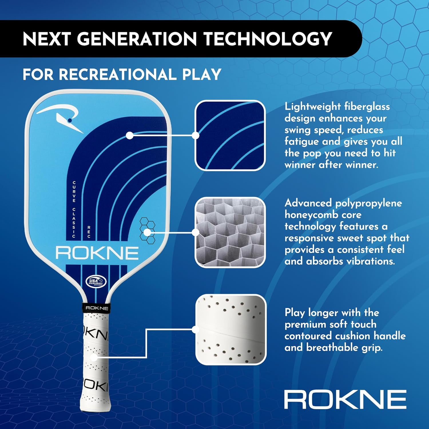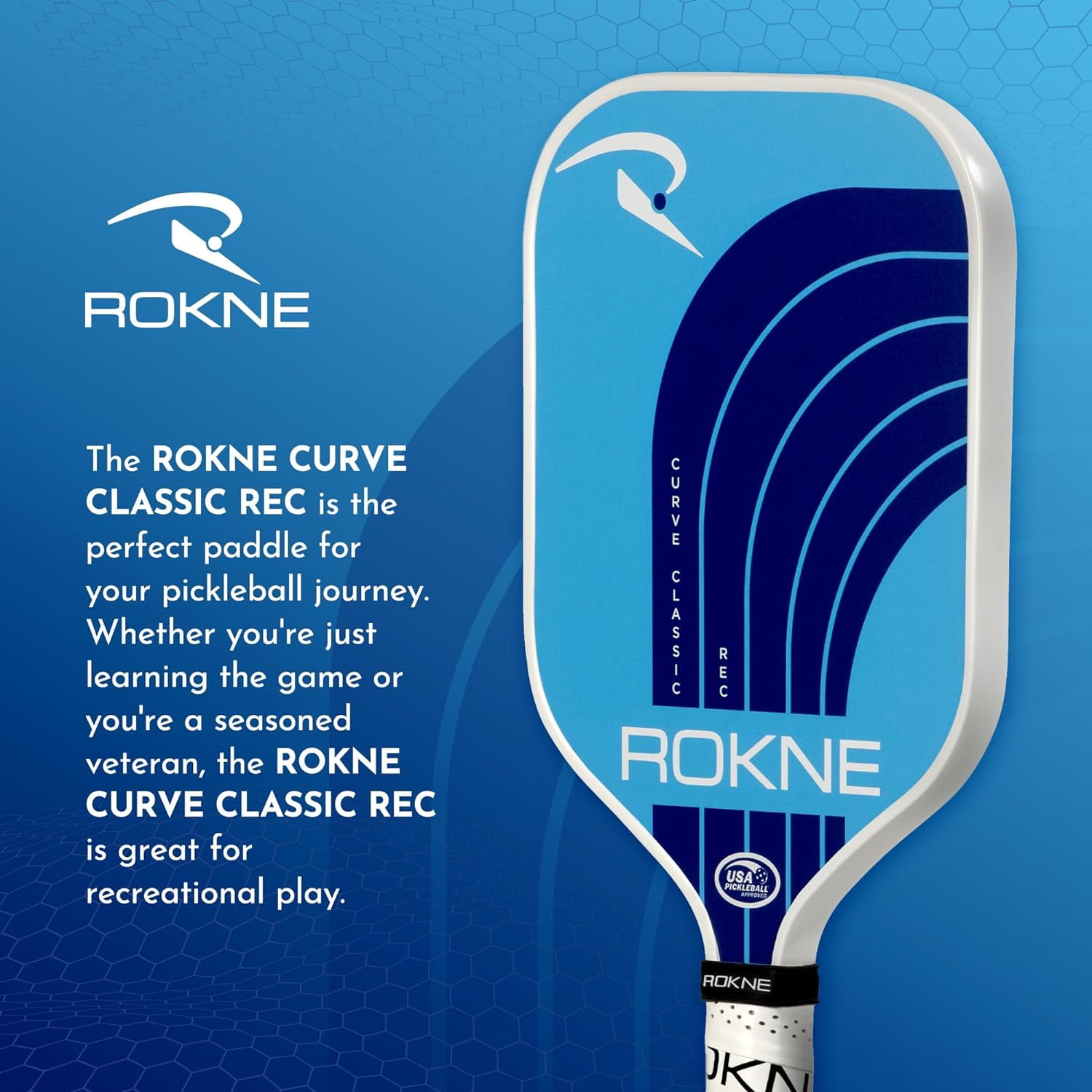 Curve classic REC pickleball paddle Lightweight fiberglass design enhances swing speed, reduces fatigue Advanced polypropylene core with for consistent sweet spot hits Contoured, breathable, and non-slippery soft touch cushioned grip USAPA approved for tournament play