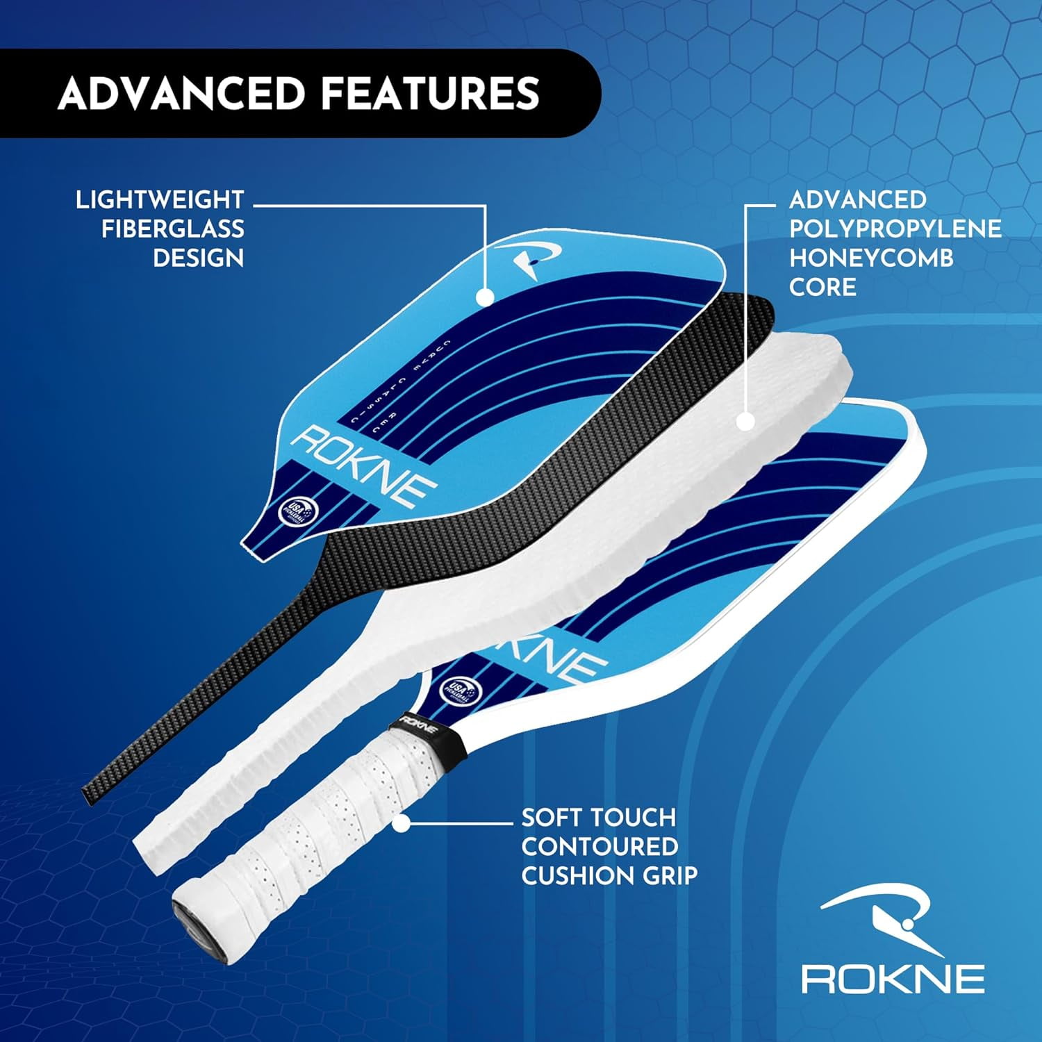 Experience unmatched maneuverability and control on the court with these pickleball paddles! The Curve Classic REC pickle ball paddle is one of the stellar additions to ROKNE’s Curve Classic lineup. This innovative lightweight paddle weighs in at an impressive 7.25 Oz – 7.5 Oz. With a generous width of 7.5”, it generates huge power without sacrificing precision. The advanced polypropylene core of this paddle ball racket ensures that each honeycomb cell has a consistent shape and size to create a large yet stable and responsive sweet spot. The fiberglass face enhances your ability to perform every ace, drive, and lob like a pro. Stand out and serve with the ROKNE Curve Classic REC Fiberglass Pickleball Paddle! The 5.5” handle of this pickleball racket optimizes one and two handed shots. Tennis players transitioning to pickleball will appreciate the extra grip space and handle shape. The medium 4.25″ grip circumference provides room for quick hand changes between volleys and dinks. It also has a soft touch, contoured cushion grip that limits the stress on your hand and elbow so you can play longer with more accurate shots. This paddle’s composition creates a solid and durable feel that rivals some of the best pickle ball rackets on the market. The tough yet balanced and comfortable feel it has makes this paddle suitable for both indoor and outdoor play at any level from beginner to intermediate and advanced. Our pickle ball paddle is USAPA approved for tournament play. The composition of this fiberglass paddle helps eliminate dreaded mishits. Its NanoGroove textured fiberglass surface texture heightens your swing speed, reduces fatigue, and provides the explosive pop necessary for consistently hitting those winning shots. Transform your game with one of the best pickle ball paddles in the court. Order your ROKNE Pickleball Curve Classic REC Pickleball Paddle today!