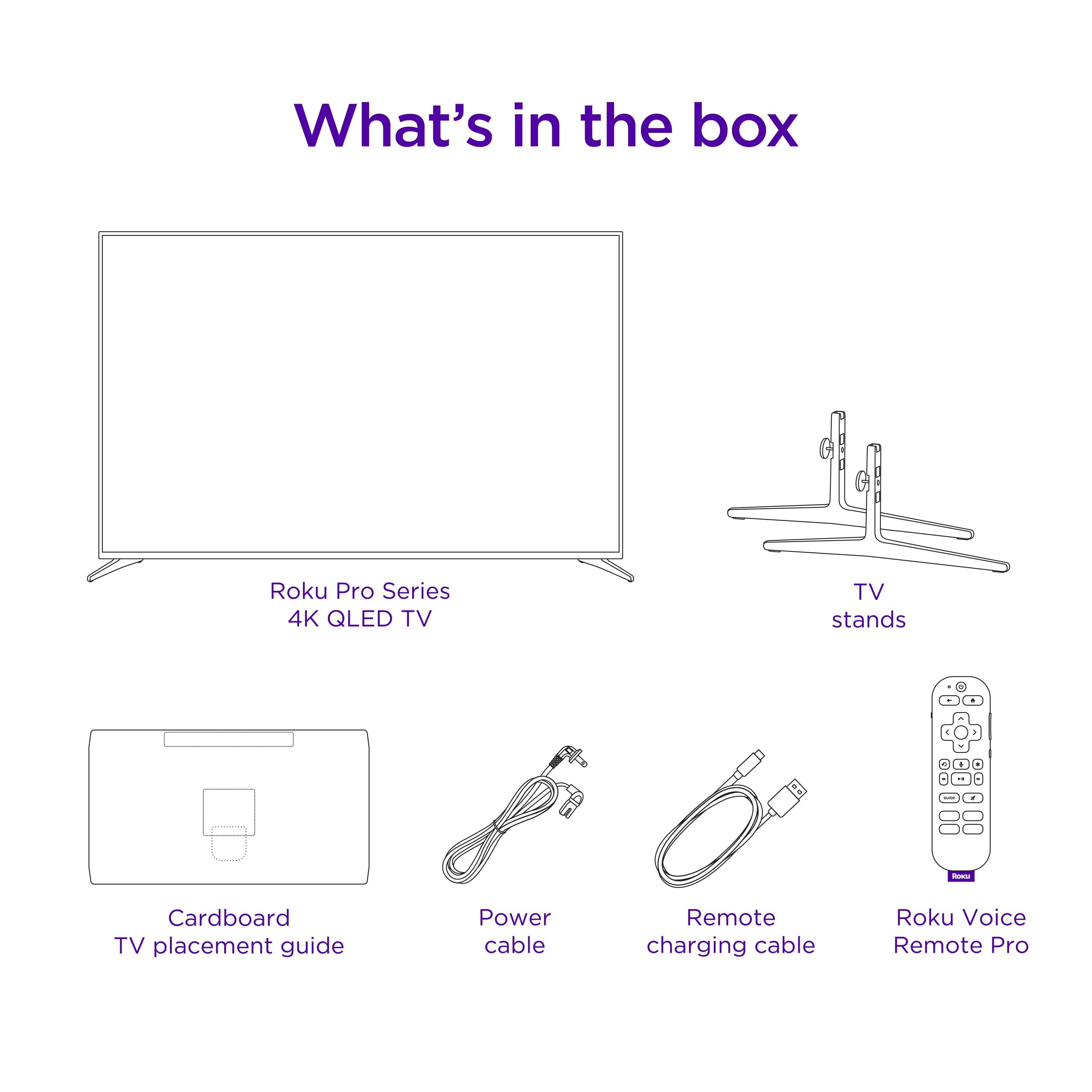 Elevate your entertainment: For TV buffs with taste—the Roku Pro Series TV is your centerpiece. Enjoy a powerfully simple streaming experience with brilliant 4K picture, immersive audio, and an elegant design. 55-Inch smart TV. Bright, colorful picture: Watch rich, accurate hues pop off the QLED screen. Movies, TV and games come to life in exceptional clarity with Dolby Vision IQ. Razor-sharp details: Dive into vivid highlights, deeper darks, and realistic depth with thousands of mini-LEDs that send light to the right places. Blistering speed: Follow the action with a blazing-fast 120Hz refresh rate—perfect for watching live sports and gaming. Picture, perfected: Powered by AI, Roku Smart Picture Max cleans up incoming TV signals, optimizes them for your TV, and automatically refines the color and sharpness for every show, sporting event, and even subtle scene changes. Game on: Automatic game mode drops you right in the action. Enjoy tear-free gaming with Freesync Premium Pro, ALLM, and VRR. A smarter remote: It’s fully rechargeable with hands-free voice controls and backlit buttons to help you find your way in the dark. Blends in with any room: With a minimalist design that sits flat against the wall when on our custom mount (sold separately), your TV is a centerpiece—even when it’s off. It’s also compatible with universal mounts. Immersive sound: Put yourself right in the action with rich Dolby Atmos audio. Surround yourself with room-filling sound thanks to new side-firing speakers. Home theater ready: Create the home theater of your dreams with easy wireless upgrades for immersive surround sound and heart-pounding bass when you pair Roku audio devices.