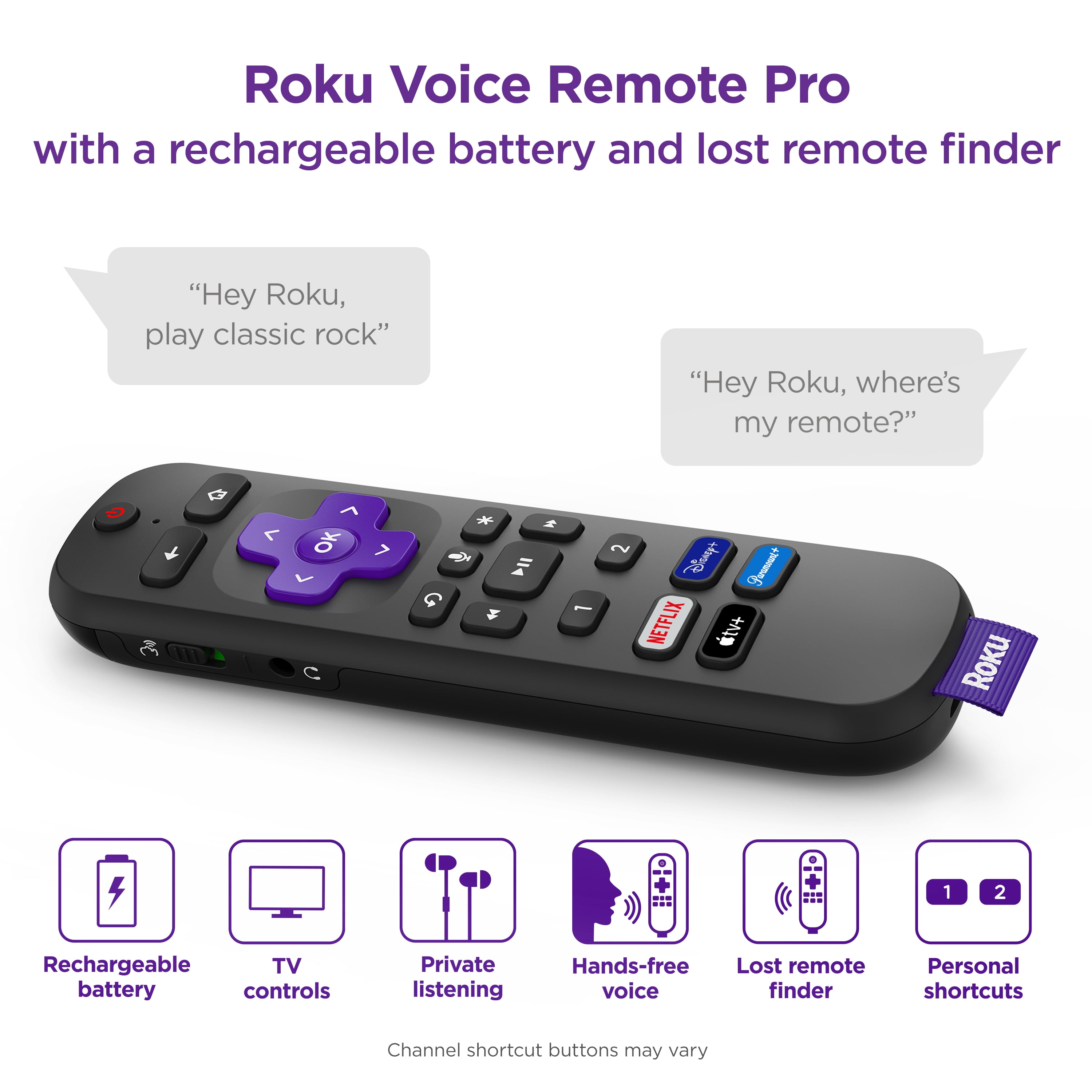 Hides behind your TV: The all-new design plugs right into your TV with a simple setup Super-fast startup: Plug it into your TV for a simple setup and start streaming channels like Disney+, HBO Max, Apple TV+, Netflix, Sling, and Hulu in a snap—just turn on your TV Long-range Wi-Fi: Enjoy fast, smooth TV streaming in any room with a strong Wi-Fi connection that’s great for streaming in the best picture quality Rechargeable voice remote: Keep your Roku Voice Remote Pro powered for months on a single charge so you can say goodbye to batteries Find your lost remote: Simply say “Hey Roku, where’s my remote?” and your Roku remote will play a sound Private listening: Plug your headphones into the Roku remote with headphone jack or use a wireless pair with the Roku mobile app to listen without disturbing a quiet house Hands-free voice controls: Say “Hey Roku” to find your lost remote, play entertainment, control your streaming, and power up your TV from across the couch Breathtaking picture: Stream in 4K, Dolby Vision, and HDR10+ with sharp resolution and vivid color Watch what you love: Upgrade your streaming with a massive selection of free, live, and premium TV, including Roku Originals and 350+ Live TV channels for free on The Roku Channel Works with popular voice assistants: Enjoy easy voice control with Siri, Alexa and Google Assistant