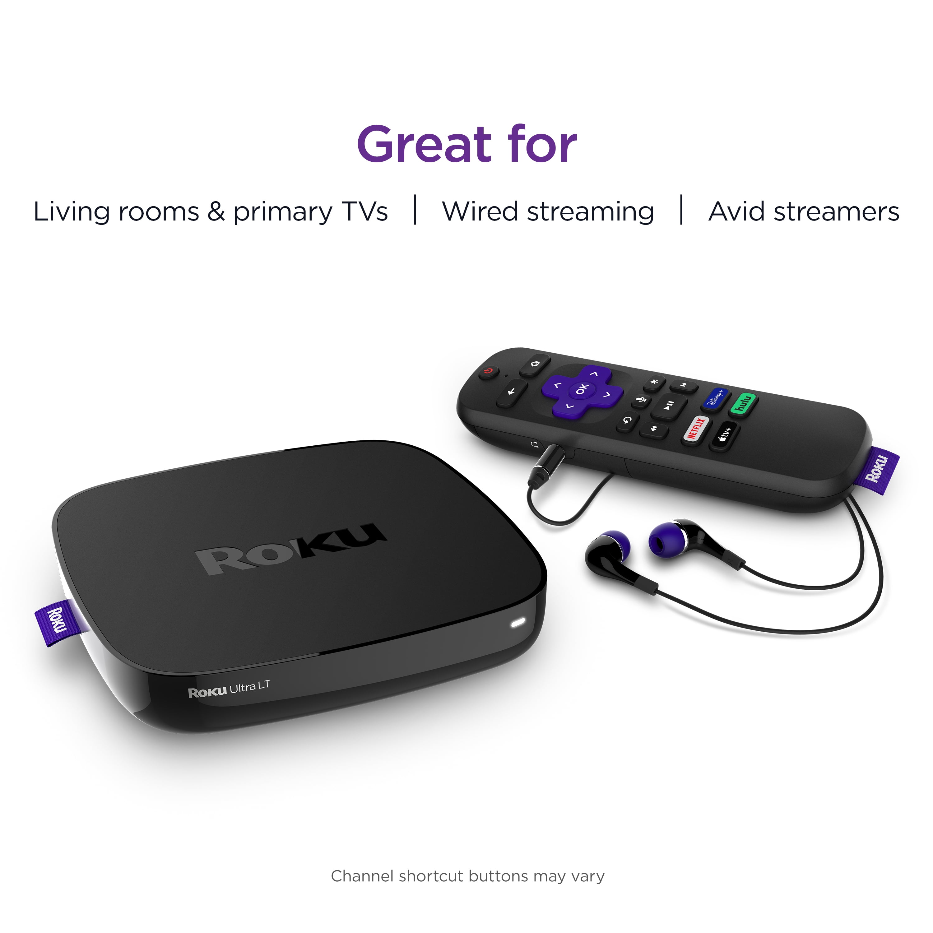 Power-packed player: Roku Ultra LT has a quad-core processor ready for all-day streaming in HD, 4K, and HDR picture, the kind of performance you want for your main TV Smooth streaming: Get a connection that stands up to whatever you want to stream with dual-band Wi-Fi® or use the Ethernet port for wired streaming Brilliant picture quality: Experience your favorites in eye-popping HD, 4K, or HDR picture with amazing color and clarity that is optimized for your TV No more juggling remotes: Power up your TV, adjust the volume, and control your streaming device with one remote Voice search & control: Quickly search, play entertainment, and control your streaming device with the voice remote Private listening: Plug the included headphones into your Roku remote or use a wireless pair with the Roku mobile app to listen without disturbing the house Endless entertainment: Stream what you love with a massive selection of free, live, and premium TV, including award-winning Roku® Originals and 200+ live TV channels on The Roku Channel Automatic software updates: Get the most up-to-date software including all the latest features and available channels without even thinking about it